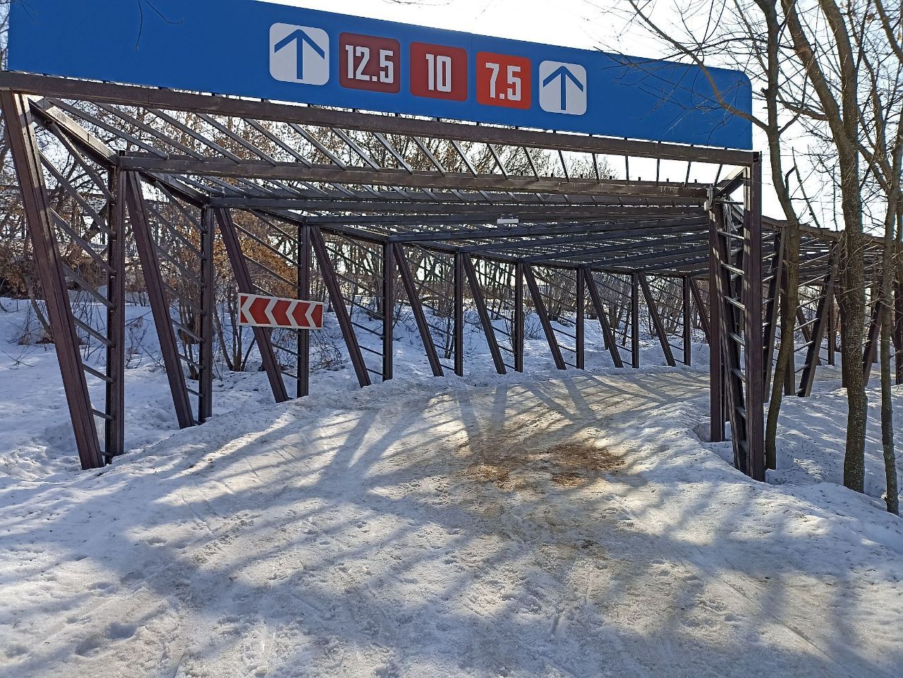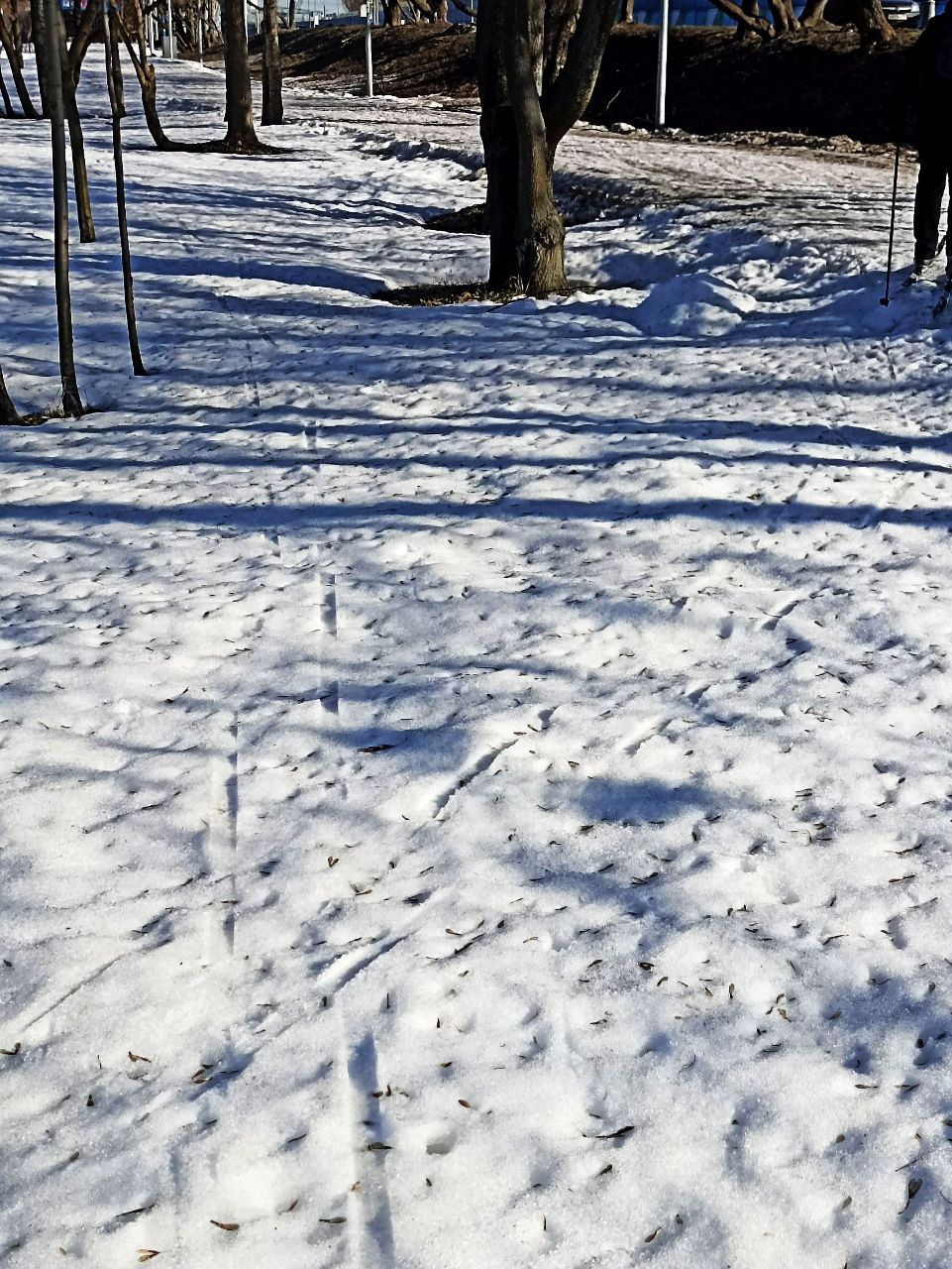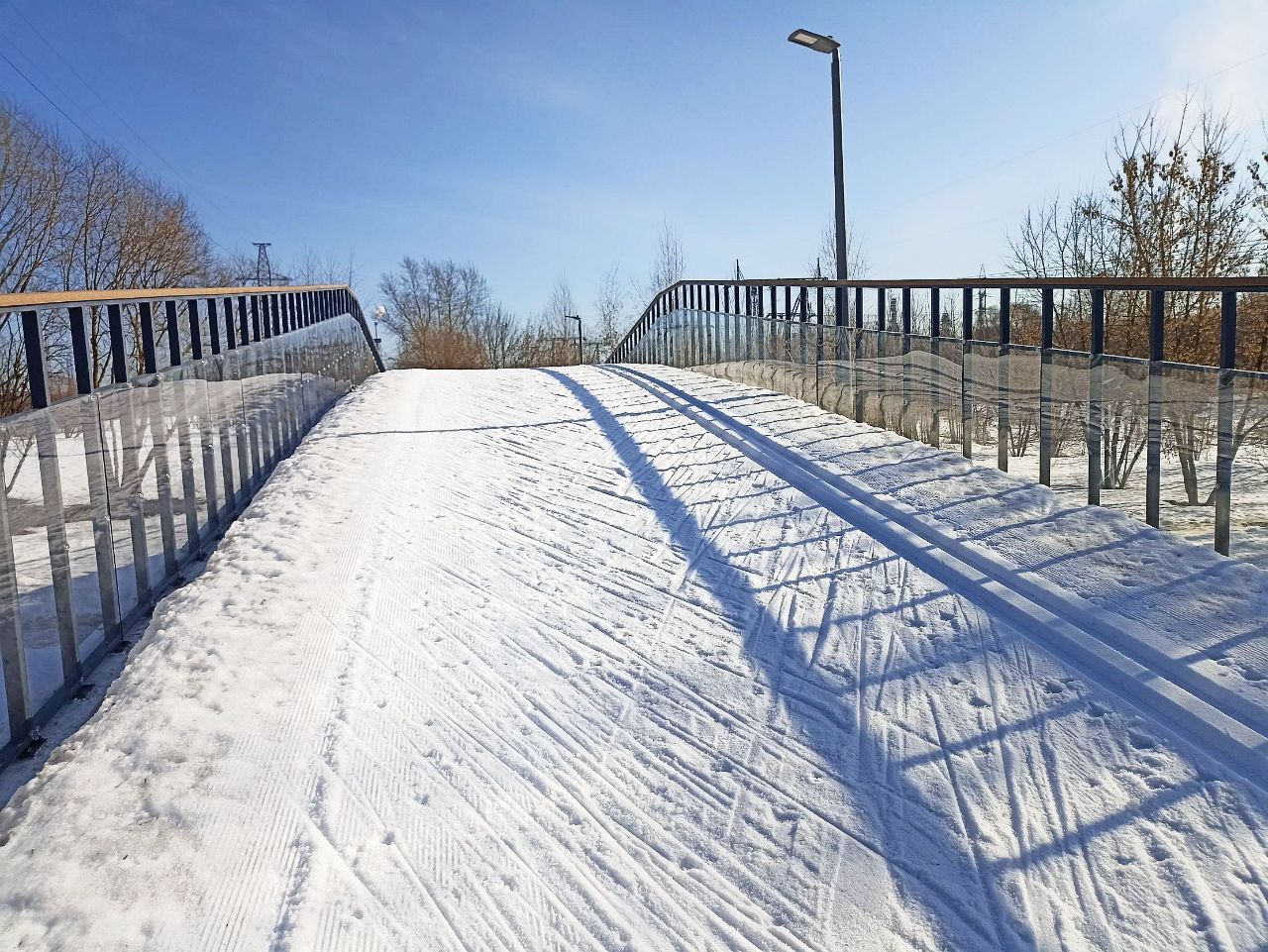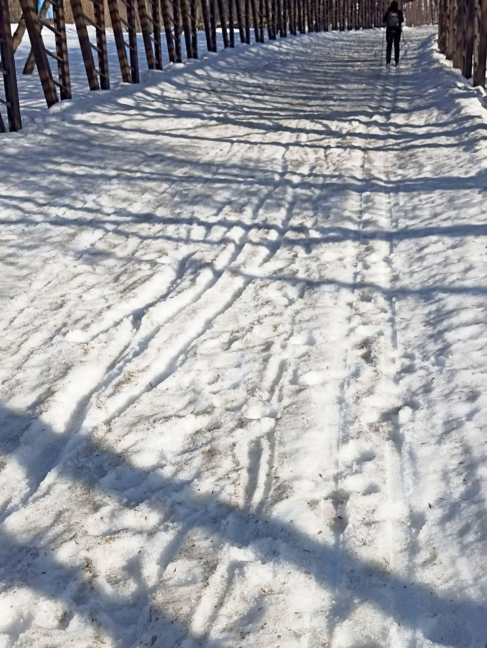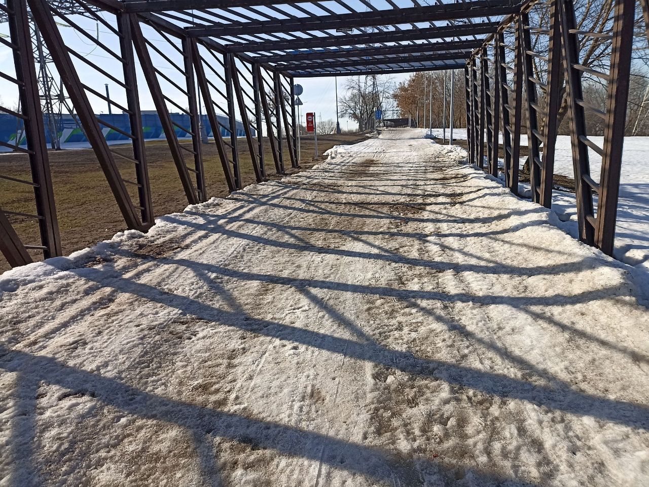 На последнем мостике перед стадионом на самом верху справа на лыжне оттаял кусок грязи/земли, убрать бы его и снегом присыпать.