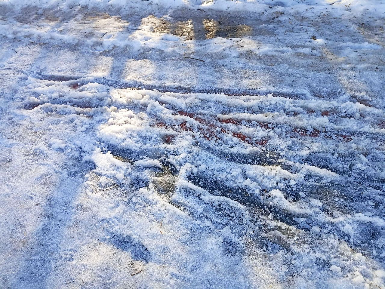 На коньковой части замёрзшая каша от пешеходов.