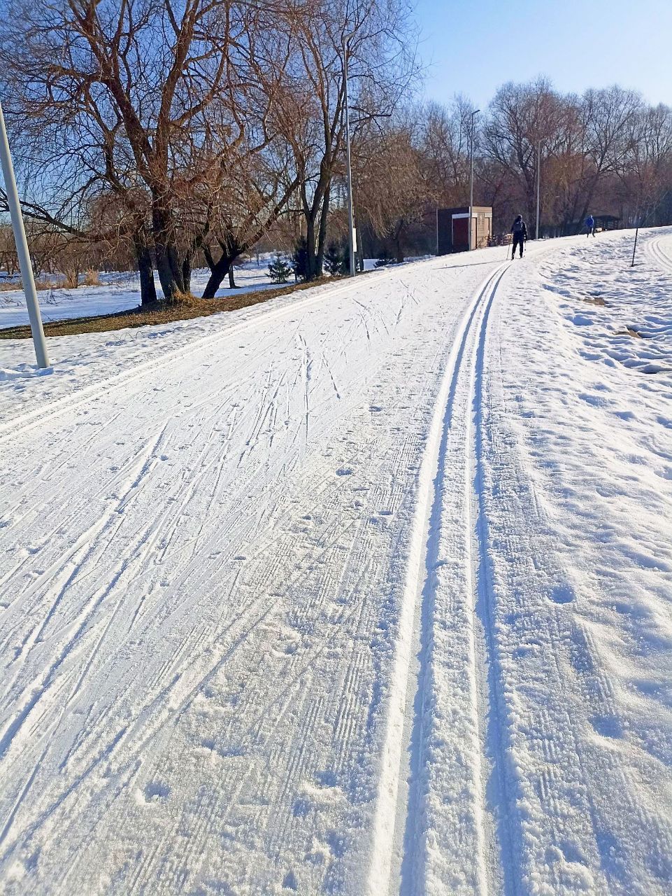 Вдоль дороги левая лыжня -- супер. Под горку несёт.