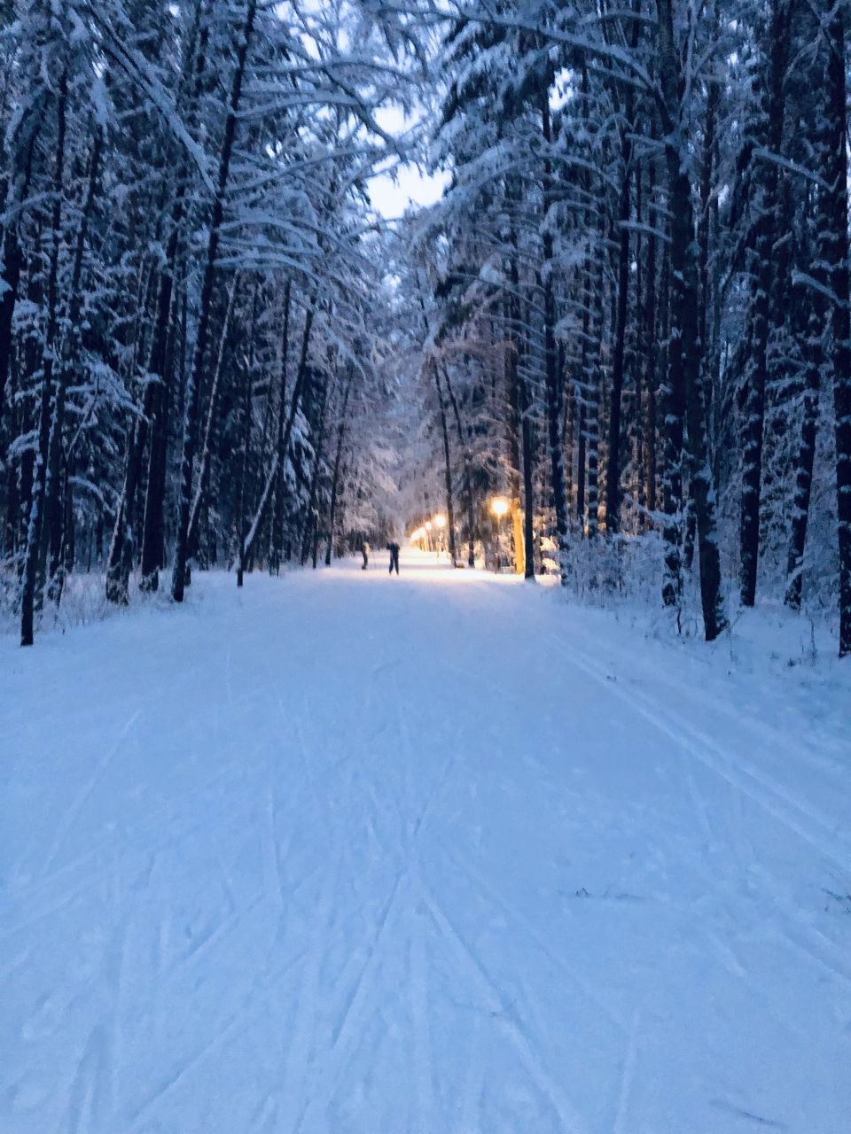 Катался с 8:30 до 11. Не идеально, а гораздо лучше, чем идеально🤣. Свежий вельвет, который ратрак укатывает прямо перед тобой. Но и где он еще не успел укатать сегодня, накатано достаточно широко, и даже не понятно, где едет лучше). Можно на боевых лыжах, палки до асфальта не достают уже нигде. Надел фонарь, но он был не нужен - освещенка очень много где
