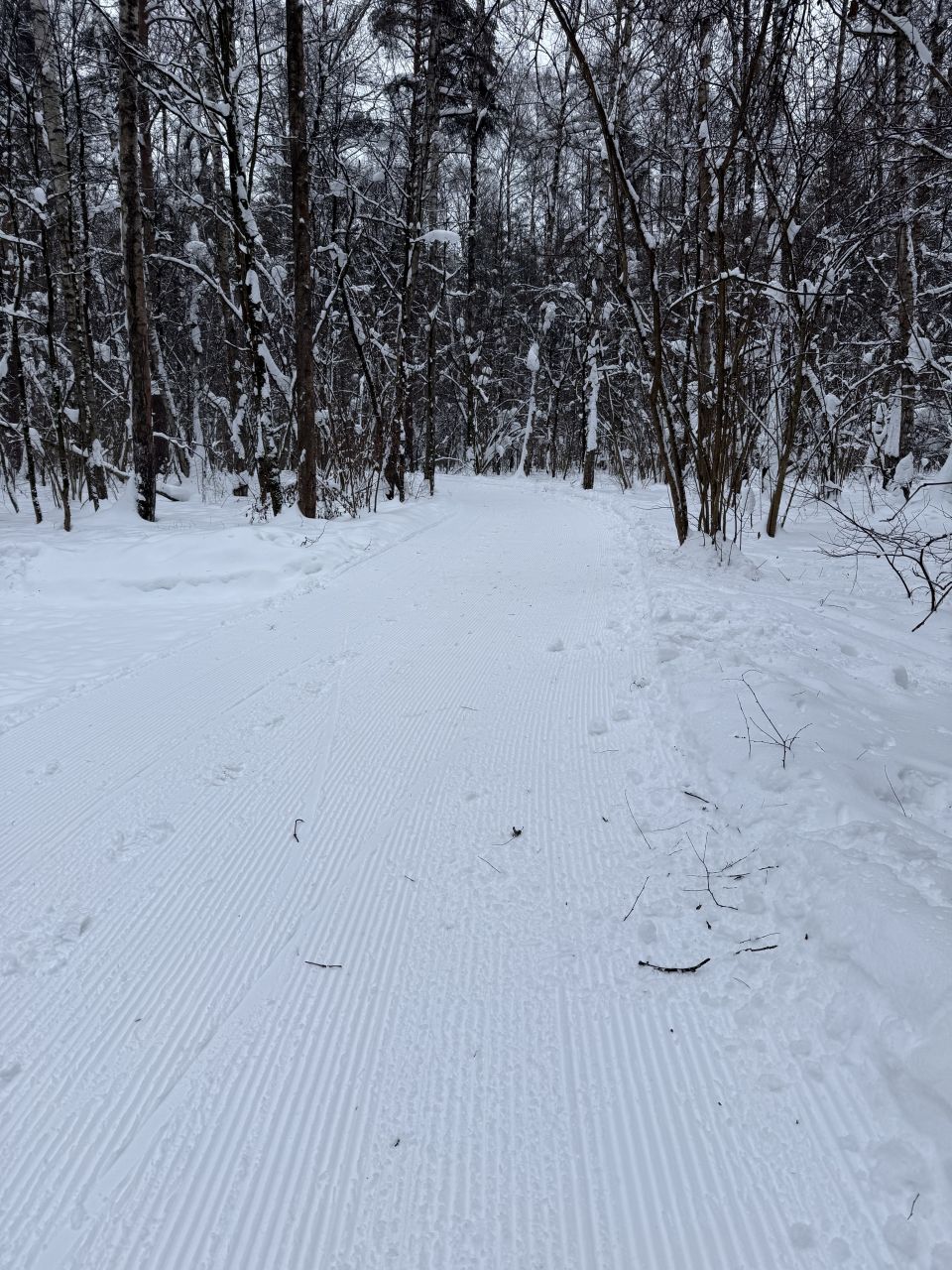 катал с 12.02.26 с 17 до 18. застал ратрак и даже ехал за ним. снег шел и шел. одной проходки было недостаточно для техники. лыжи проваливаются. На малых просеках от церкви не было техники от слова совсем. Катит тяжко.