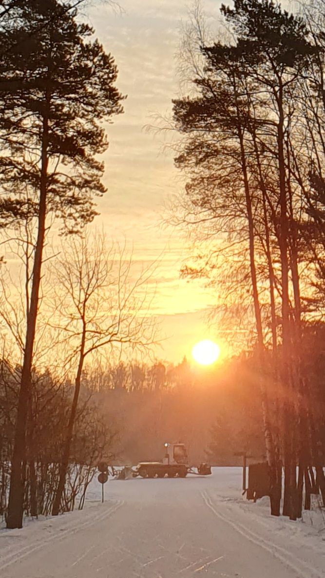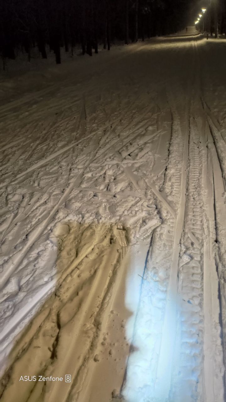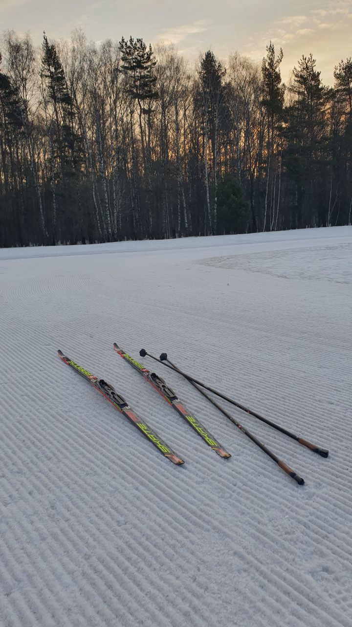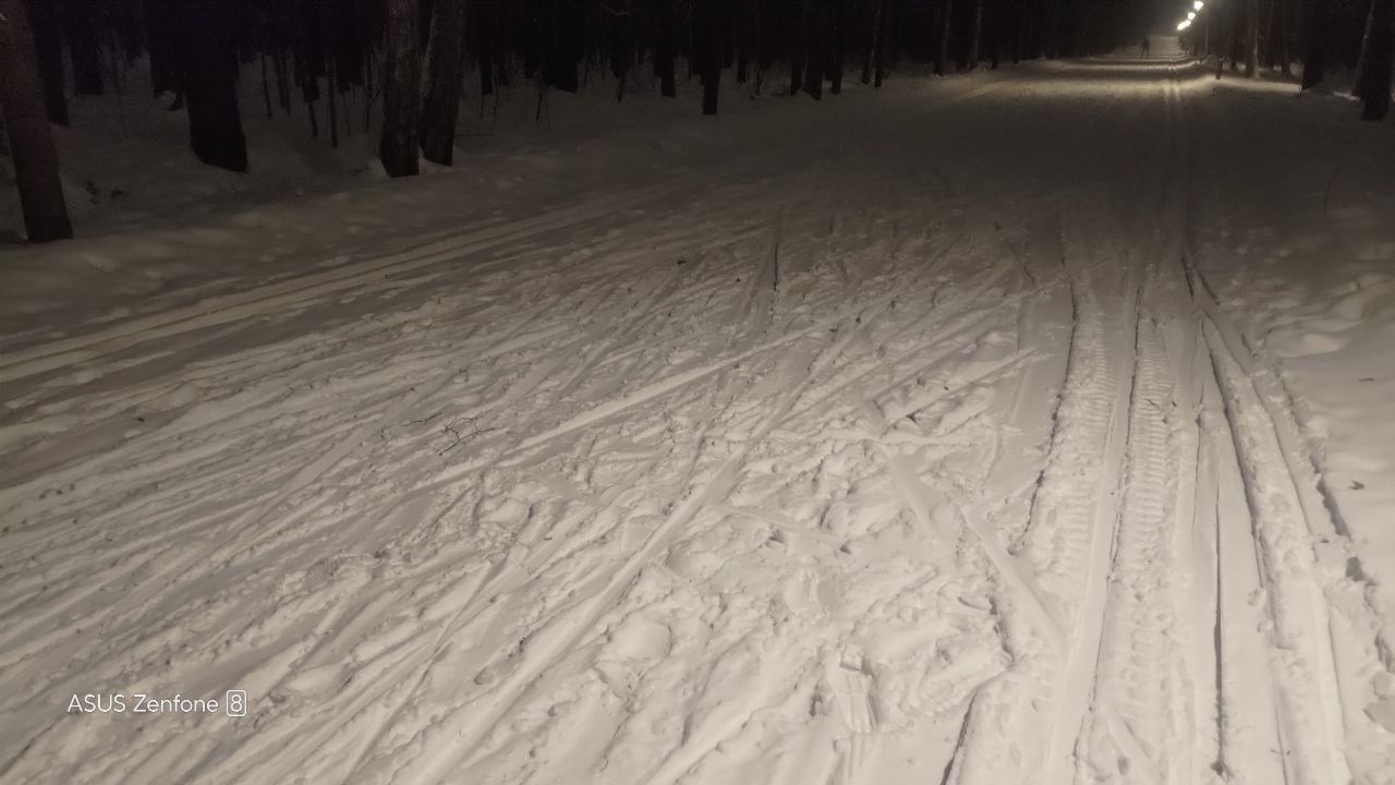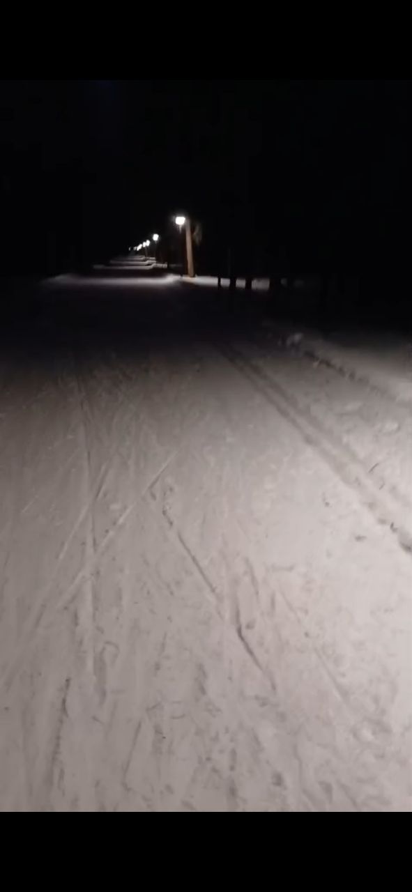 Катался с 8:30 до 11. Не идеально, а гораздо лучше, чем идеально🤣. Свежий вельвет, который ратрак укатывает прямо перед тобой. Но и где он еще не успел укатать сегодня, накатано достаточно широко, и даже не понятно, где едет лучше). Можно на боевых лыжах, палки до асфальта не достают уже нигде. Надел фонарь, но он был не нужен - освещенка очень много где