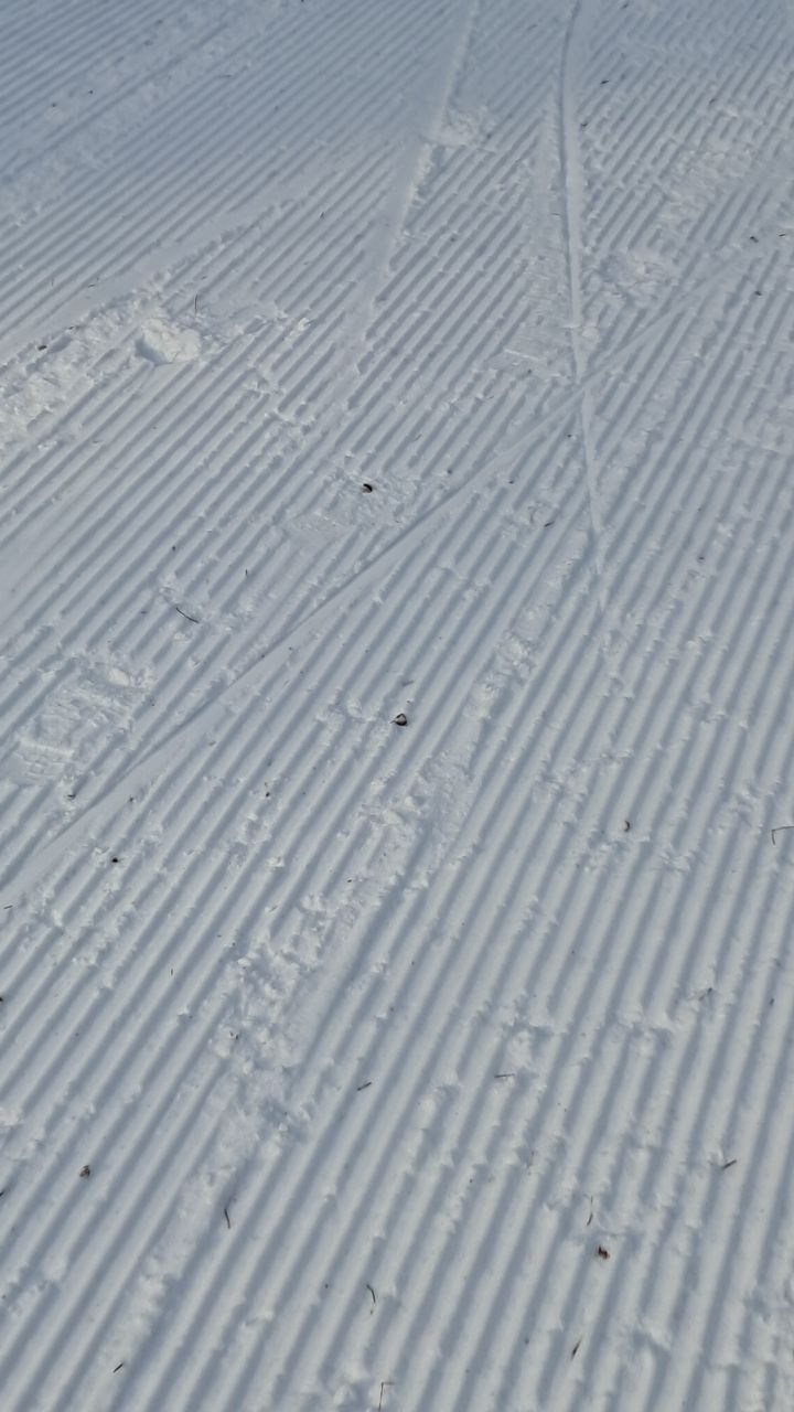 С 07.00 до 09.00 отлично. Ратрак сделал своё дело. Скольжение с ветерком. На роллерке серый снег, но катить можно. Смотрите под ноги, чтобы не словить стоп-кран. На фото состояние в 09.40. Чуть помягче, но шикарно.
