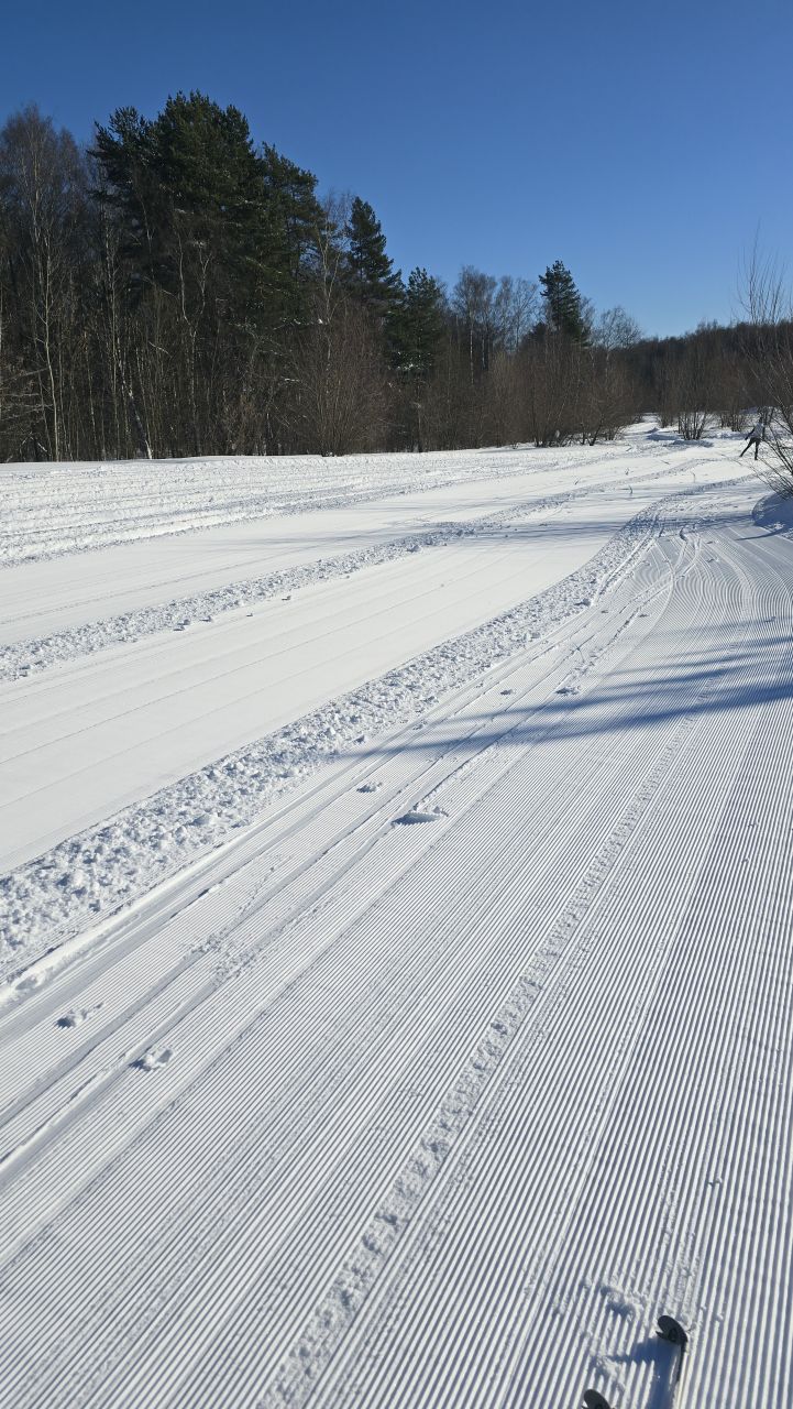 Песня 2026 Лучшее катание за эту зиму Начал в 8.30 Я так понял ратрак уже прошел и поэтому был вельвет и отличное скольжение Получил огромное удовольствие Грязь и иголки - отсутствовали. 15 км пролетели незаметно