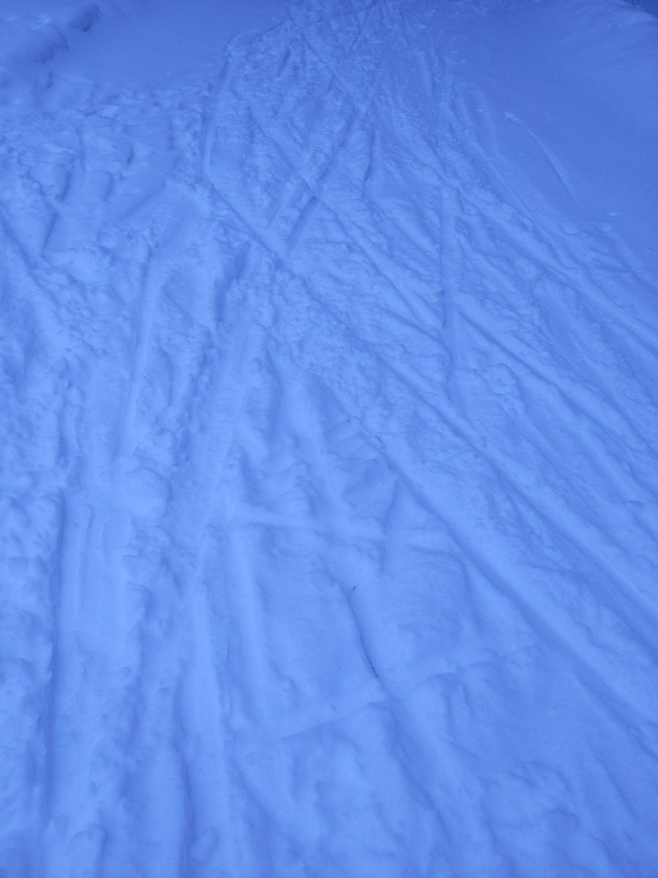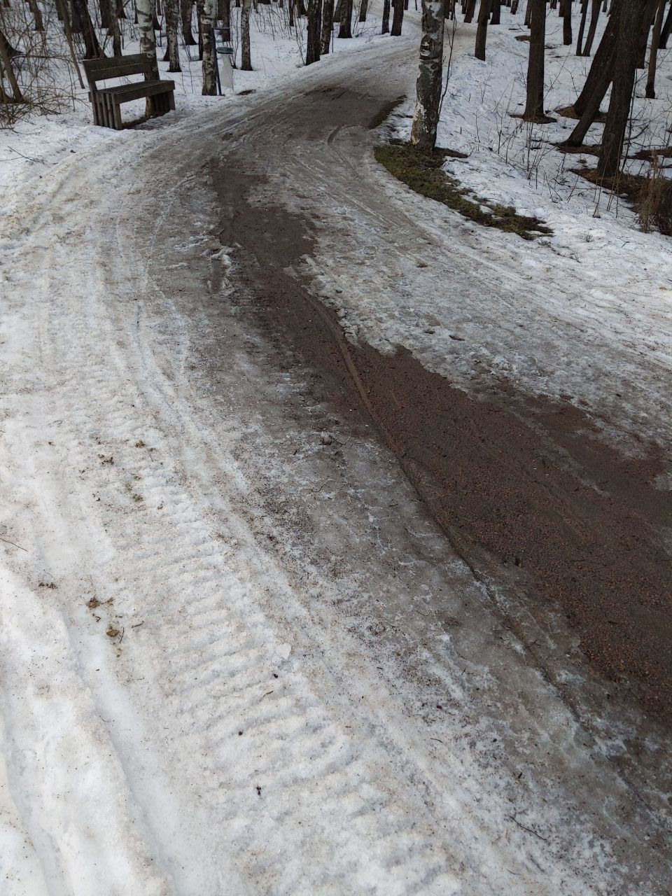 Если без лирики, то участки без разрывов остались только по прямой от Devi Club до парковки у яблоневого сада (правда, там половина пути уже по воде) и на неосвещаемых центральных просеках, но до них ещё нужно добраться, то есть скорее дойти, чем доехать. В остальных местах везде очень грязно, много проталин, поверхность изуродована следами от колесного транспорта разной ширины… Поймать стоп-кран - как нечего делать…