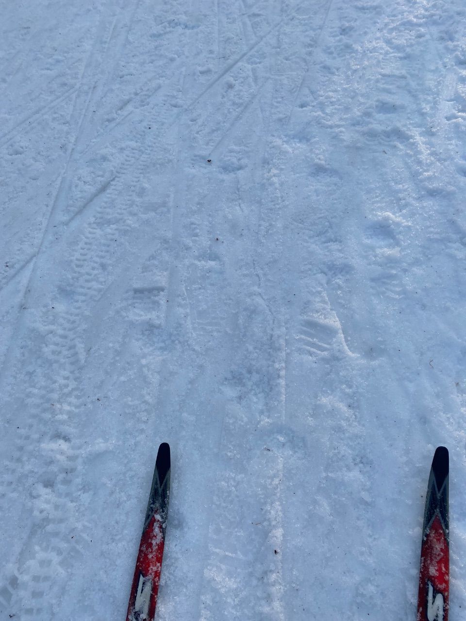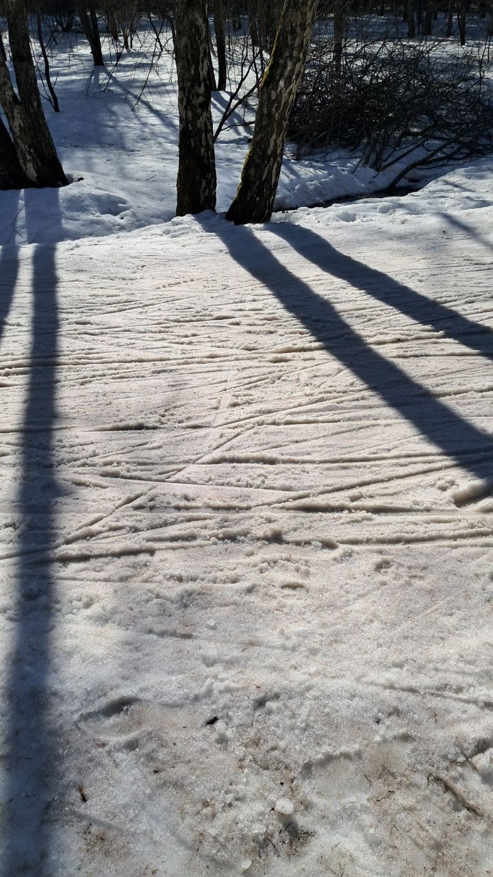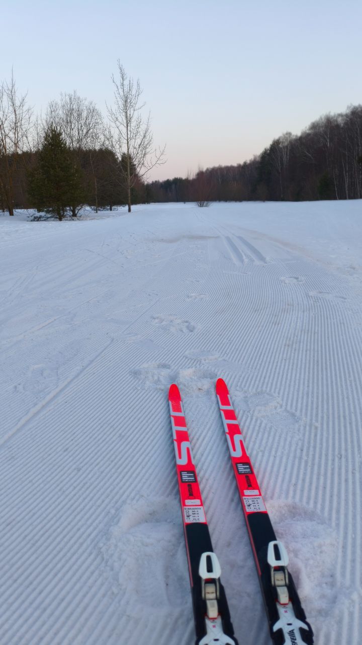 Сегодня было отлично с 7 утра до 8.15 идеально. Да, грязно, местами проталины, но все равно быстро. Самый чистый снег - яблоневый сад, но там в двух местах надо снимать лыжи, что в принципе норм, как раз есть время отдышаться от восторга)) завтра можно еще зацепить, но пожалуй это будет последний день.
