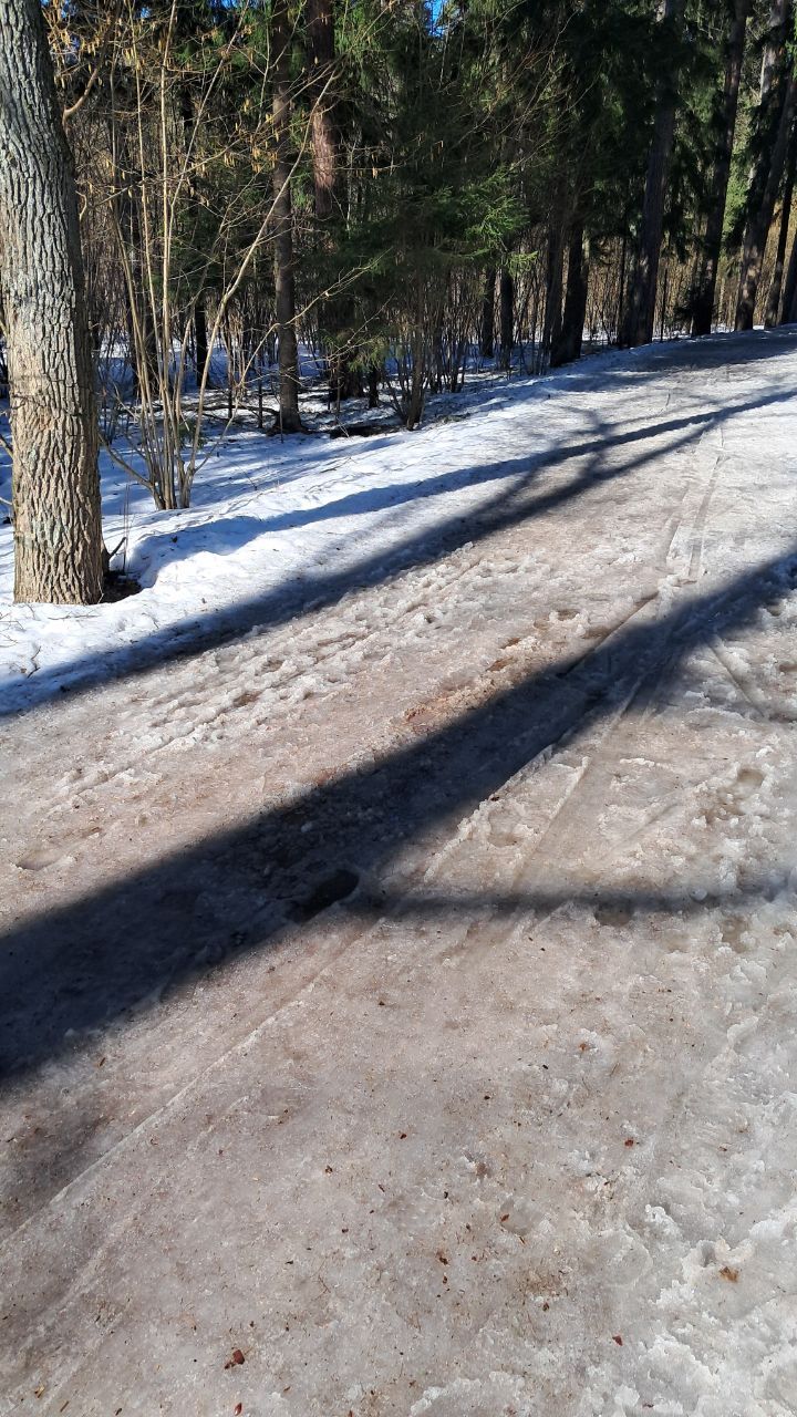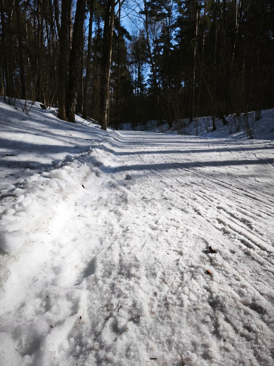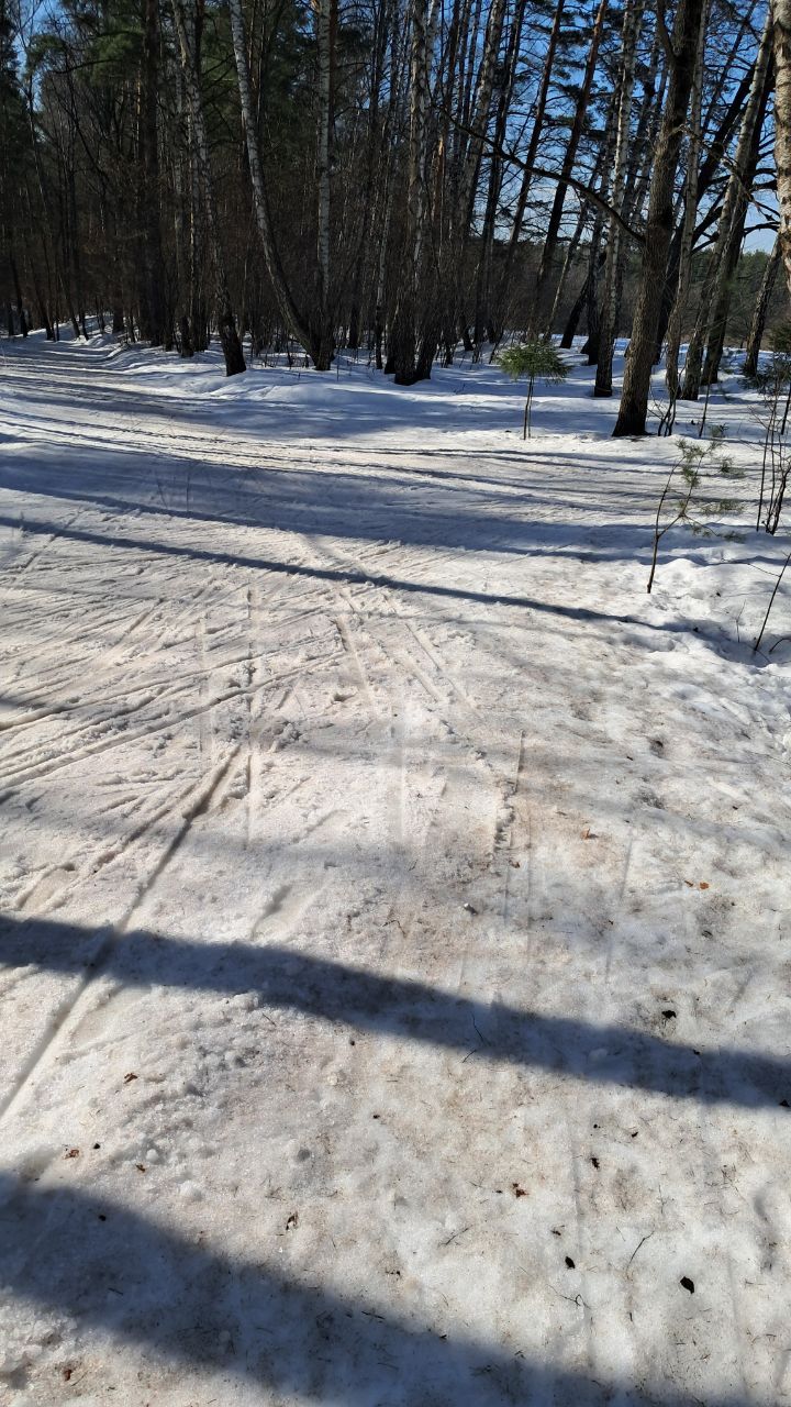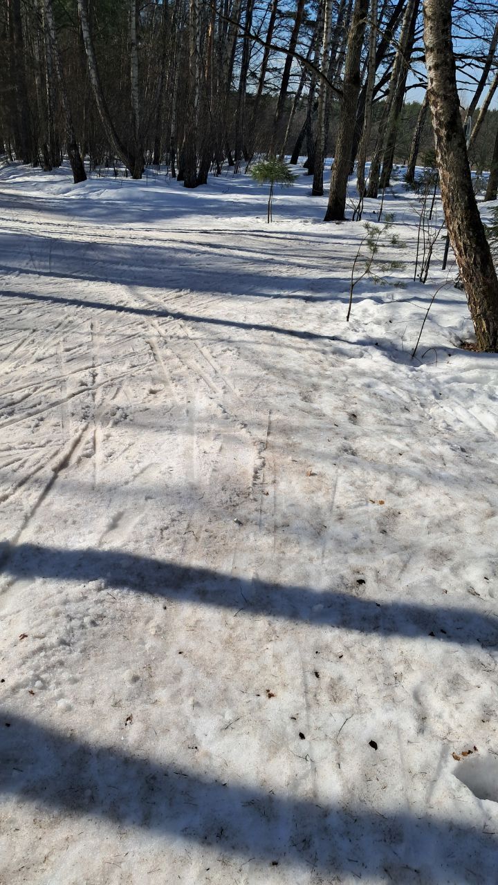 Трасса в хорошем состоянии. В садах уже снежная каша, а в лесу плотный снег. Но под соснами уже много иголочек и шишек.