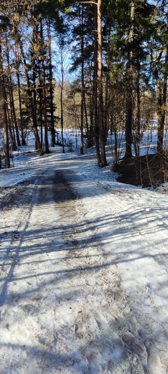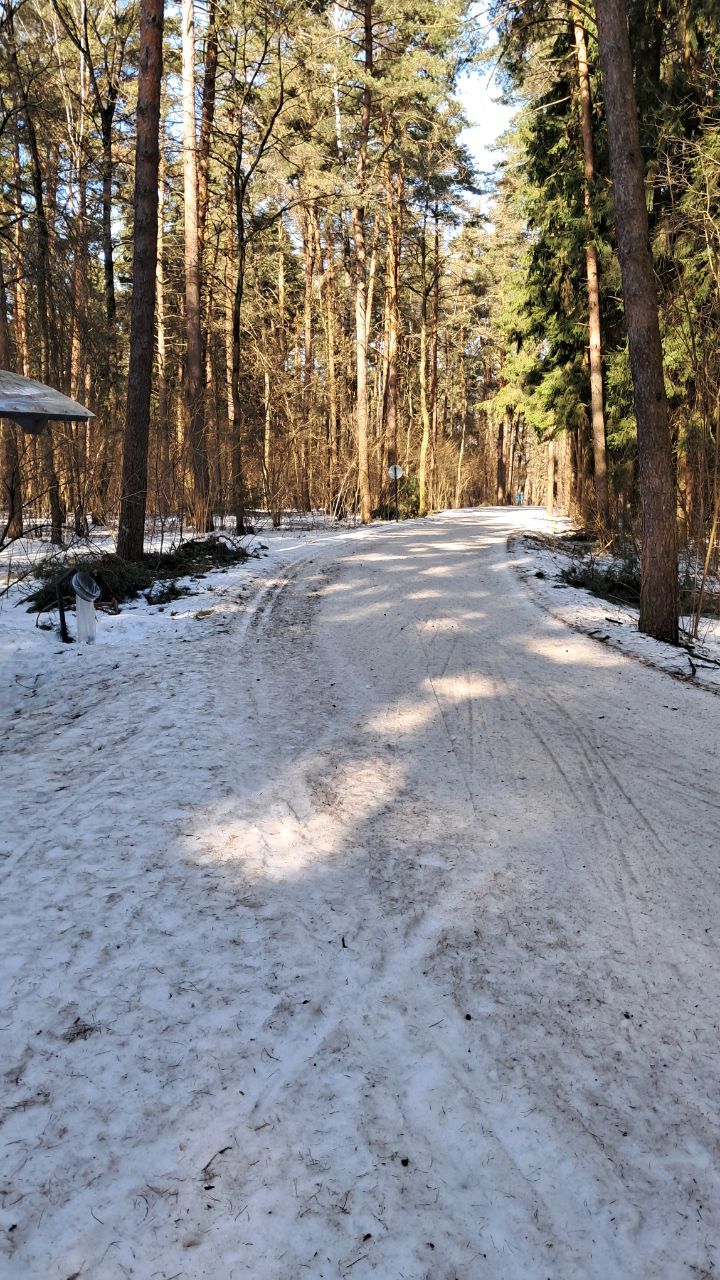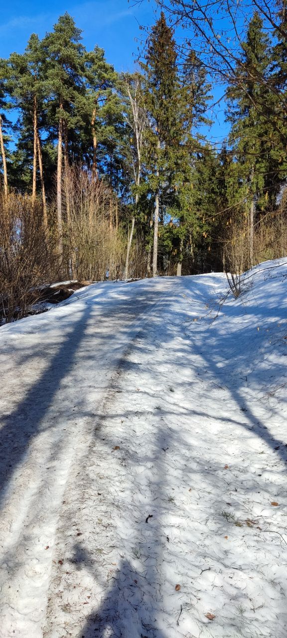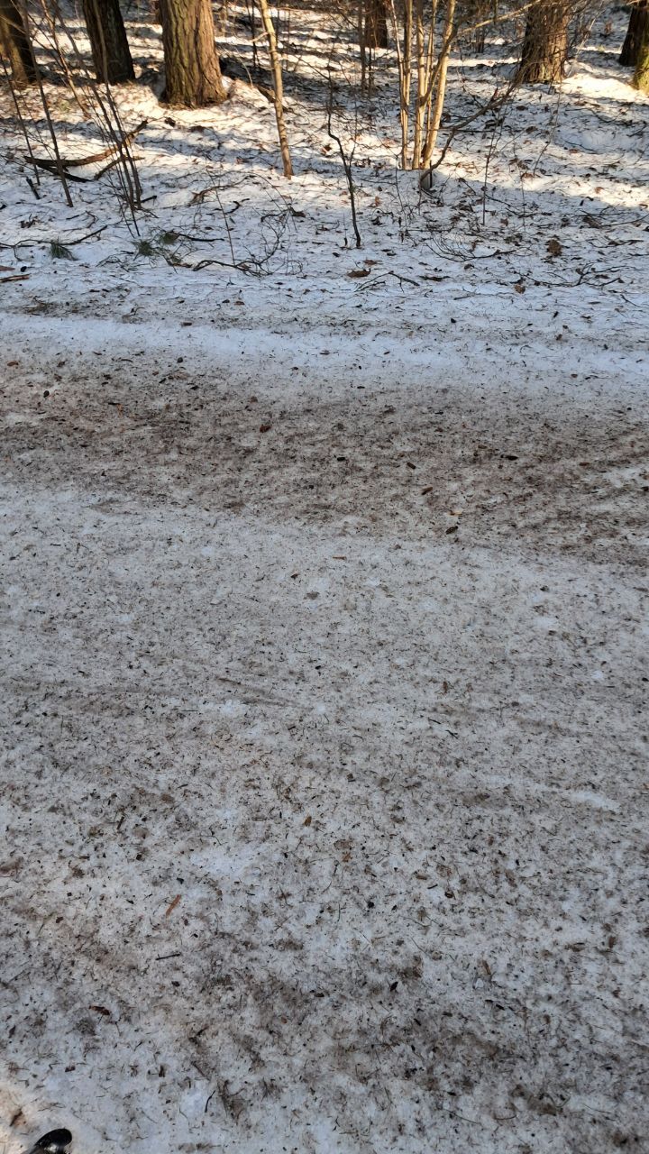 Трасса в хорошем состоянии. В садах уже снежная каша, а в лесу плотный снег. Но под соснами уже много иголочек и шишек.