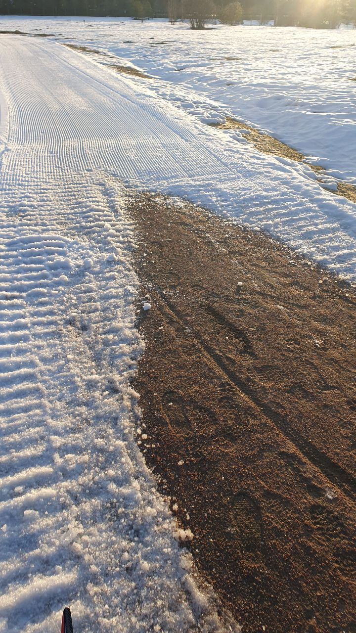 Более менее сносное катание сейчас только строго с утра часов до 10 вокруг поляны, на примыкающих к ней просеках центральной аллеи и прямой от Devi Club до парковки. В яблоневом саду то там, то тут зияют новые проплешины, которые уже не объехать, на роллерке очень грязно, местами лыжи просто встают, хотя проталин пока не наблюдается. Если начинаете кататься от церкви, то цепляйтесь не сразу, а только когда пройдите участок от проката до детской площадки - там уже земля и грязный лед по краям.