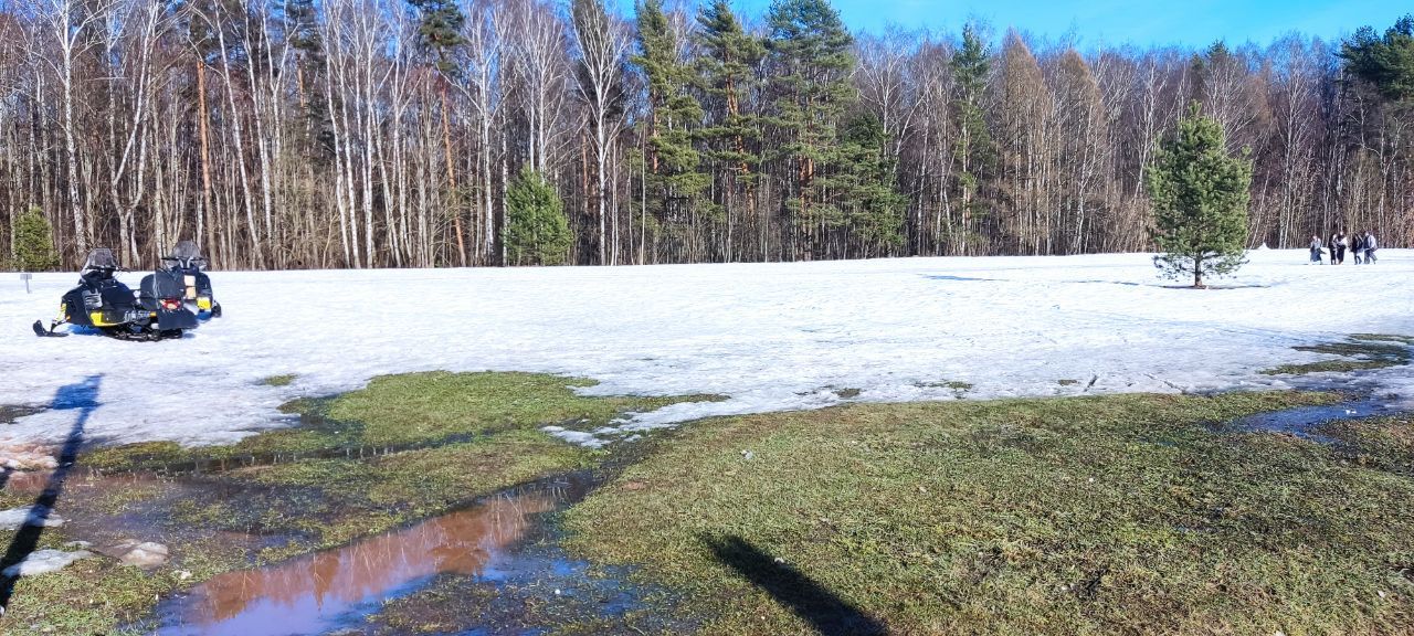 У пожарной башни в районе стоянки осталось 50см снега))) скоро разрыв будет. В 11 уже каша водяная. Ратрак ещё был в 12 примерно, по центру проехался. В лесу на роллерке уже часто летят стопкраны. На просеках ещё более менее. Через собак от станции пройти можно, лужу можно обойти.