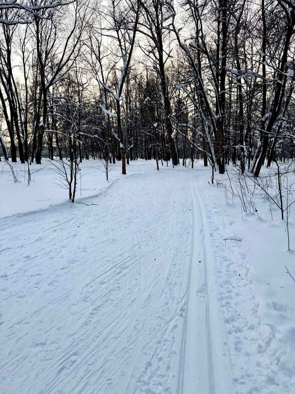 16:00. После снегопадов уже утоптали довольно хорошо, лыжи не закапываются. По всему кругу (3,75 км) есть и классика, и конёк