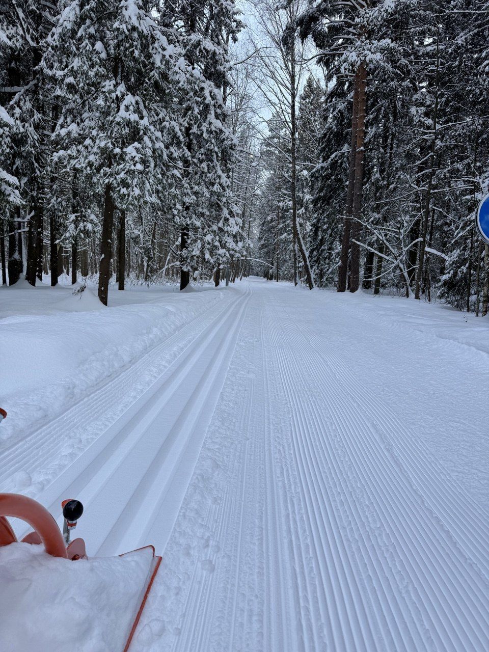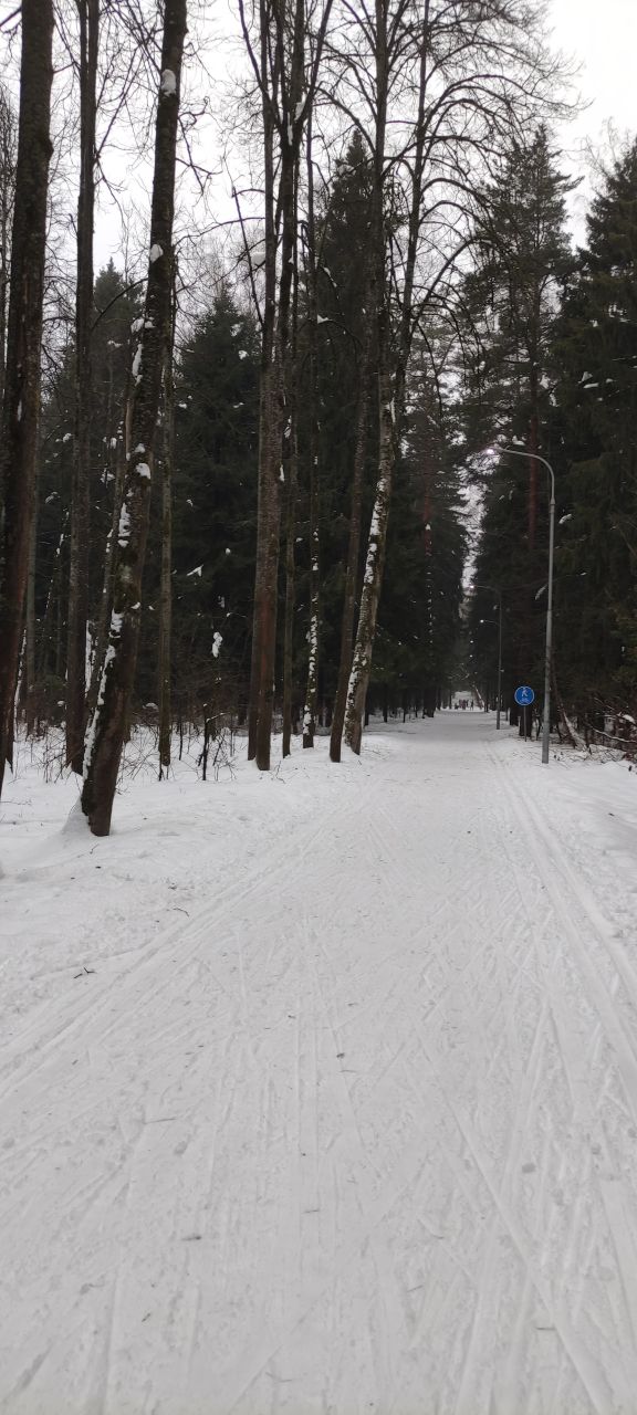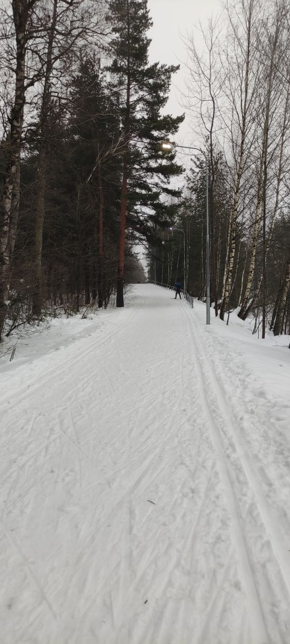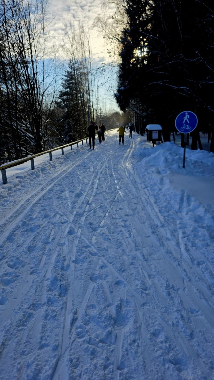 Коньковая часть от Дэви до Июня и до Императорских Мытищ уже не бетон, а глянцевый "железобетон". Канты нигде не держат. По полоскам на лыжне видно, что в оттепель утрамбовали тяжёлым оборудованием, выдавили воду и в мороз все забетонировалось. Такая ситуация в Мытищах всегда после трамбовки. Классика вроде как есть местами , но одна палка едет по бетону другая проваливается.