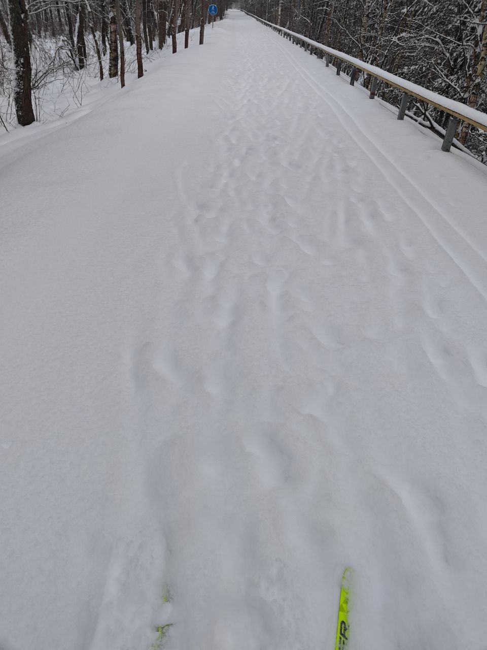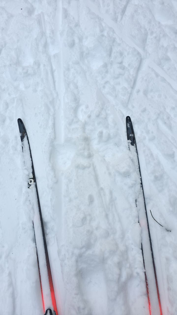 Вполне на треугольнике нормально. Рыхло, но палки не проваливались. Скольжение есть. Чисто разумеется. В лес сунулся и развернулся. Там мягче и палки мои уже не держат. Но и там вполне пригодно для конька. Классика самотоп.