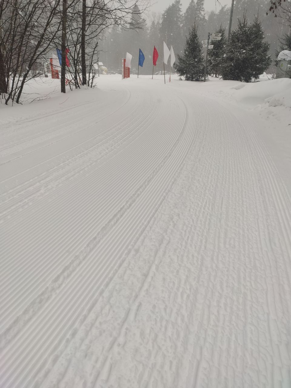 Трасса жуть, грязно, бугристо лыжней назвать язык не поворачивается. Хорошо, что снег шел и немного исправил ситуацию, но для нормальной тренировки, это место не подходит.