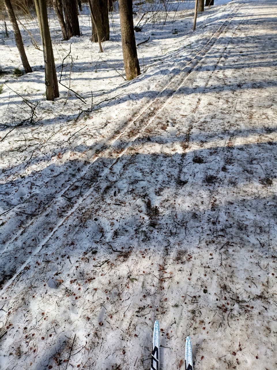 Если выбрать лыжи похуже, то можно реально получить удовольствие по всей локации. Пролетел 20 ку в хорошем темпе. Км из 3 минут пару раз. Получилось. Весна.Катался с 11-12.30. Затем скольжение резко список. Треугольник можно и на хороших.