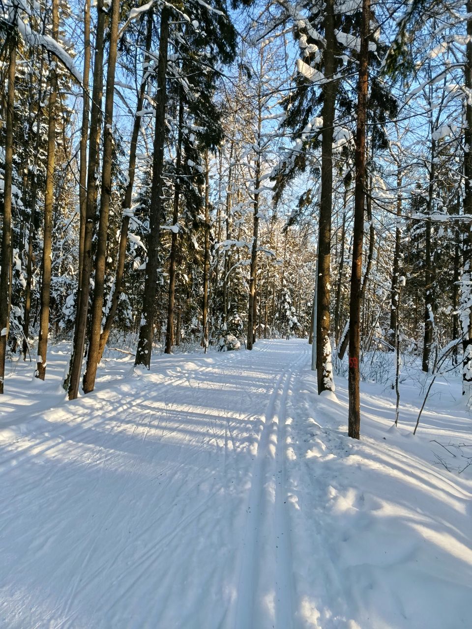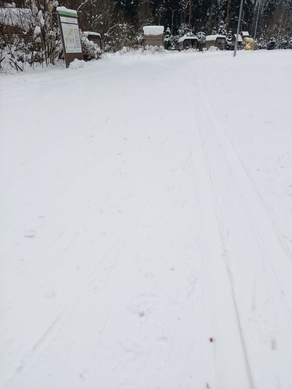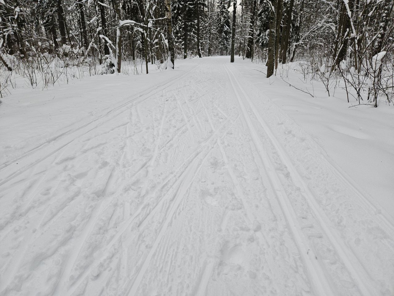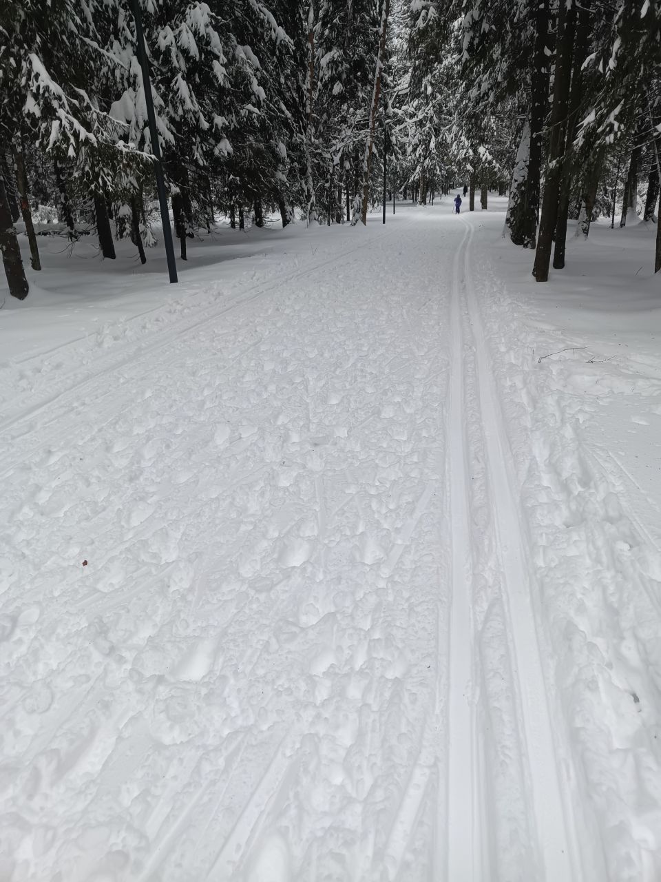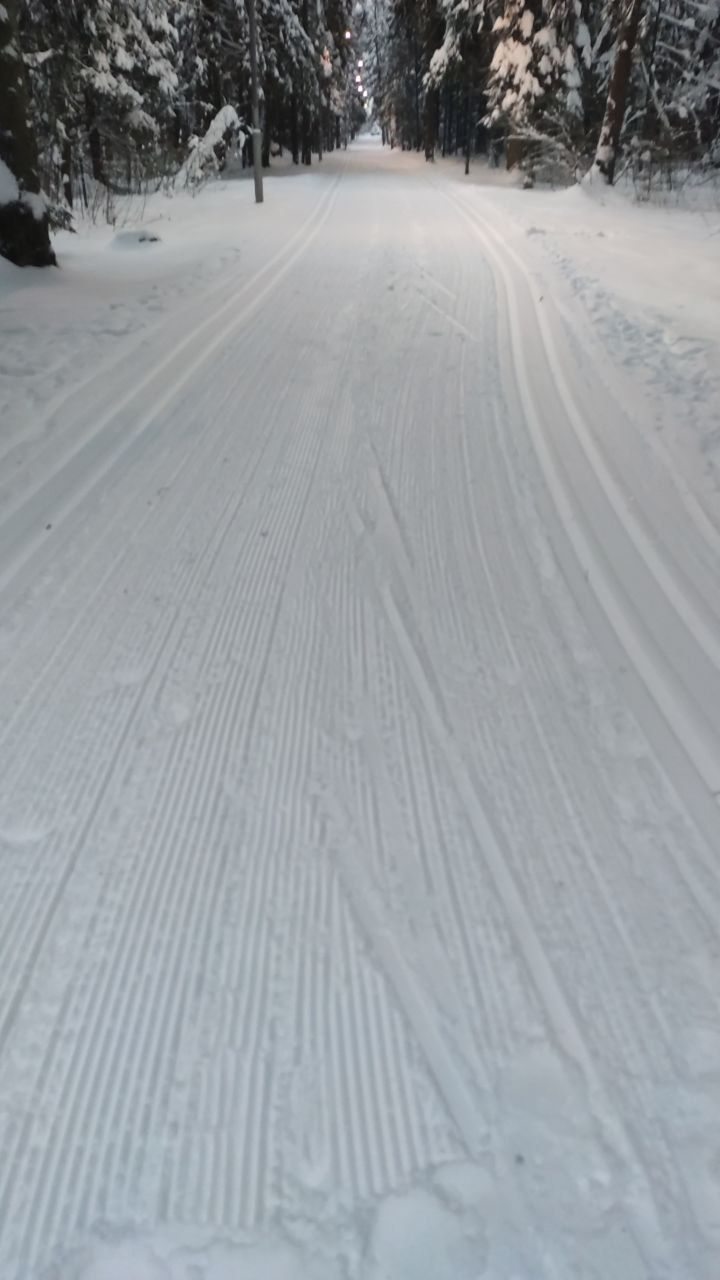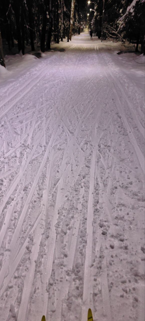 Один день не было снегопада и уже заметно жестче и кривее. Где-то ватрушками закатано, где-то копытинг от пешеходов, где-то собачники размесили классическую лыжню.