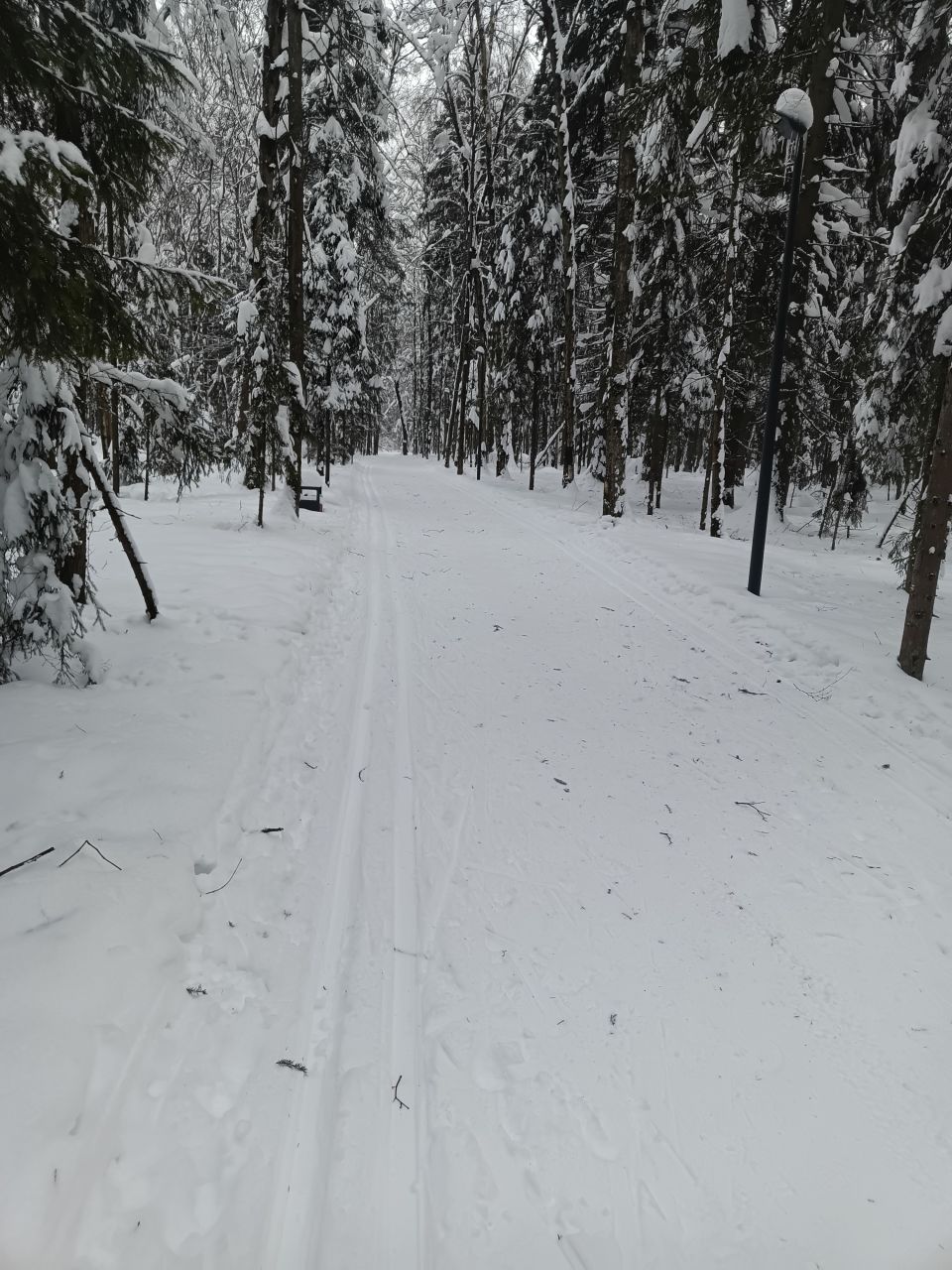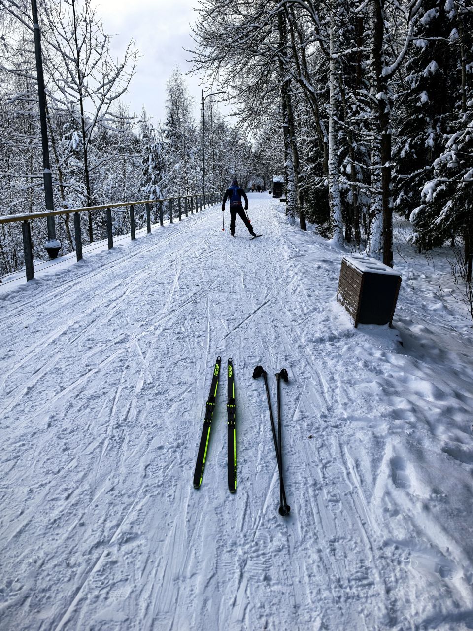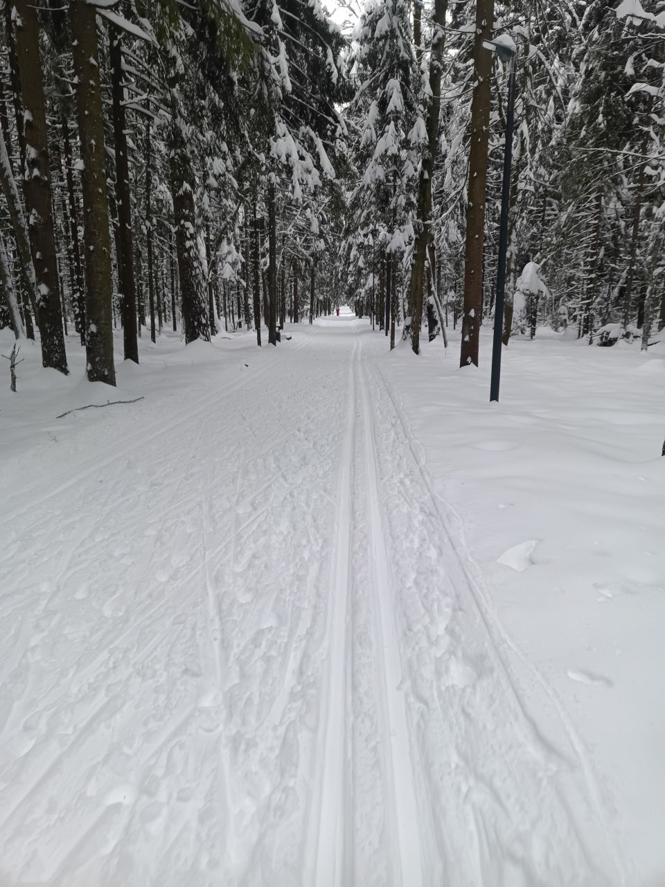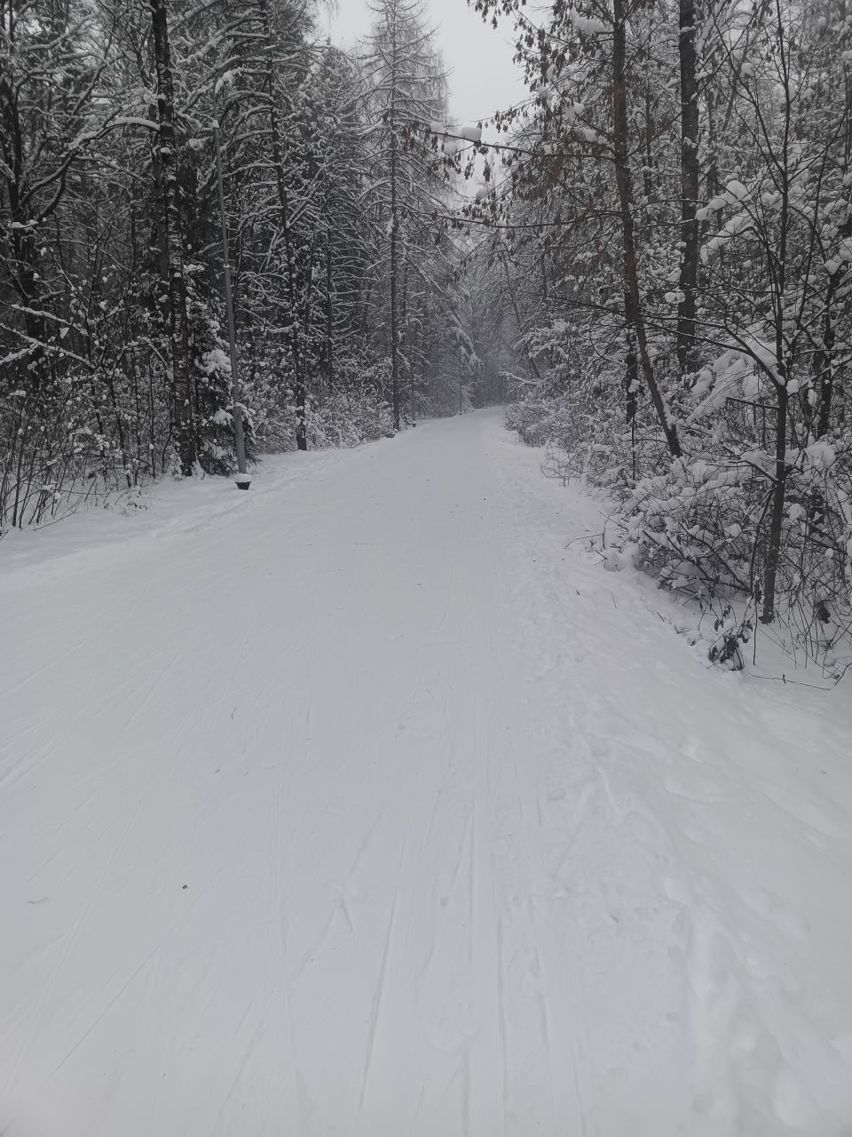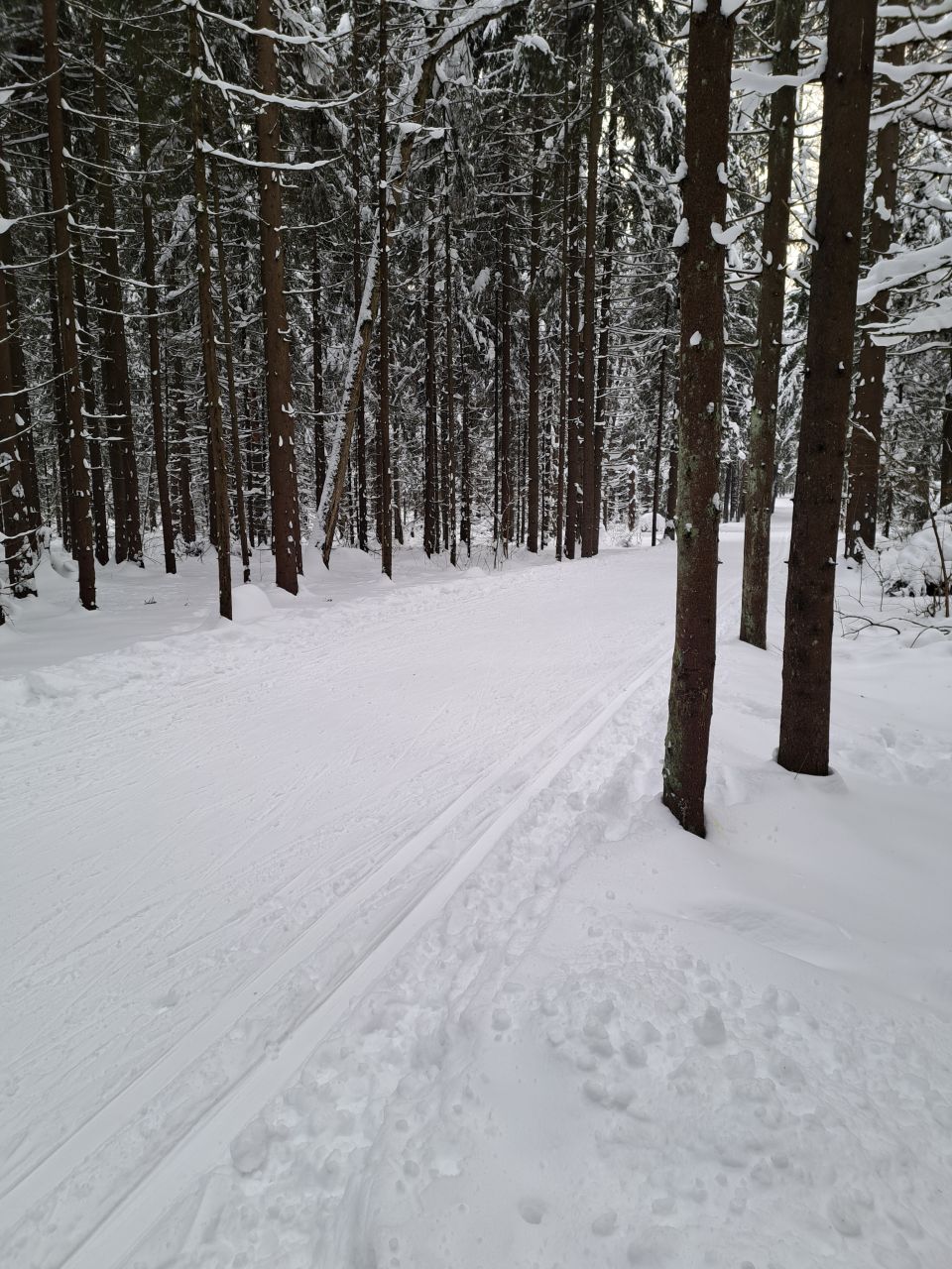 Один день не было снегопада и уже заметно жестче и кривее. Где-то ватрушками закатано, где-то копытинг от пешеходов, где-то собачники размесили классическую лыжню.