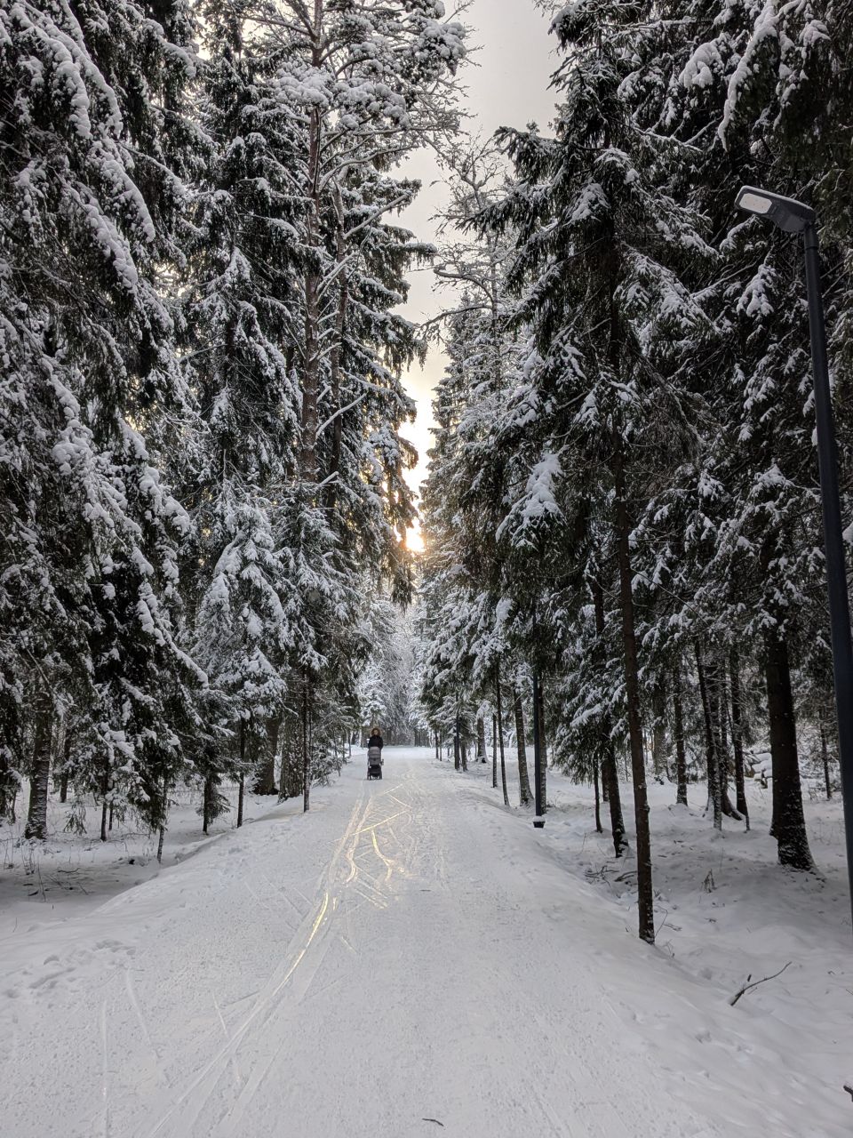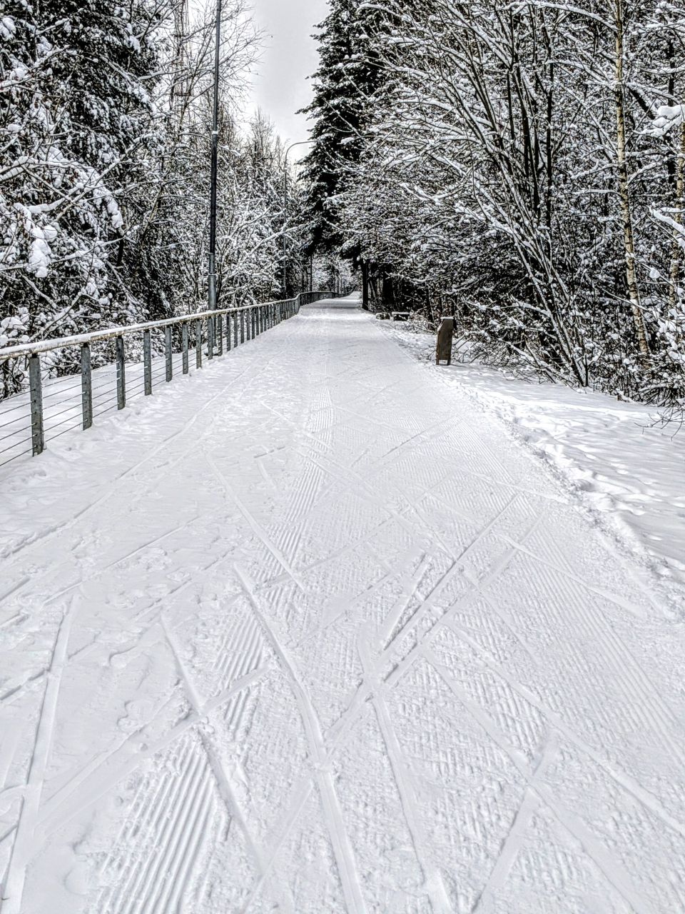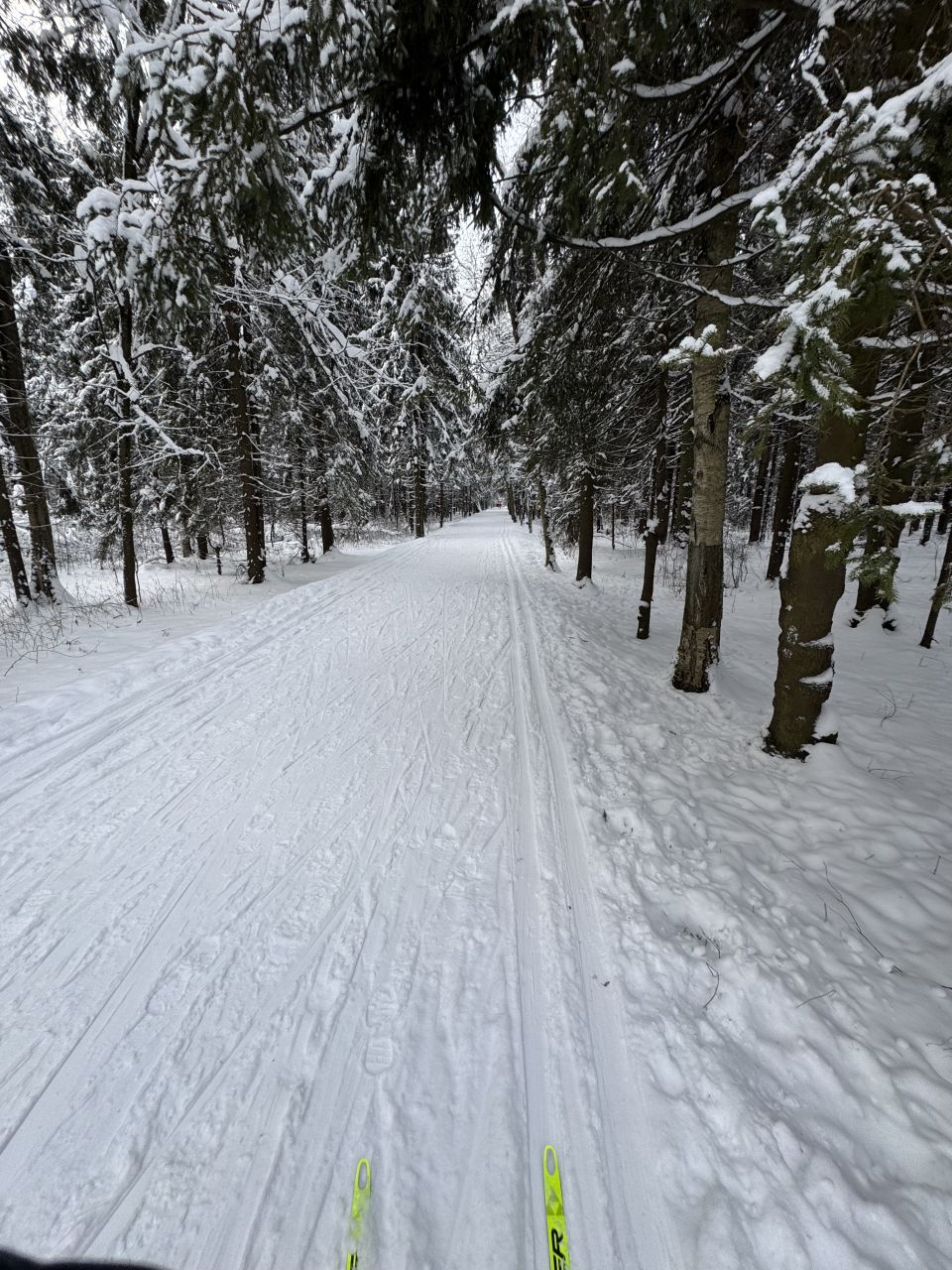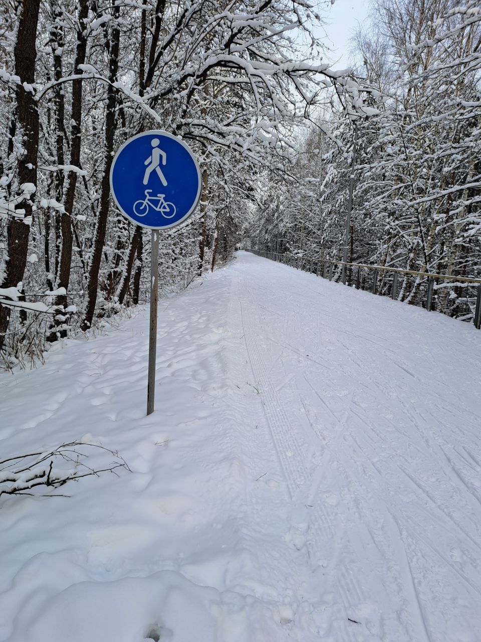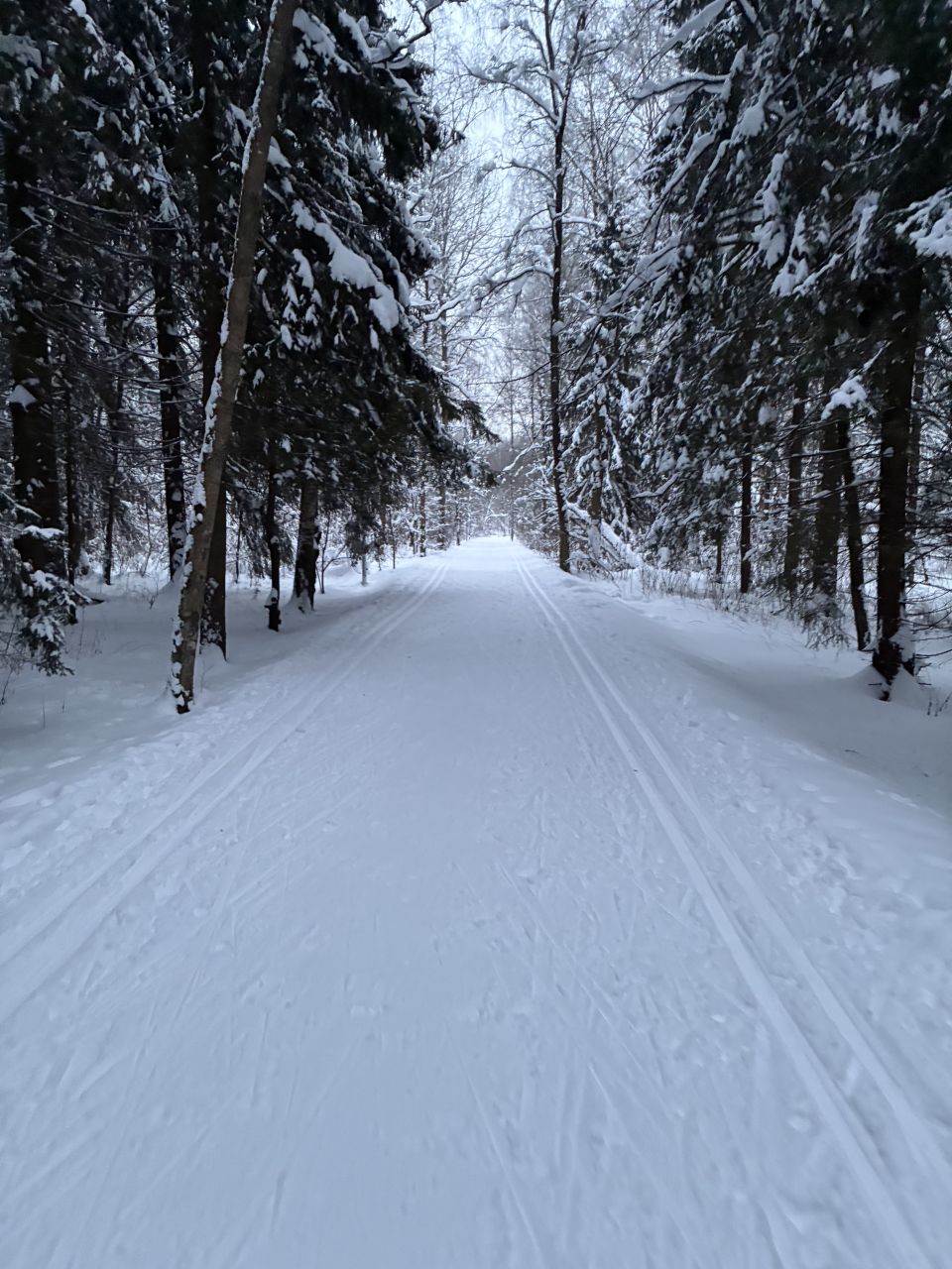 Один день не было снегопада и уже заметно жестче и кривее. Где-то ватрушками закатано, где-то копытинг от пешеходов, где-то собачники размесили классическую лыжню.