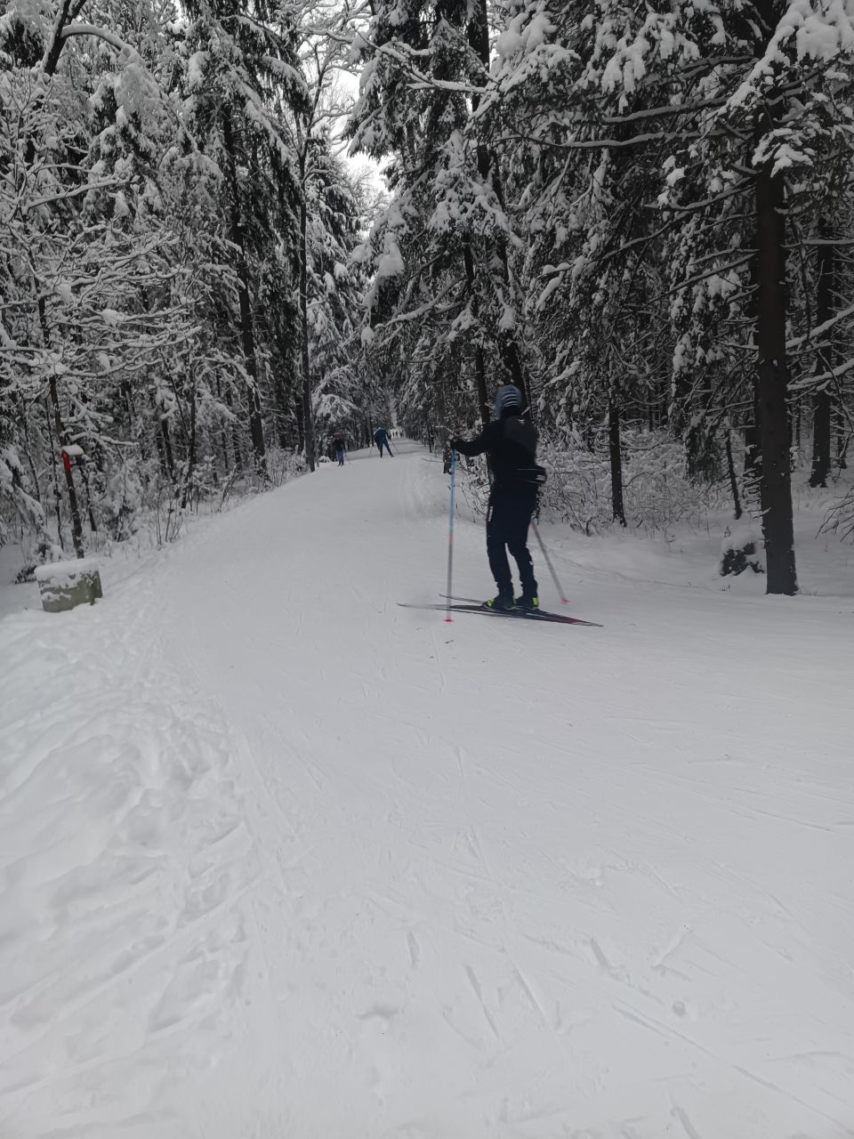 Скольжение по свежему снегу хорошее. Я в от ходоков не чувствуются. Лыжня уложена, но нормально толкаться в ней довольно сложно, палка, которая будет ближе к обочине - проваливается ;( нужно попробовать поставить более широкие лапки и проверить.