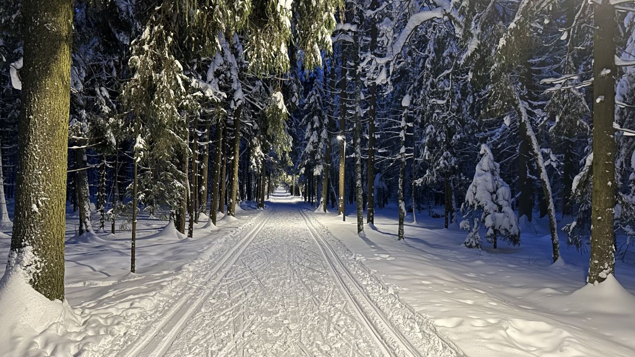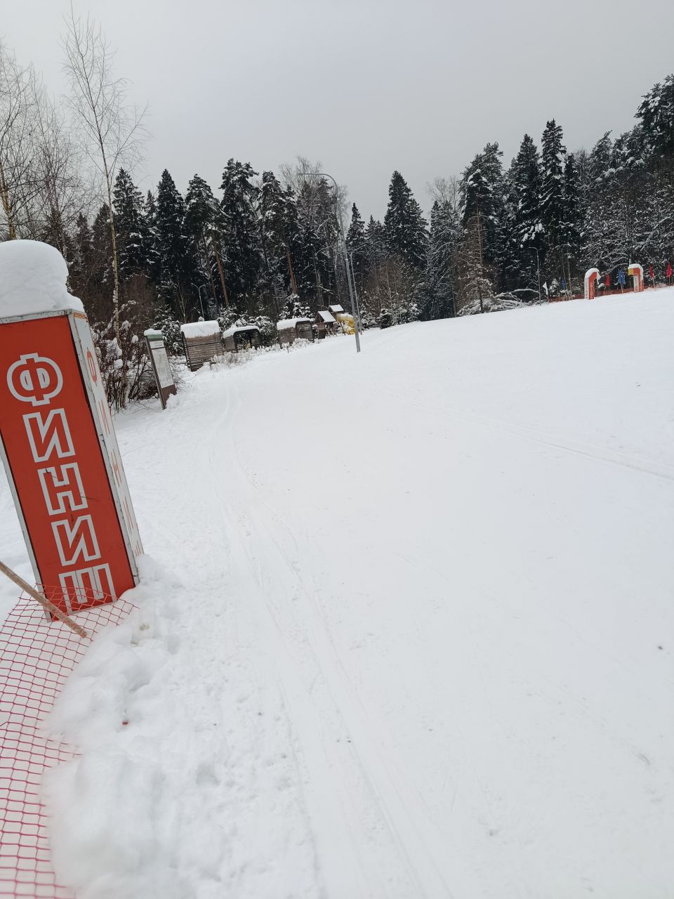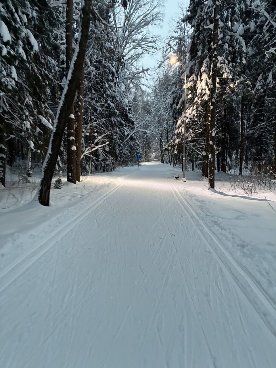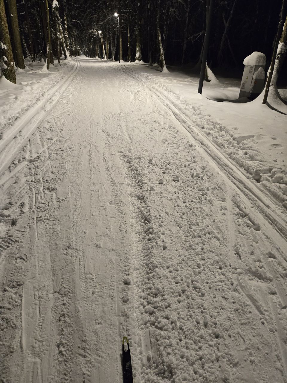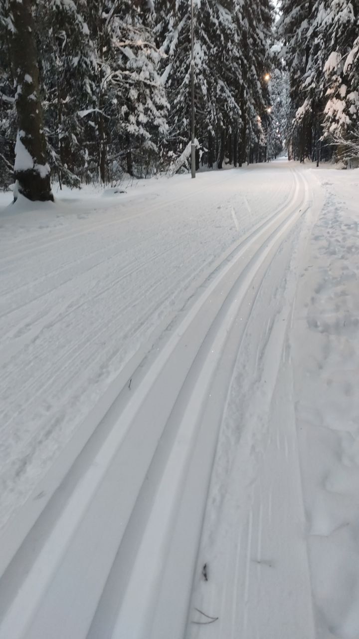 В Мытищах как всегда, сутки назад закончился снегопад, а уже все затоптано, бетонная трасса и замёрзшие следы лыж. Не мешает проборонить трассу. Но в целом сойдёт и так, мы привыкли.