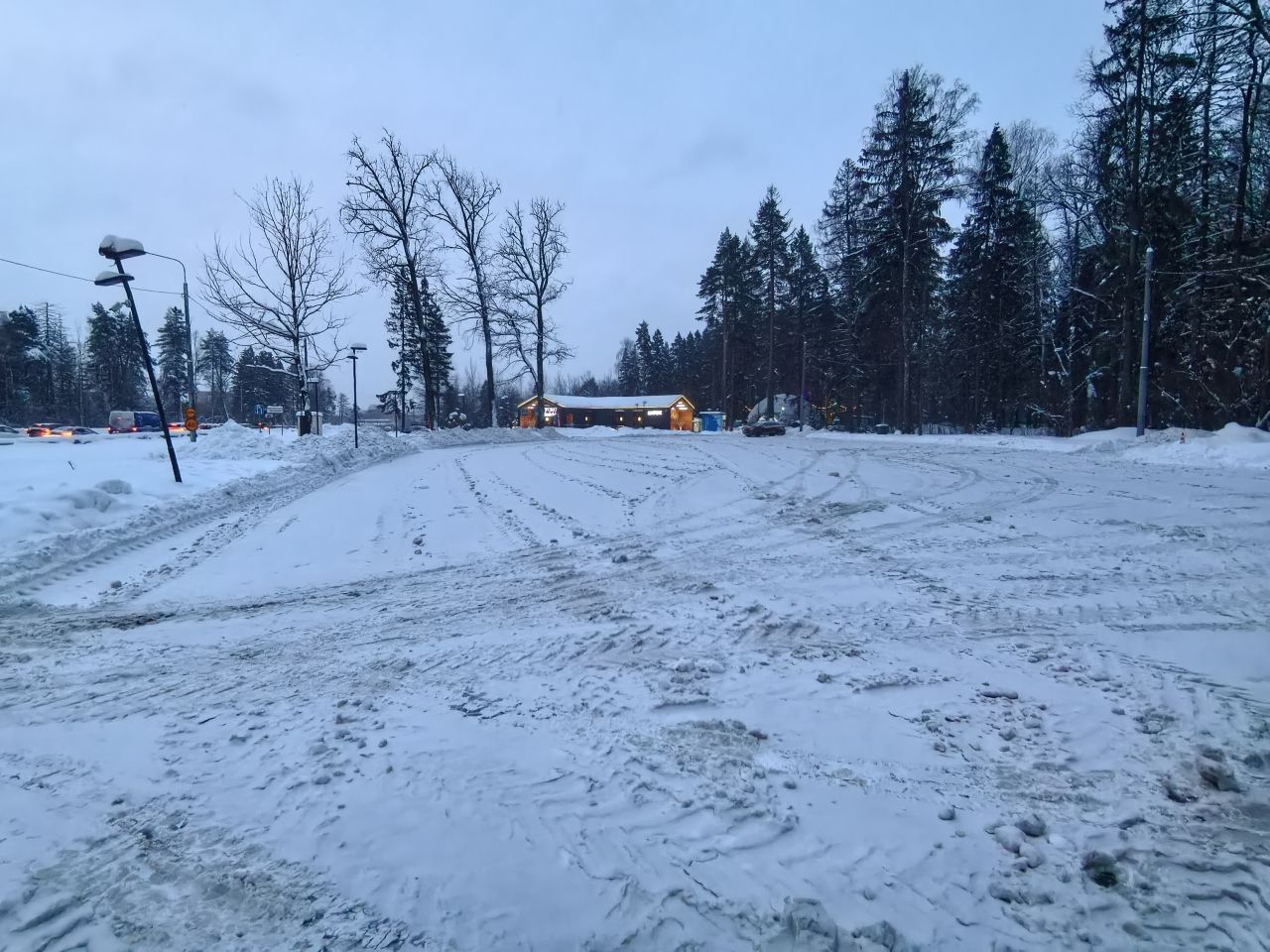 Несмотря на то, что снег подтаял, скольжение было на четвёрку, а последние 200 м до арки / входа в парк вообще летело. Впервые запарковался на ближней парковке. Она совсем не чищена, одно переднеприводное авто мужики выталкивали втроём.