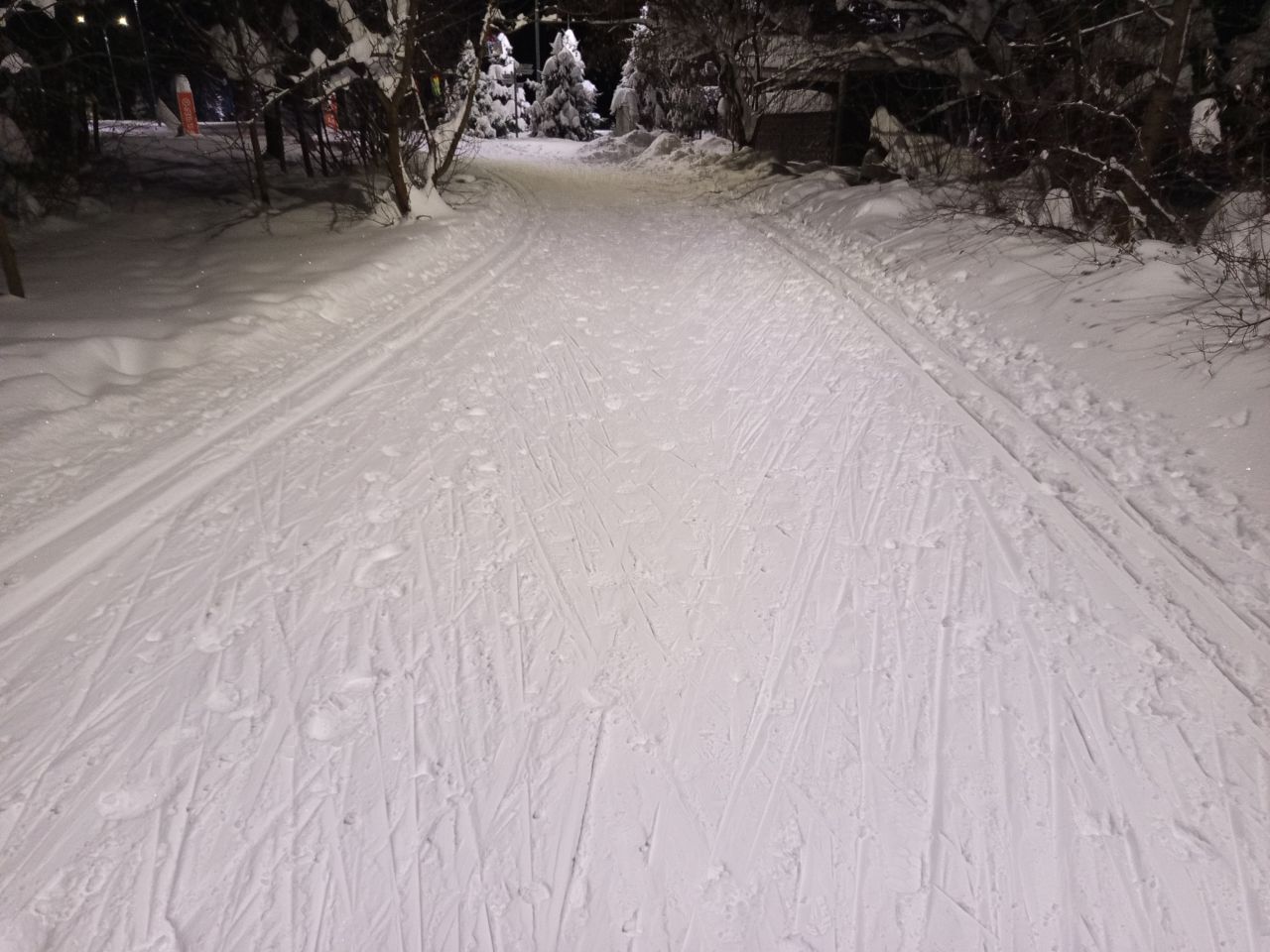 Катался с 22-00 до 23-15 по треугольнику. Состояние для такой погоды отличное. Чуть рыхловато. Трасса рабочая, тренировка получилась отличная, нагрузочная. Лыжников было много, видимо по мере выпадения снега лыжники дружно утаптывают трассу.