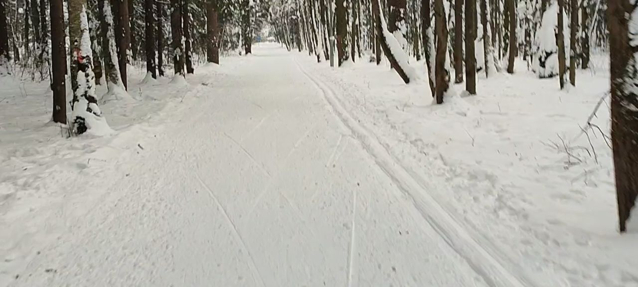 В начале маршрута, на участке возле июня, трасса покрыта сугробами, из‑за чего передвижение возможно исключительно классическим стилем. Однако после развилки через 300-400 м состояние снежного покрова заметно улучшаются: снег лежит достаточно ровно, что позволяет комфортно перейти на коньковый ход и полноценно поработать на дистанции хоть и не без усилий.