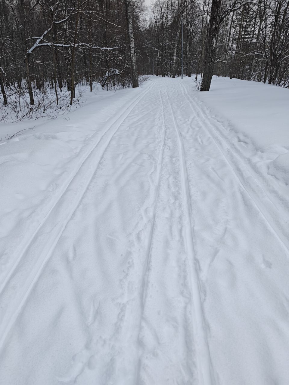 Один день не было снегопада и уже заметно жестче и кривее. Где-то ватрушками закатано, где-то копытинг от пешеходов, где-то собачники размесили классическую лыжню.