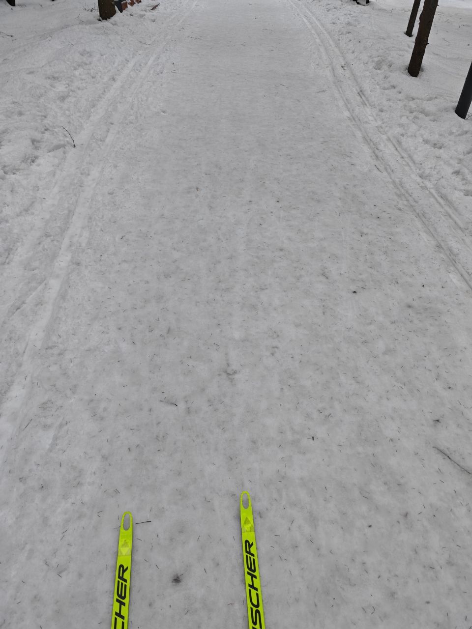 После прекрасного скольжения в первые дни января, на трассе появилось много мелких веток и пешеходов) Насколько я понимаю, ратрака в Мытищах нет, поэтому срочно нужен свежий снег, иначе в ближайшие дни коньковая трасса превратится в бетон