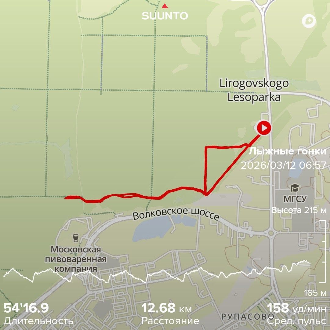 Наконец-то, после болезни, выбрался. Трасса, вопреки опасениям, оказалась вполне. До остановки. А вот к императорским и мусора многовато и двух колёсные ...Рельсы накатали.. Думаю туда все...на хороших лыжах точно не стоит. Скольжение достойное на пульсе 110-120 20 ку даже не заметил, не смотря на +9 . Конечно на открытых участках каша , в тени бетон 🙂 Весна. Но кататься ещё можно.