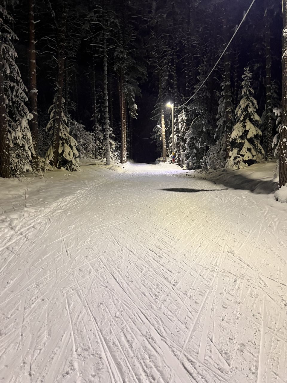 На трассе отлично. По сравнению с субботой стало лучше, снега много, земля не встречается, видно, что трассу готовят постоянно. Вечером включают свет