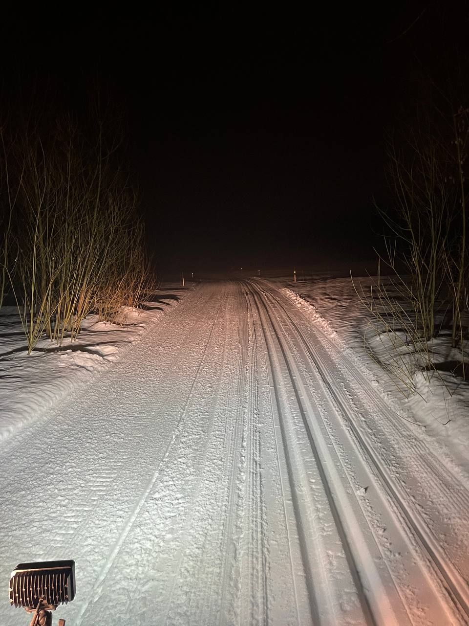 На трассе -21 и ветер. Классика заметена на 80% Восстанавливать нет смысла пока не стихнет ветер. Сегодня ночью в канаве утонул чей то снегоход, ввтаскивали его трактором и разворотили подход к трассе от вертодрома. Следы удается заравнивать Габошей, но сегодня не успеем доделать. Лучше сегодня выбирацте лесные трассы.