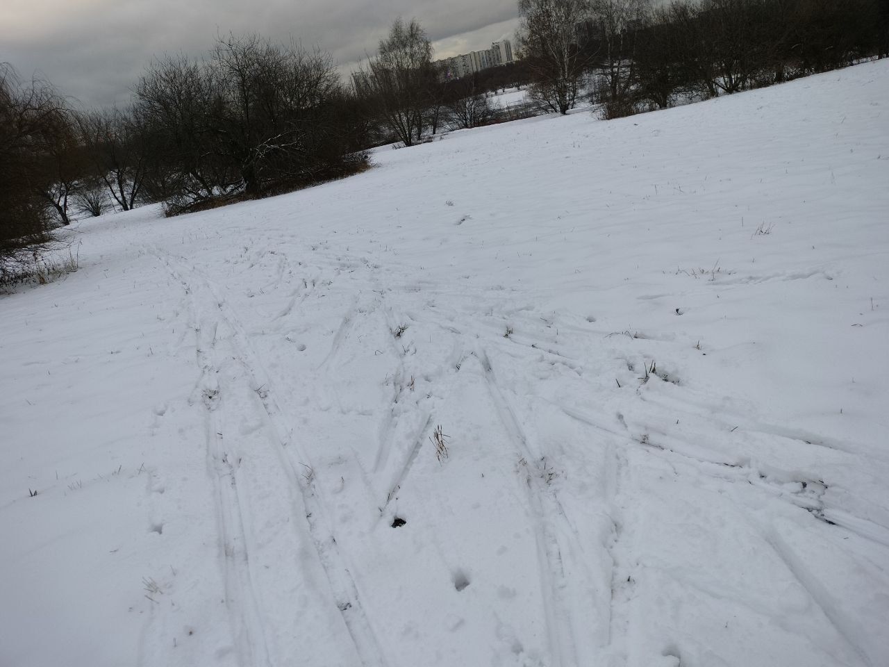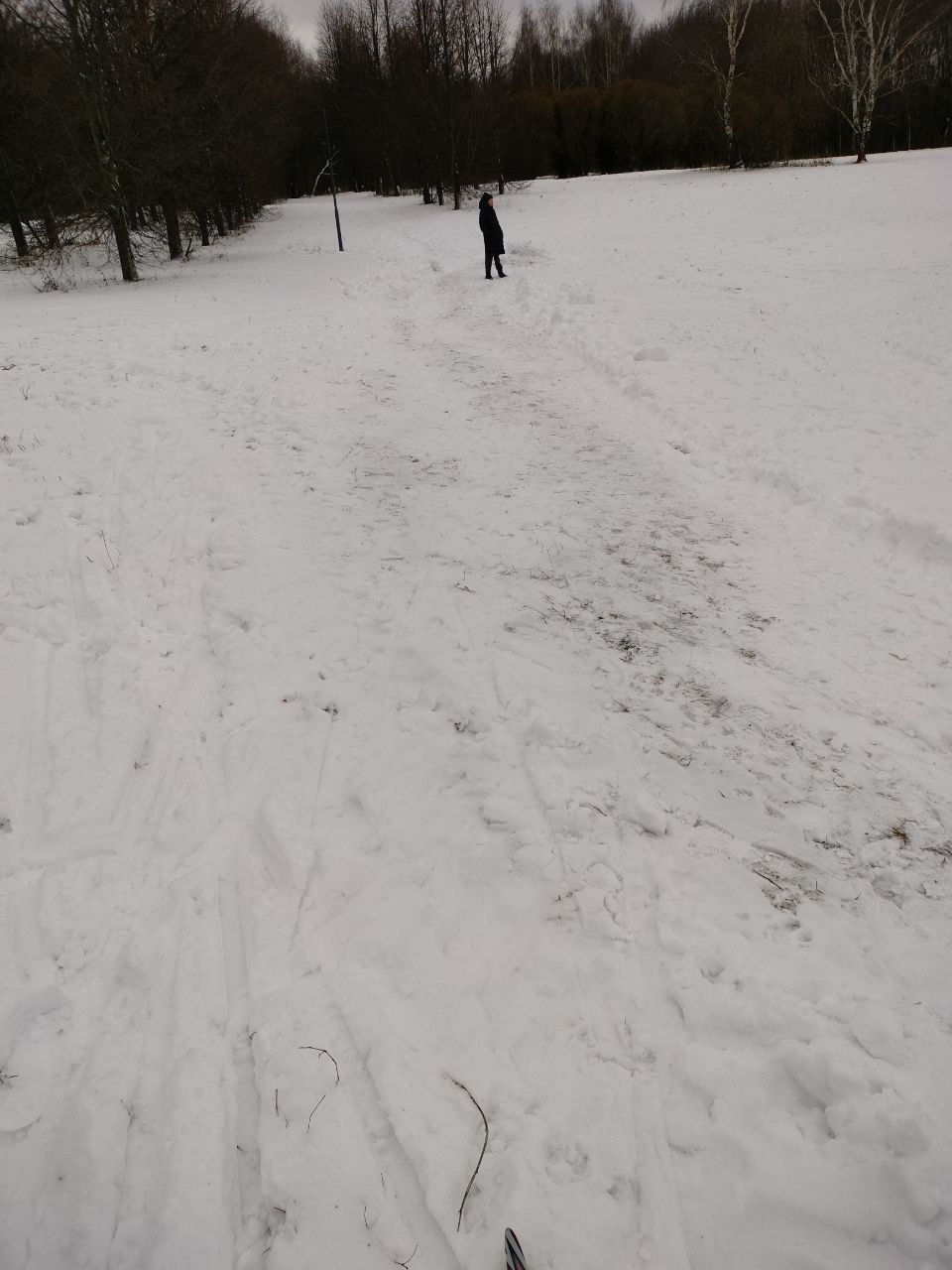 Прошел 2 круга коньком. Именно "прошел". Конечно вчера был идеальный день, что бы примять трек снегоходом, за ночь бы смерзлось. Первый спуск вдоль Шипиловского раскатан, дальше, особенно 1 подъем и все другие тягуны очень рыхлые, снега много, носки лыж цепляют траву под снегом. Немного лучше под деревьями, есть участки, где удавалось идти под каждый шаг. Но их увы, немного.