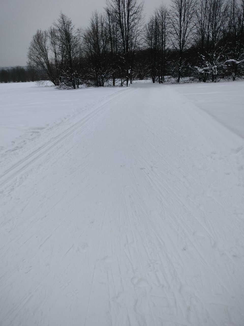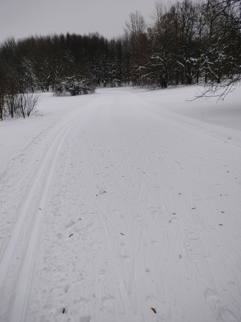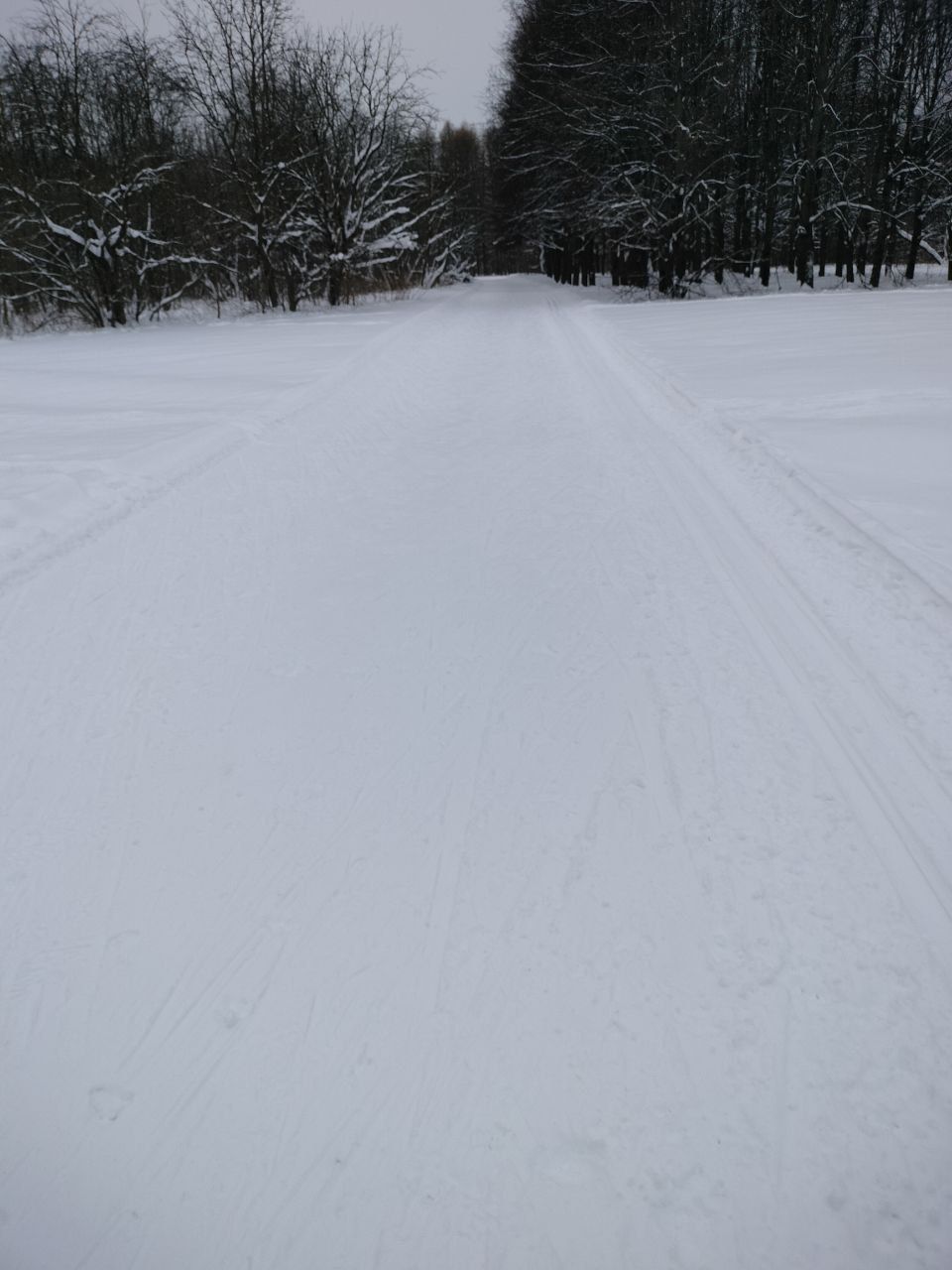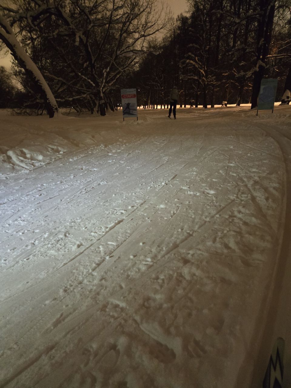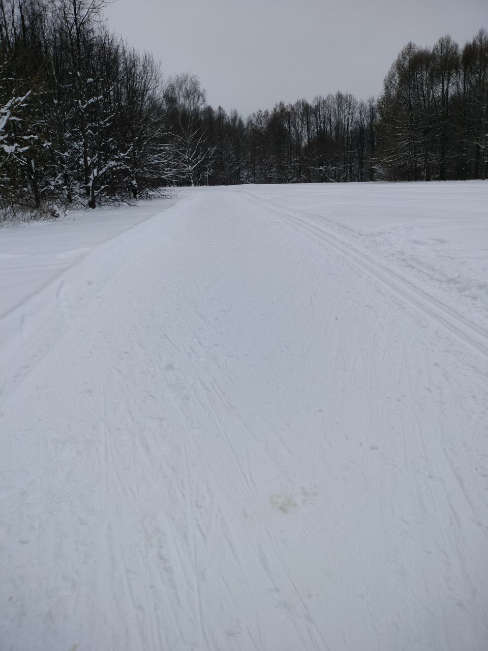Трасса хорошо укатана, ровно, в меру жестко, скольжение хорошее. Кое-где трава выпирает, а так довольно чисто, хоть гуляющих и хватает в тч нетрезвых.