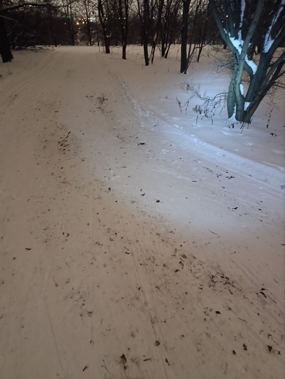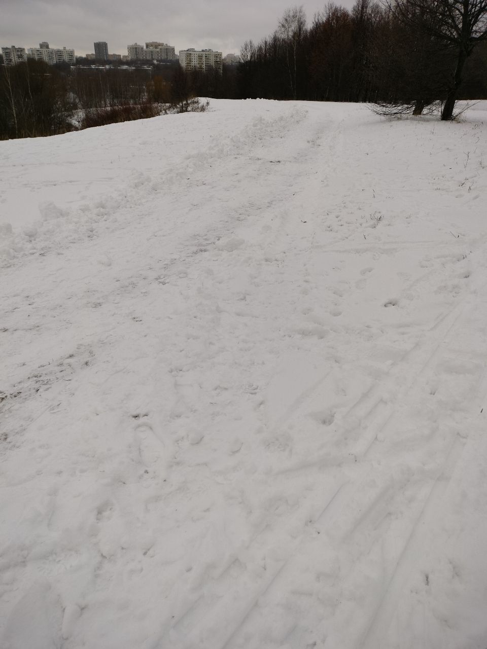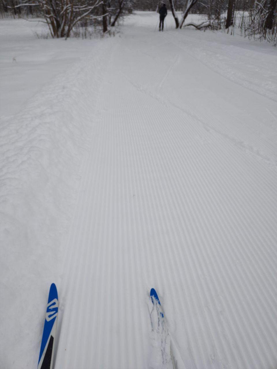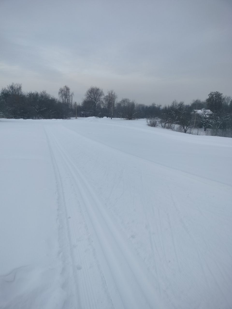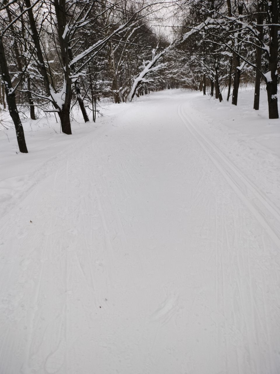 Трасса хорошо укатана, ровно, в меру жестко, скольжение хорошее. Кое-где трава выпирает, а так довольно чисто, хоть гуляющих и хватает в тч нетрезвых.