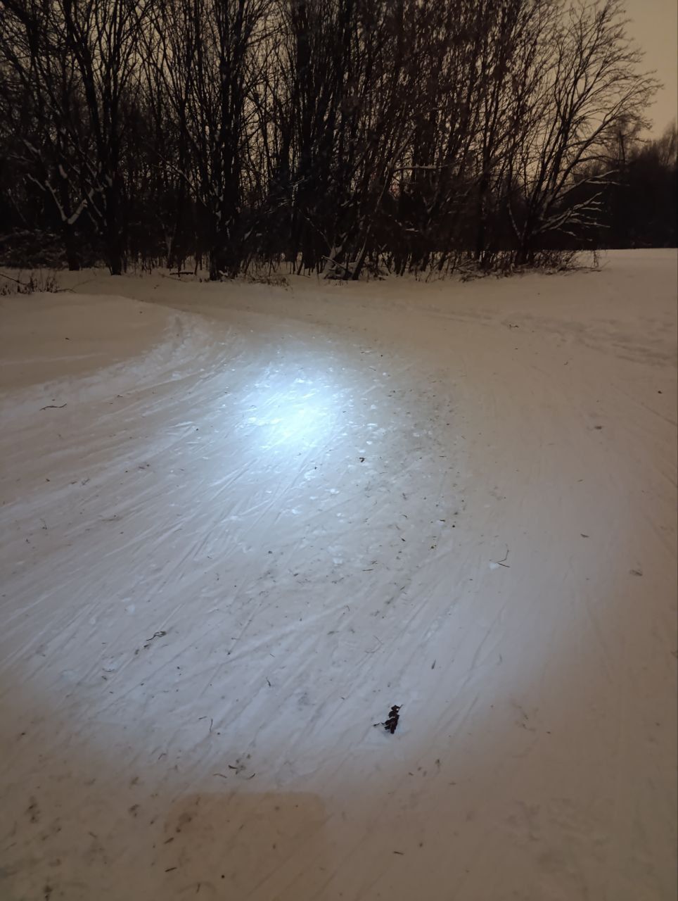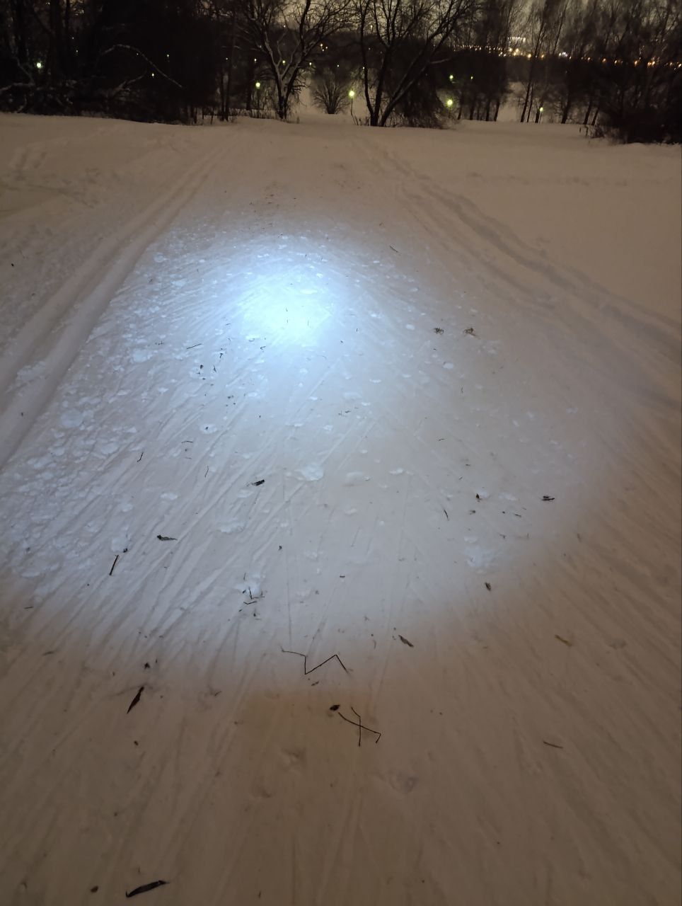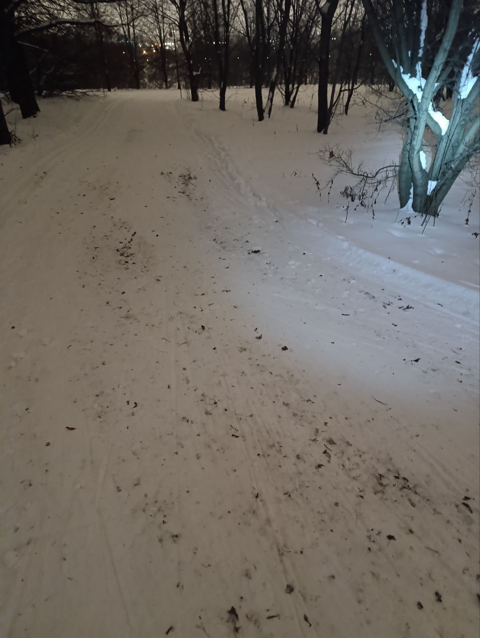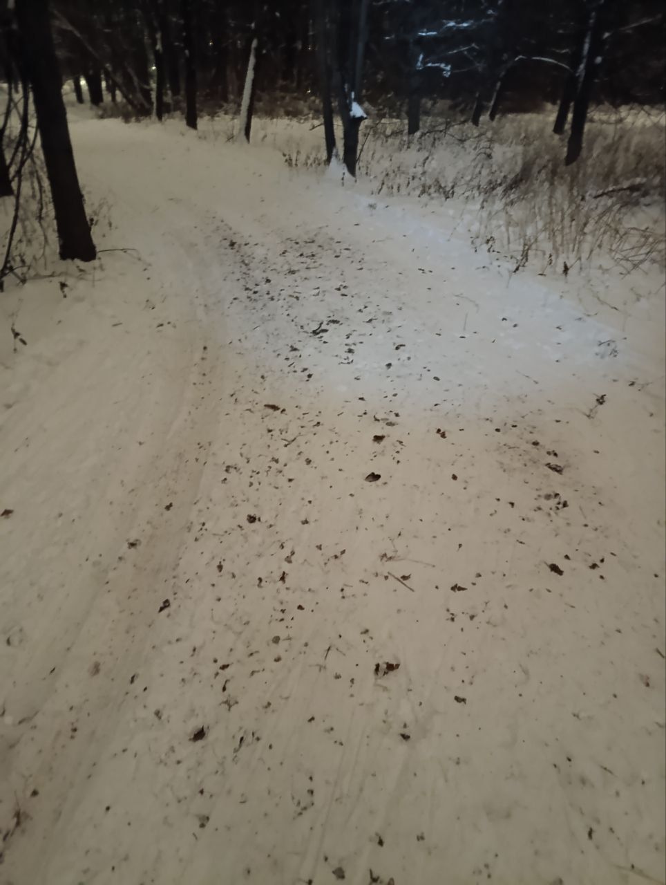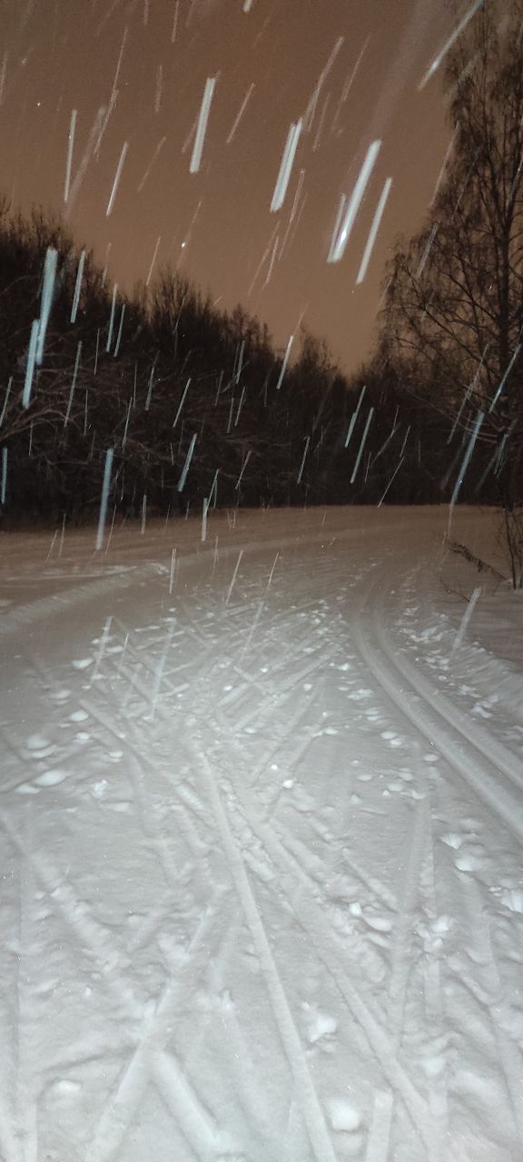 Вчера вечером. Водитель ратрака, наверное, танкист. Все повороты вспаханы до земли. Он, наверное не знает, что кроме классики, которую он нарезает тщательно, есть ещё и конек... Ну и бесы, в виде людей с собаками, обиженные на лыжников, что им хорошо... Подумаешь, 50 человек и 100 собак прошли по лыжне!! И так покатаетесь!