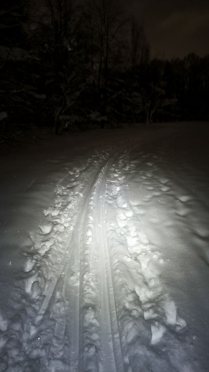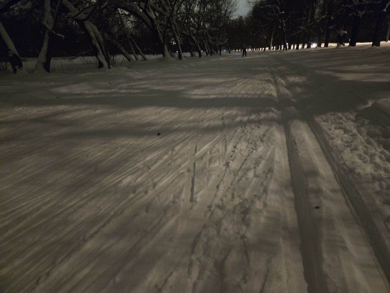 Полночь. Лыжня видна, присыпана. В отдельных местах - совсем засыпана. Не снегопадом - метелью. На полосе для конька либо нет следов, либо следы одного лыжника. Много пушистого снега.