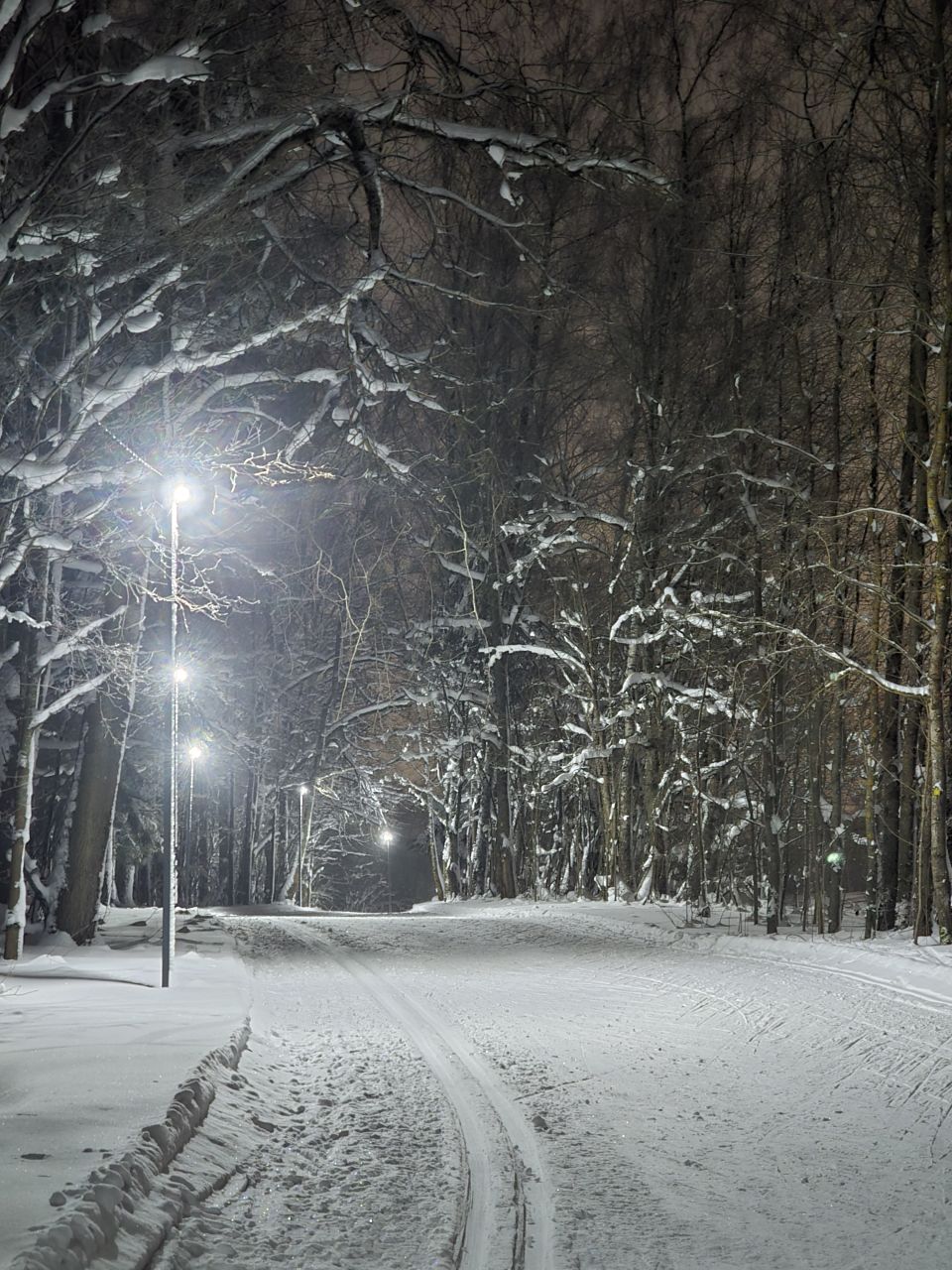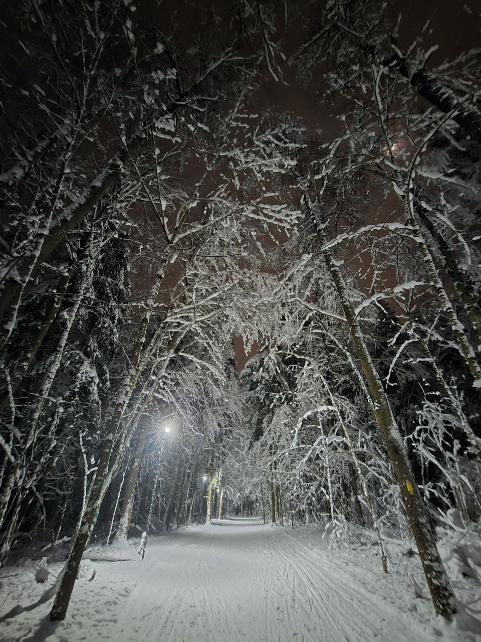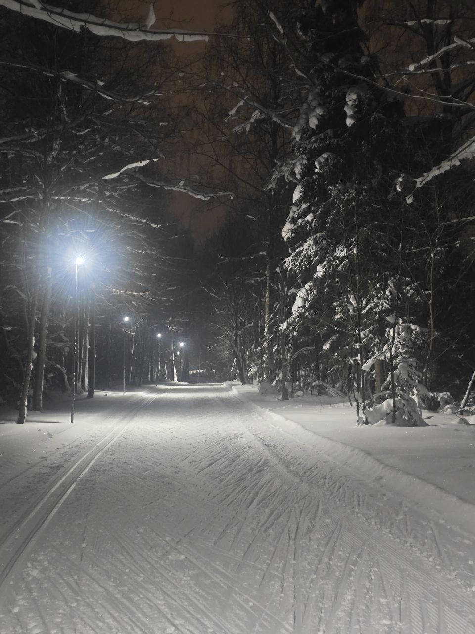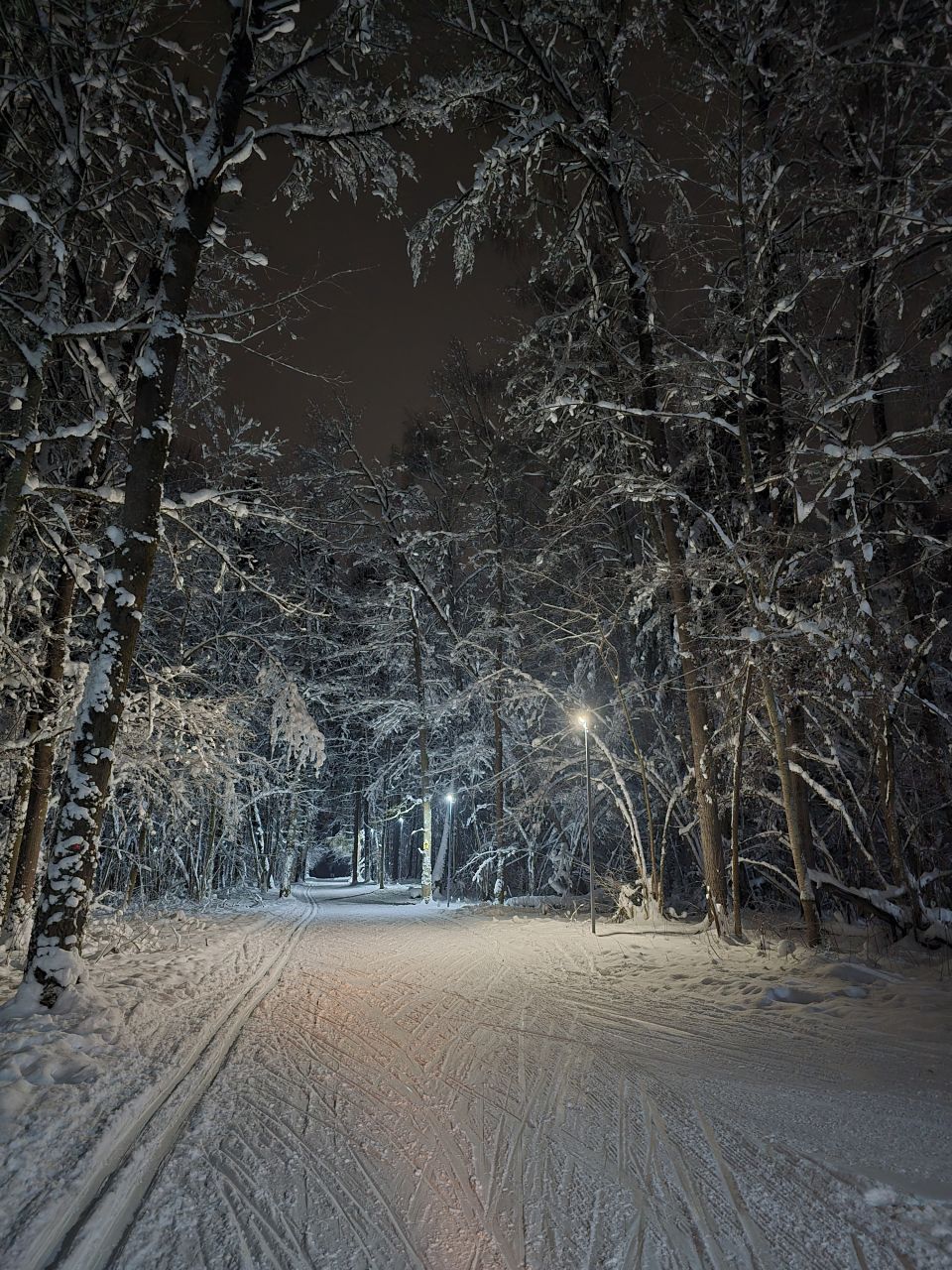 В остальном всё нормально. Мусора никакого не видел, точно можно на хороших лыжах. В свете фонарей зимний лес очень красивый