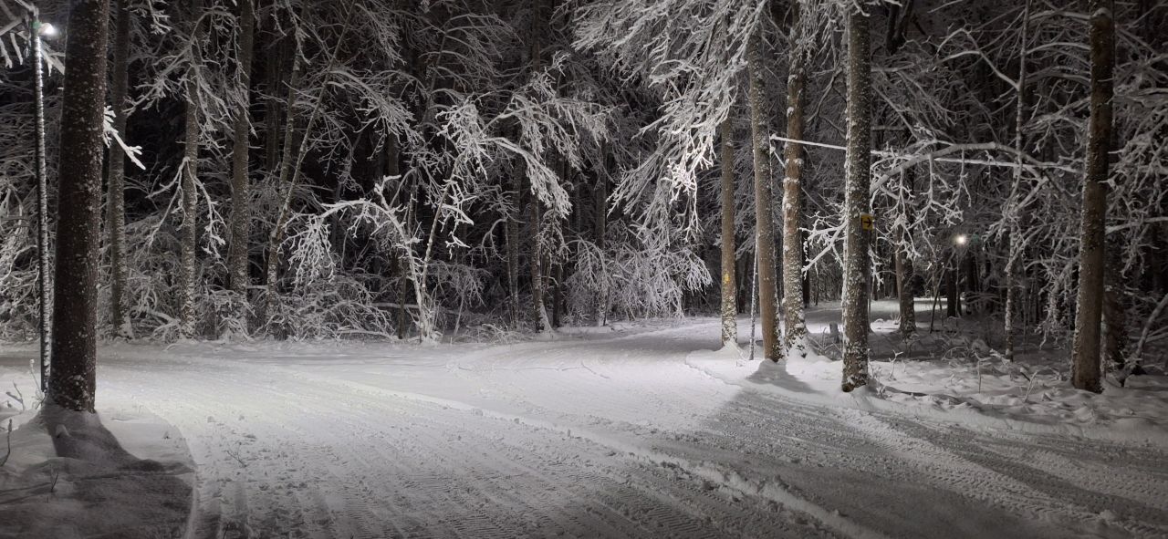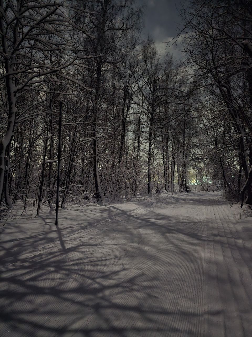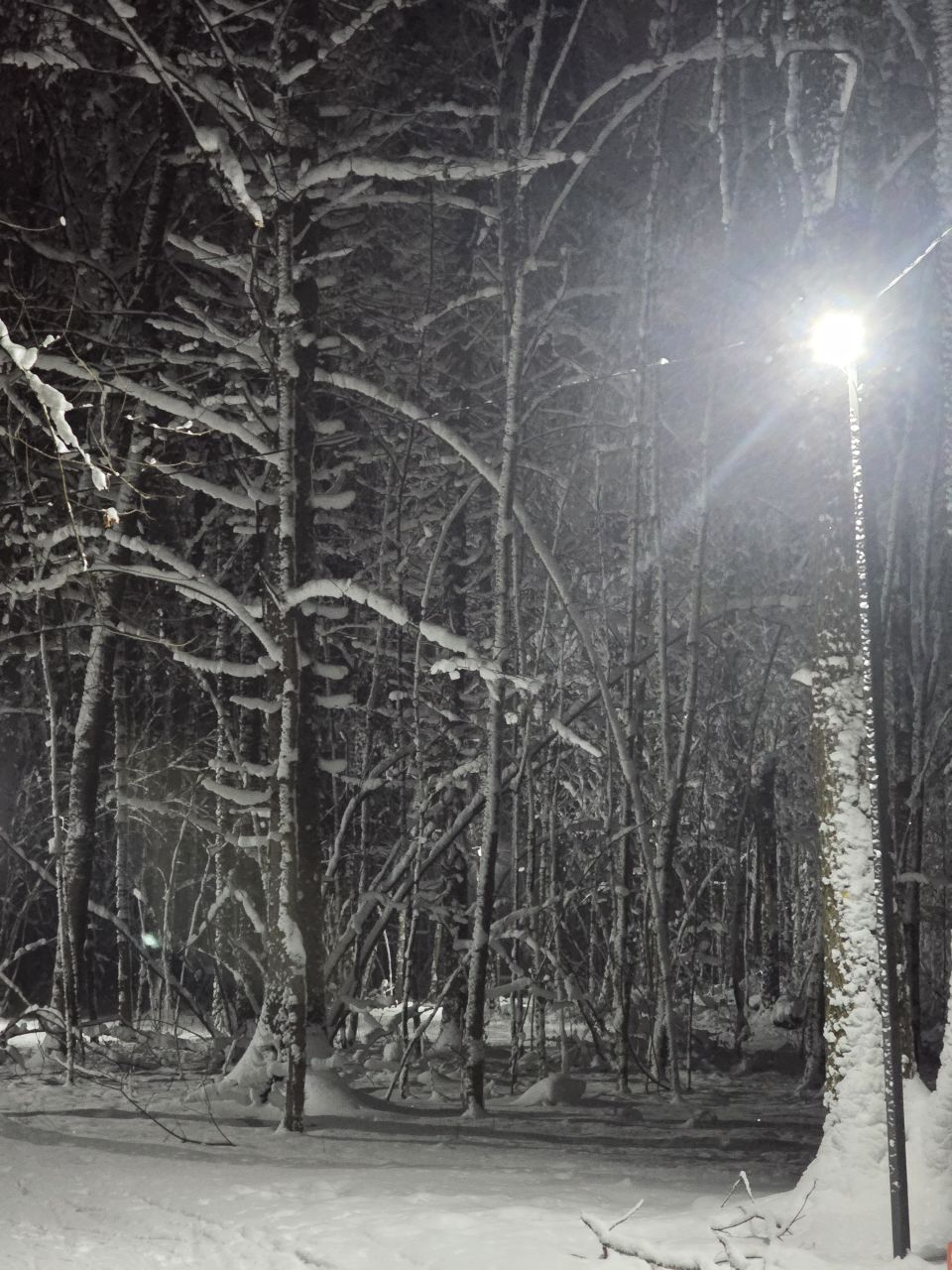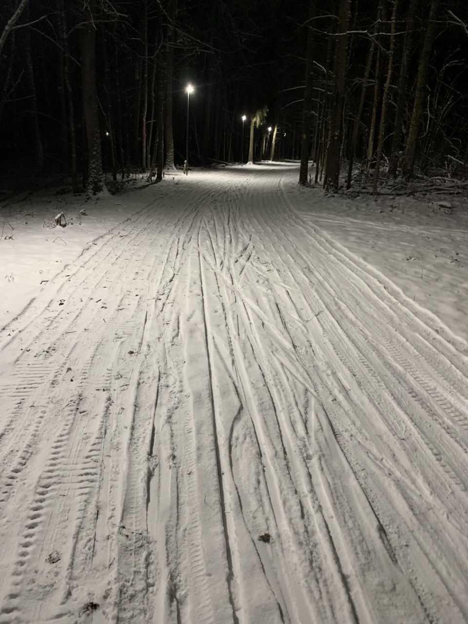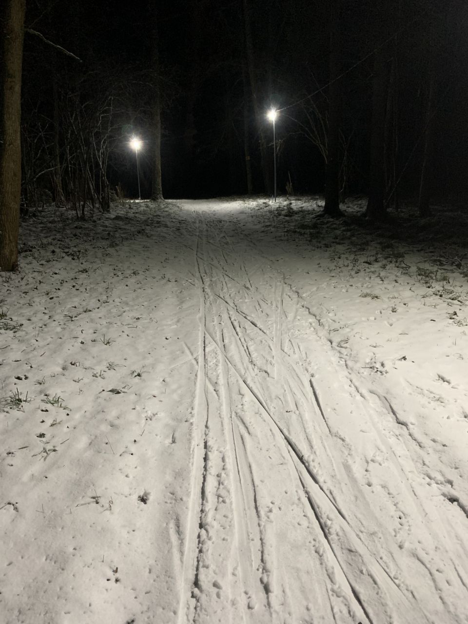 В остальном всё нормально. Мусора никакого не видел, точно можно на хороших лыжах. В свете фонарей зимний лес очень красивый