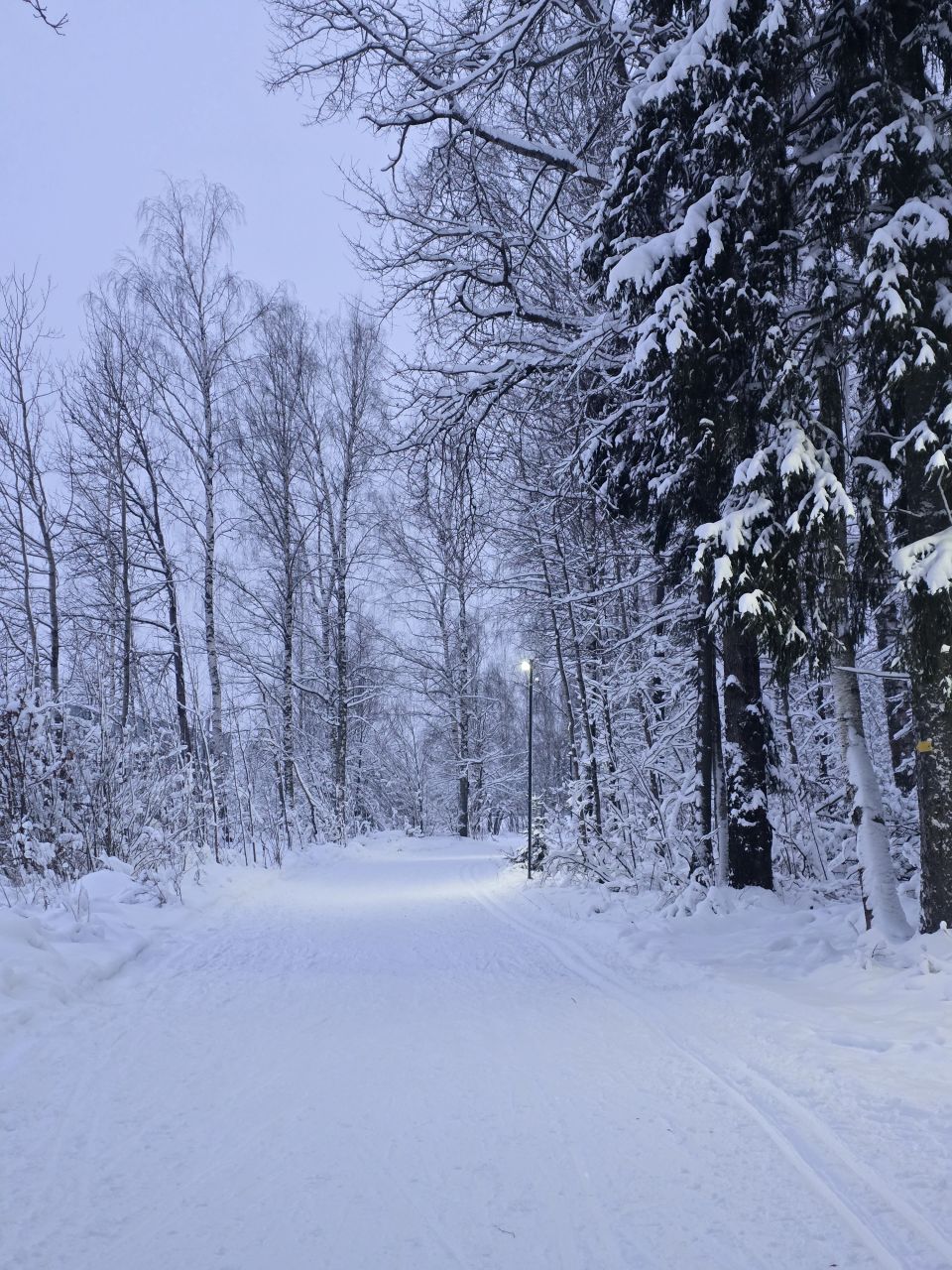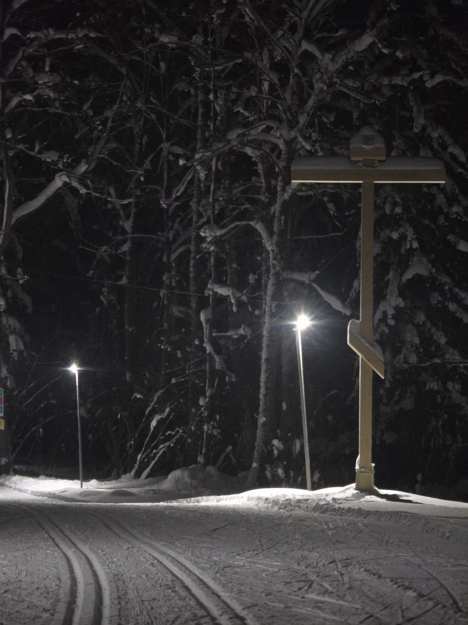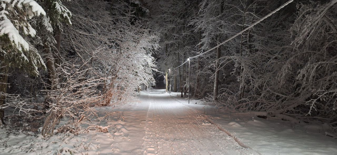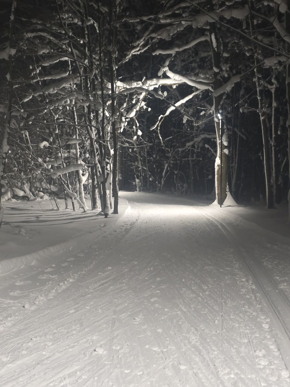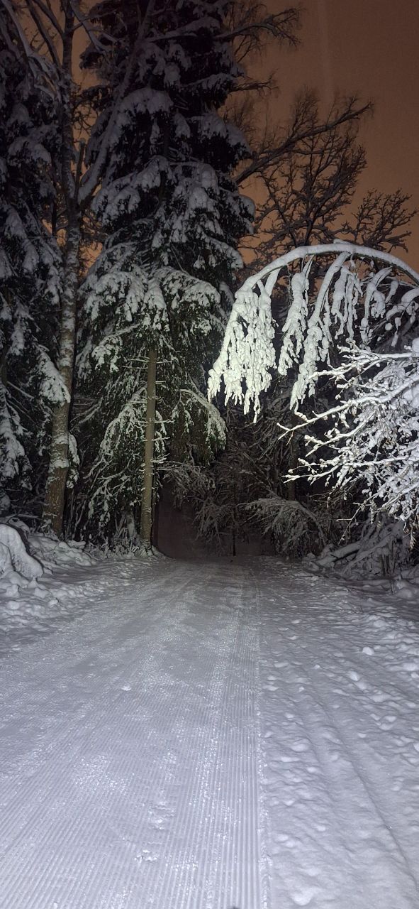 В остальном всё нормально. Мусора никакого не видел, точно можно на хороших лыжах. В свете фонарей зимний лес очень красивый