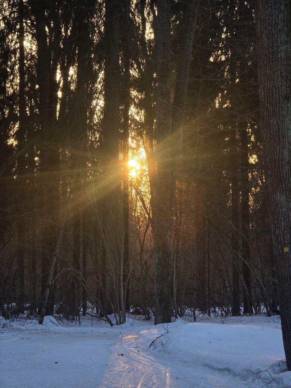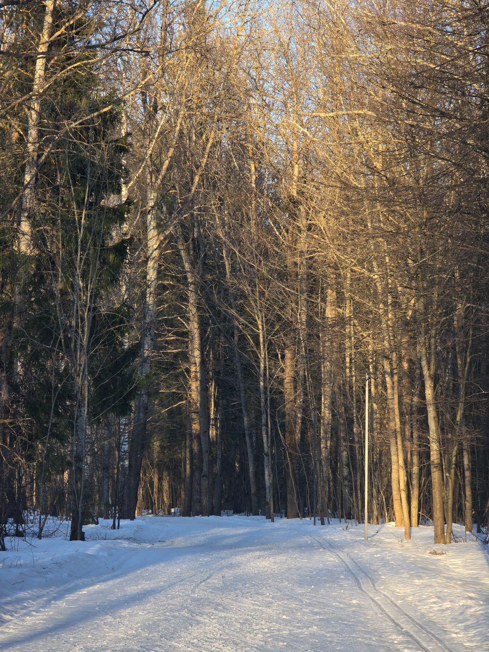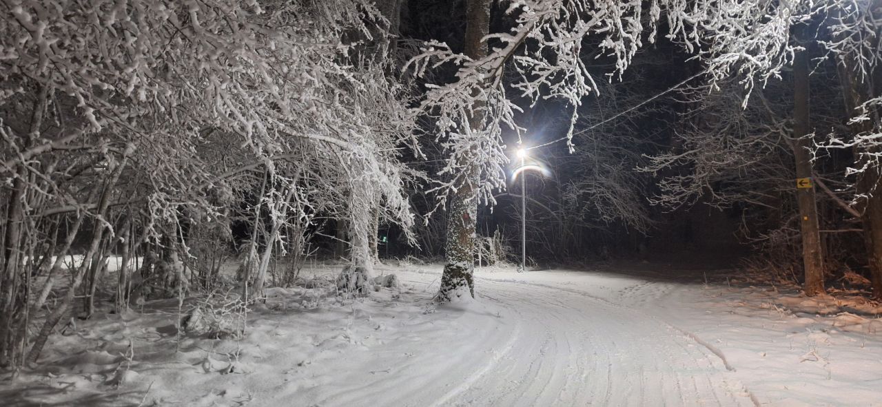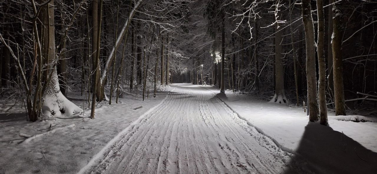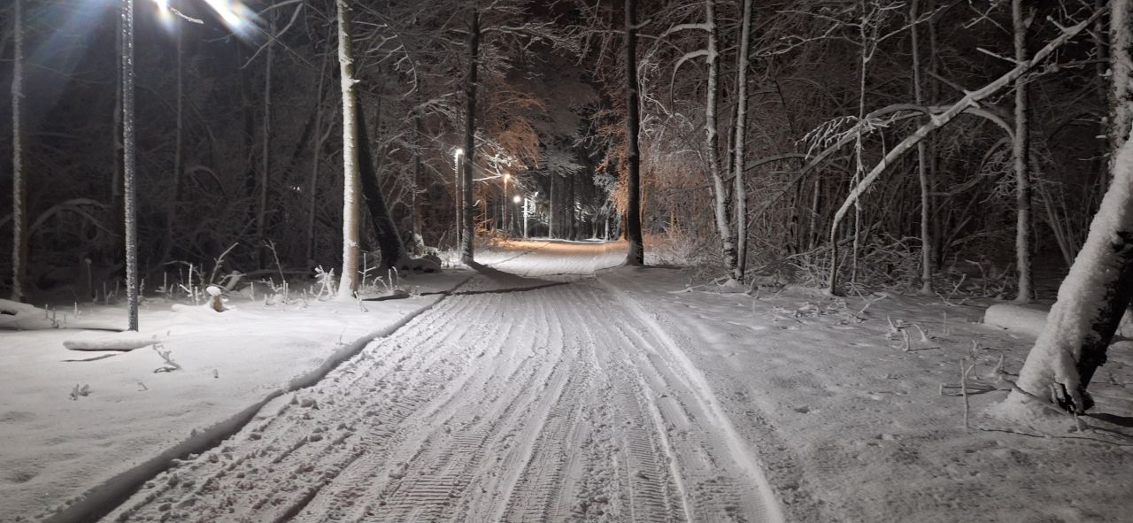 В остальном всё нормально. Мусора никакого не видел, точно можно на хороших лыжах. В свете фонарей зимний лес очень красивый