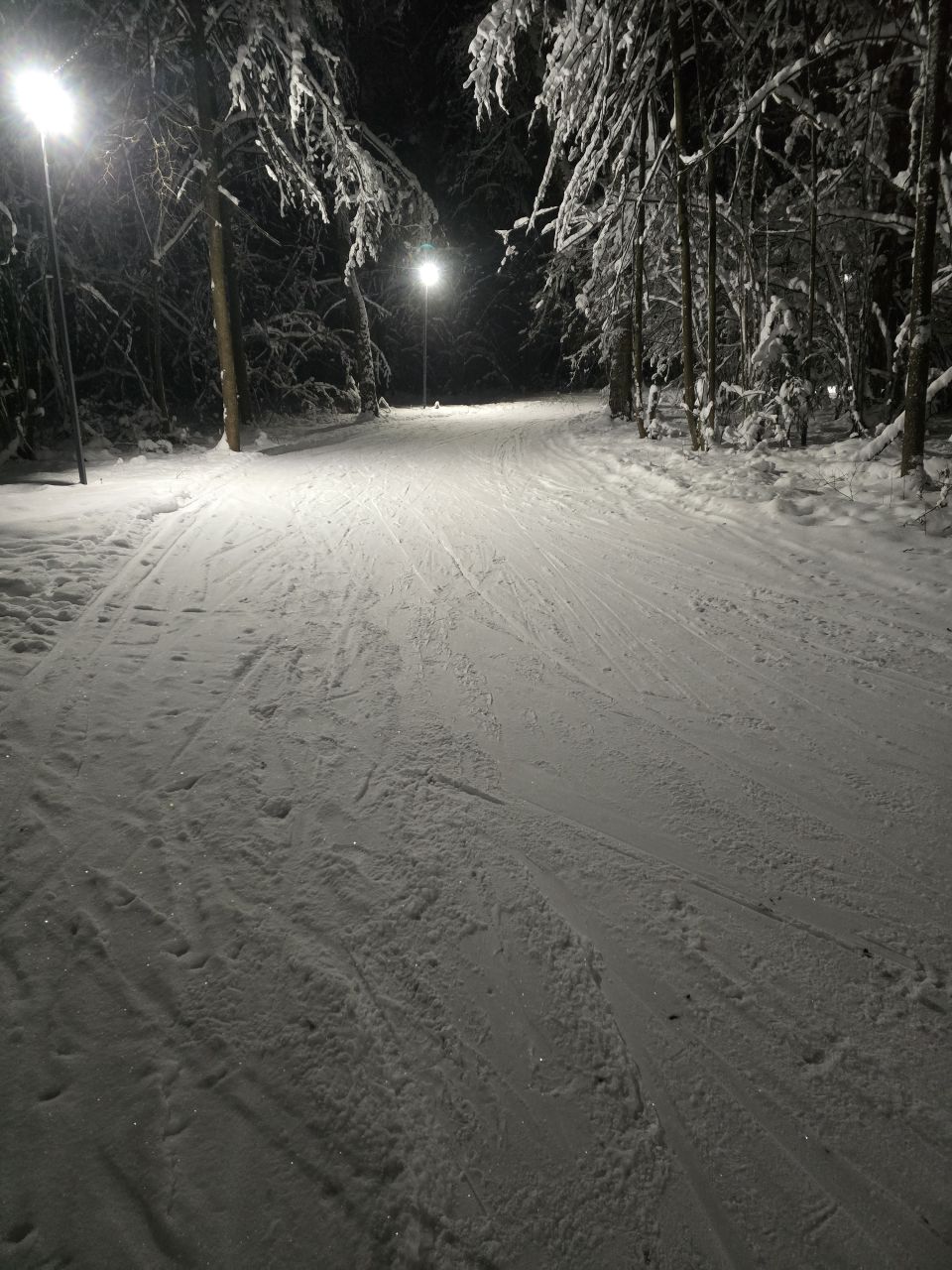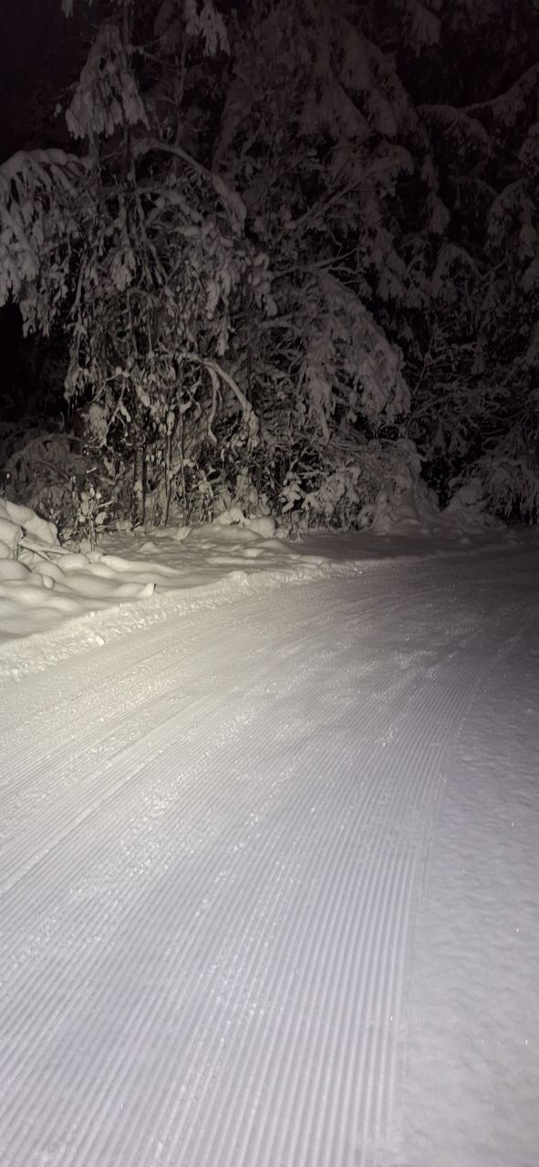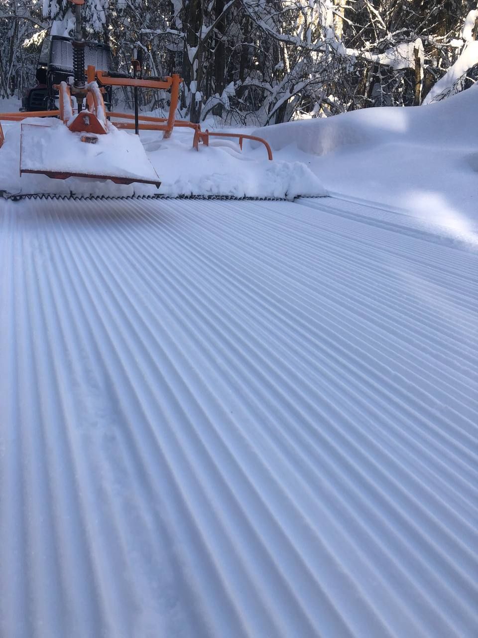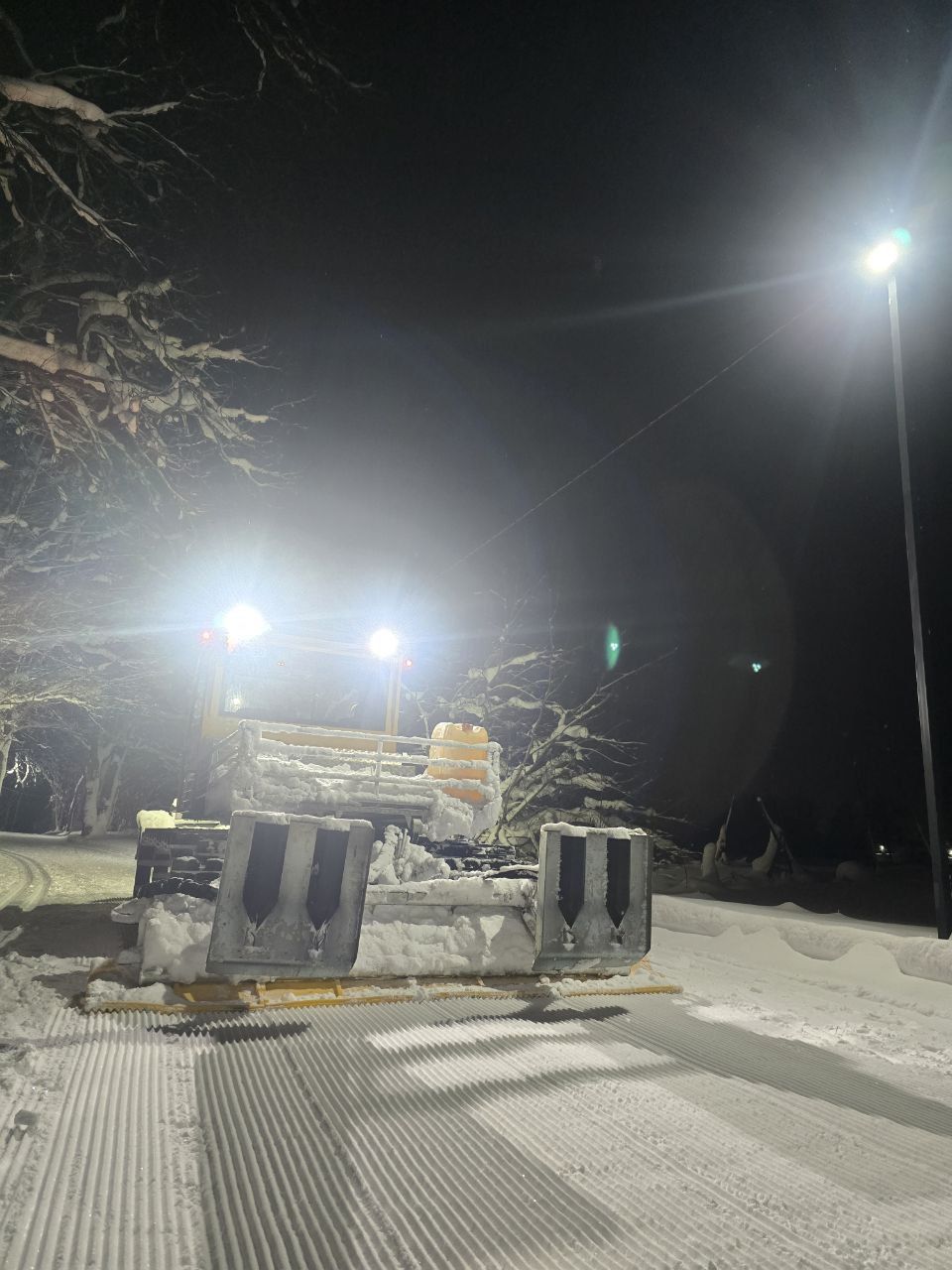 Состояние трассы на 7-20 утра. После ночного снегопада укатан прицепным устройством весь освещенный 3 км круг. Если прогнозы сбудуться, то к ночи начнем готовить вельвет.