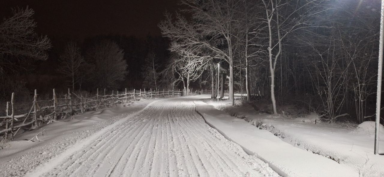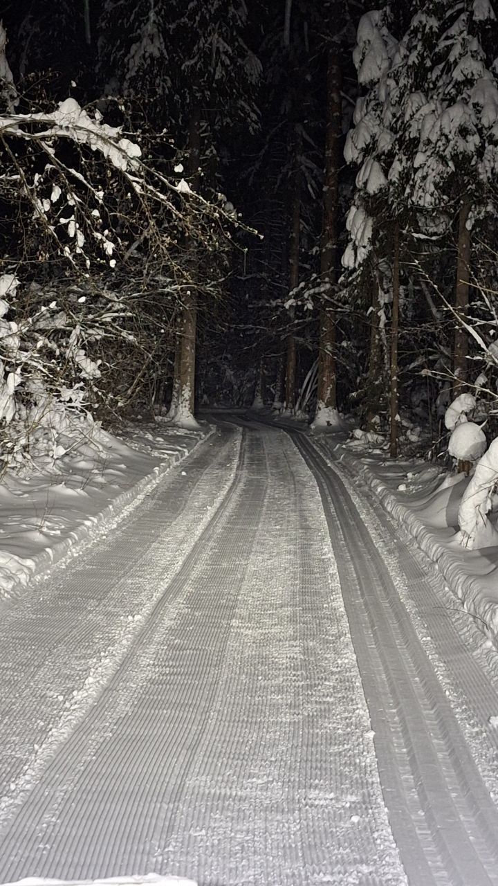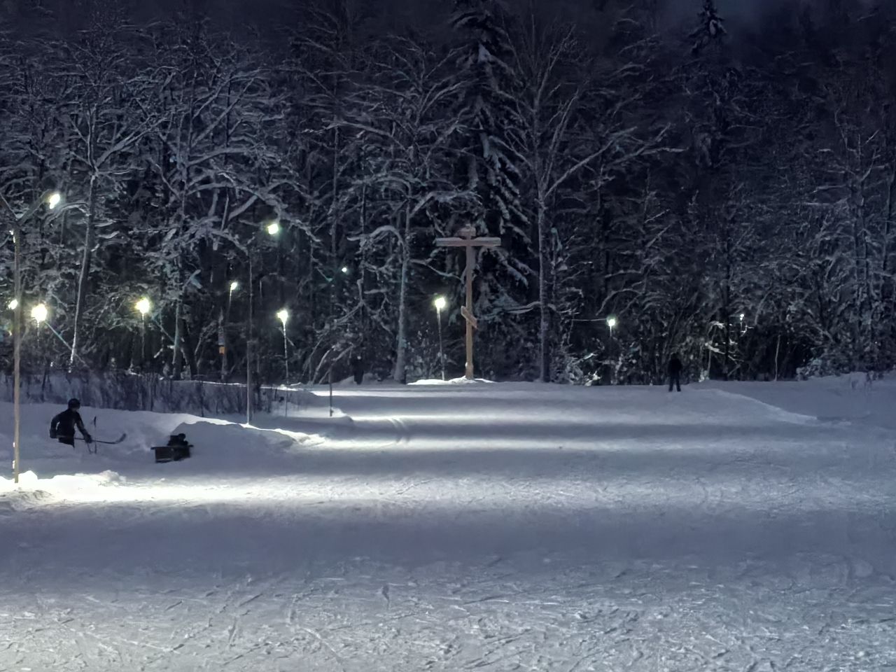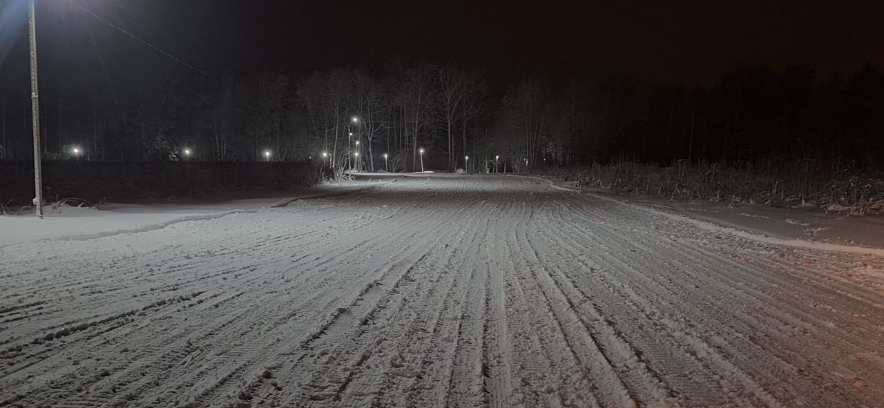 Состояние трассы на 7-20 утра. После ночного снегопада укатан прицепным устройством весь освещенный 3 км круг. Если прогнозы сбудуться, то к ночи начнем готовить вельвет.