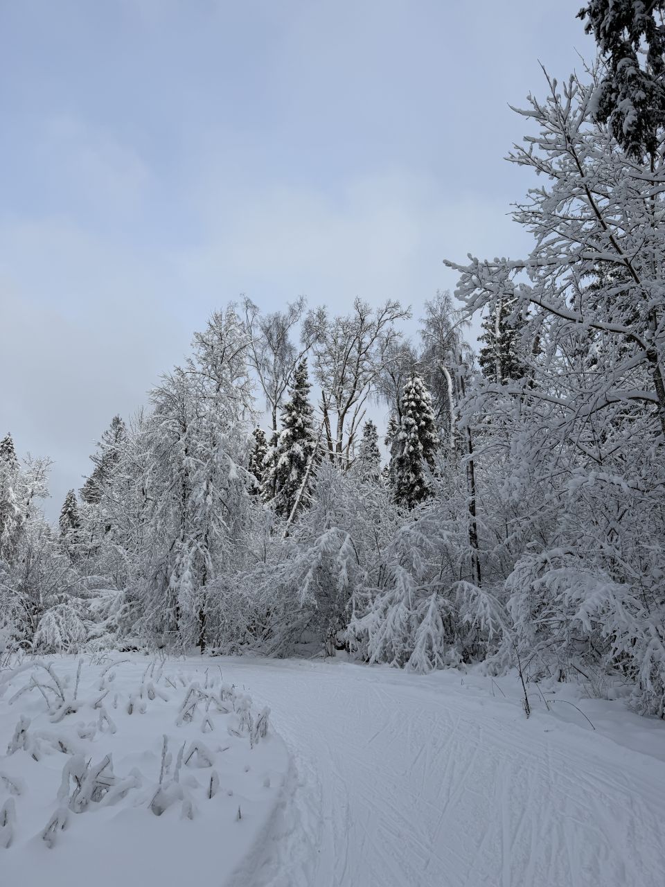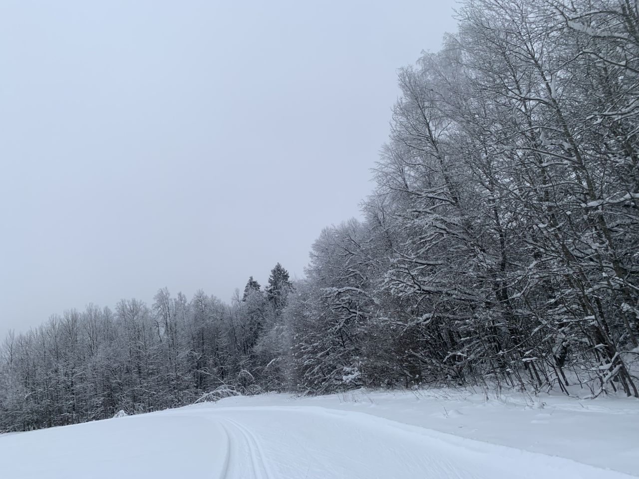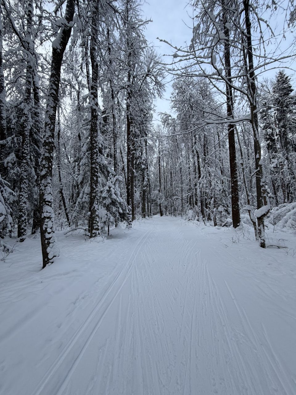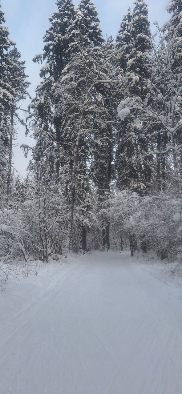 Трасса в хорошем состоянии, в лесу очень красиво😍 много снега, деревья словно окутаны белым пухом❄️