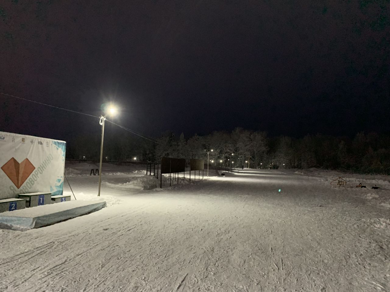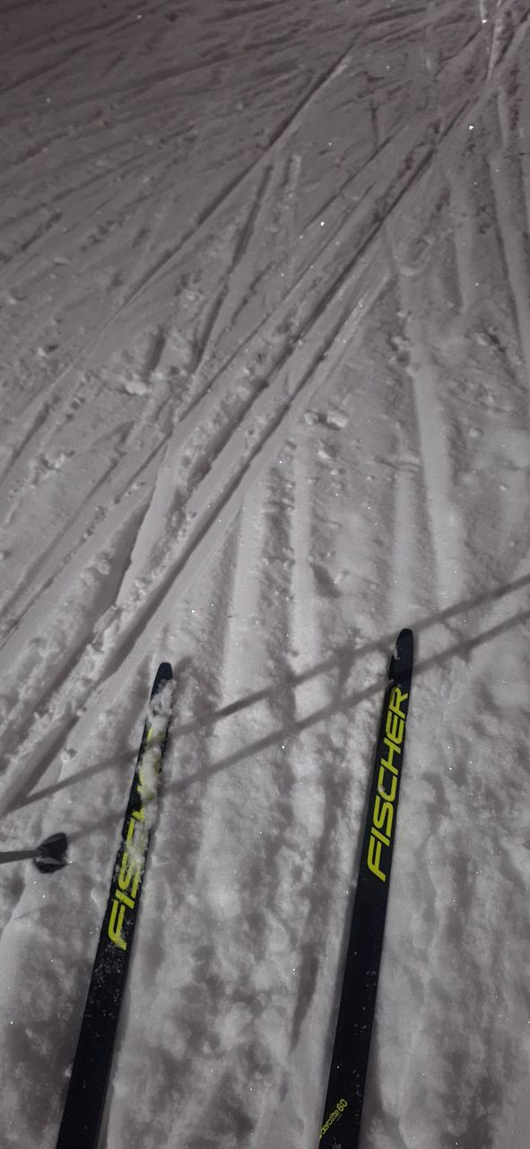 Сегодня с товарищем открыли лыжный сезон на лыжной трассе «Нововоронино». Вышли после 18:30, катали на освещенном 2 км круге. Снега пока не очень много, на асфальтовых вполне можно катать. Вероятно, в светлое время лучше катать по полям, там трава.