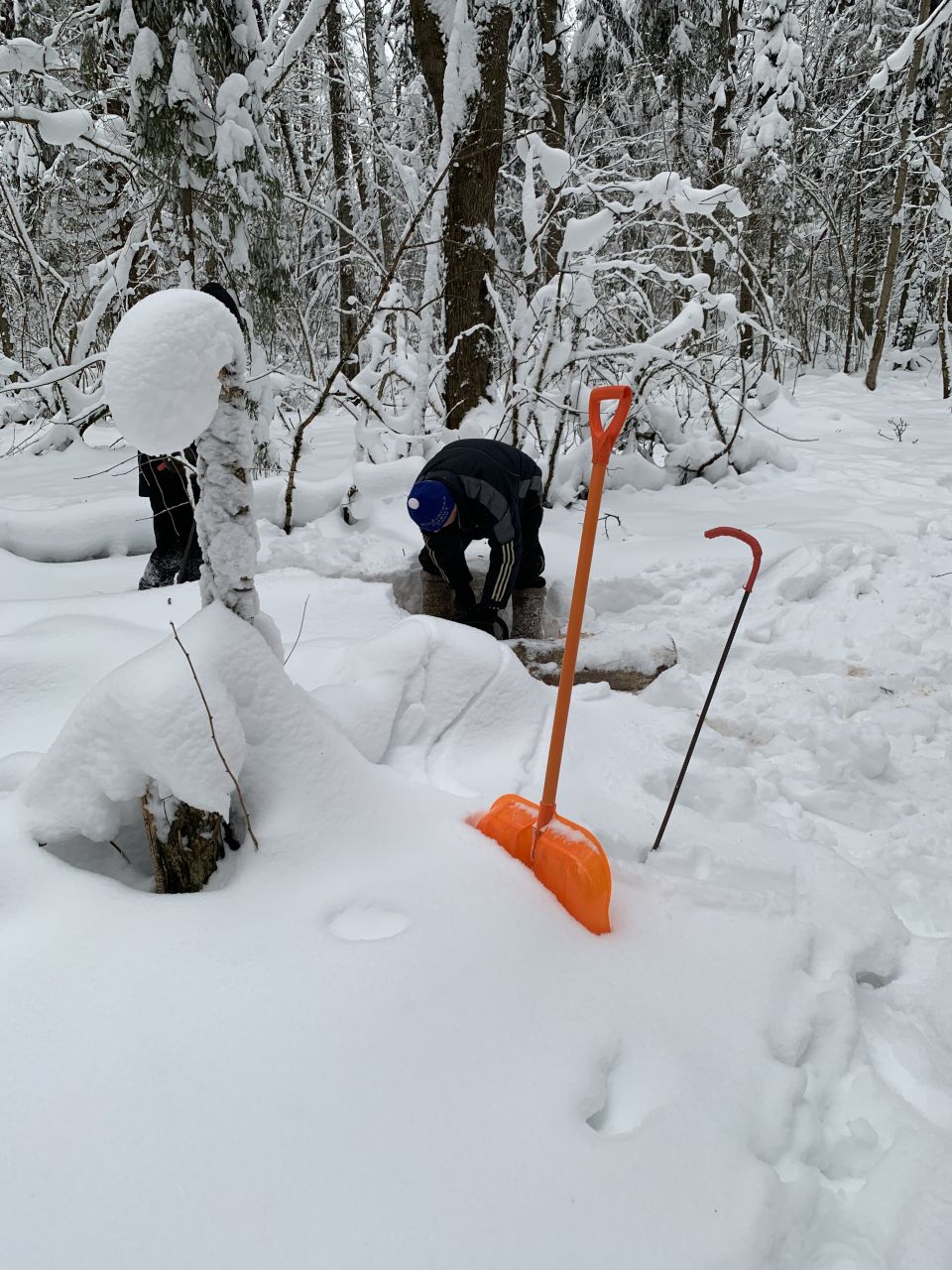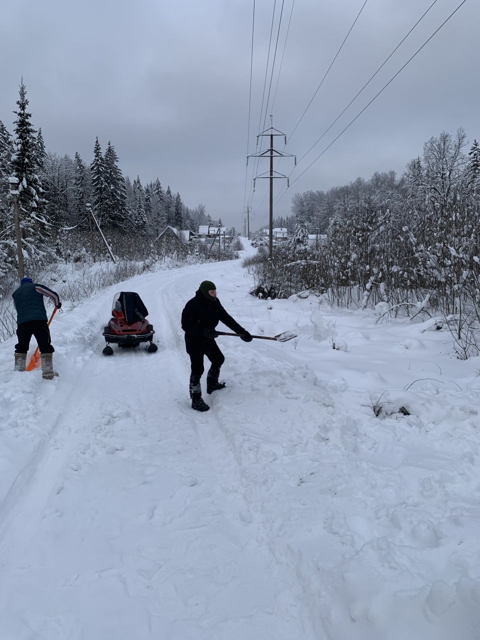 Выезд со стоянки в сторону гаражей дополнительно прочистили лопатами, проблемное место заложили досками 50 мм. Проехать возможно на любой машине. Выглянуло солнце. Прошел небольшой снежок, около 1-2 см. Планируем приступить к подготовке трассы, 8 км лесной круг, ГАБОшей.