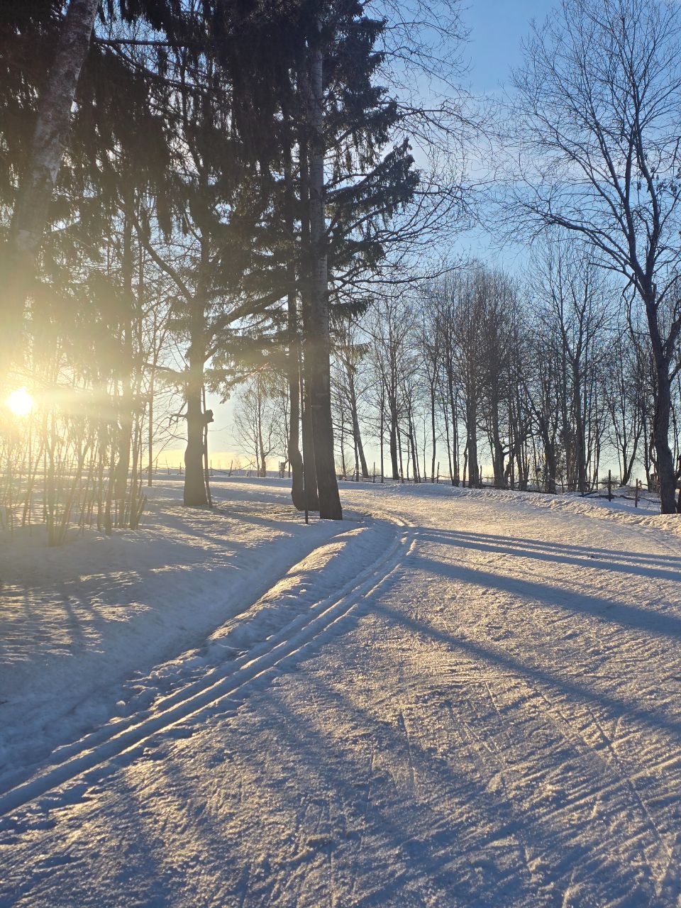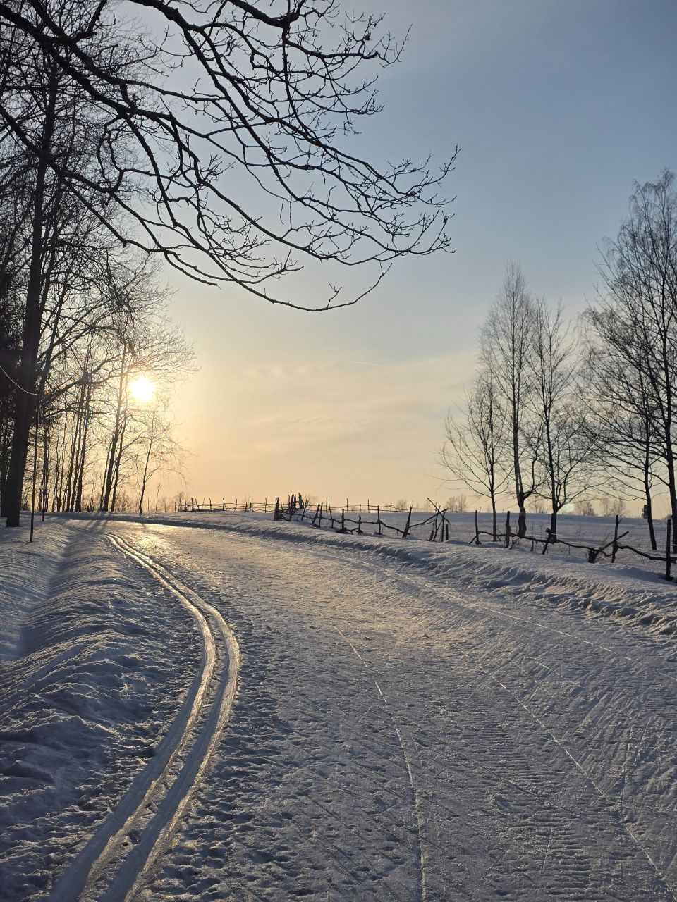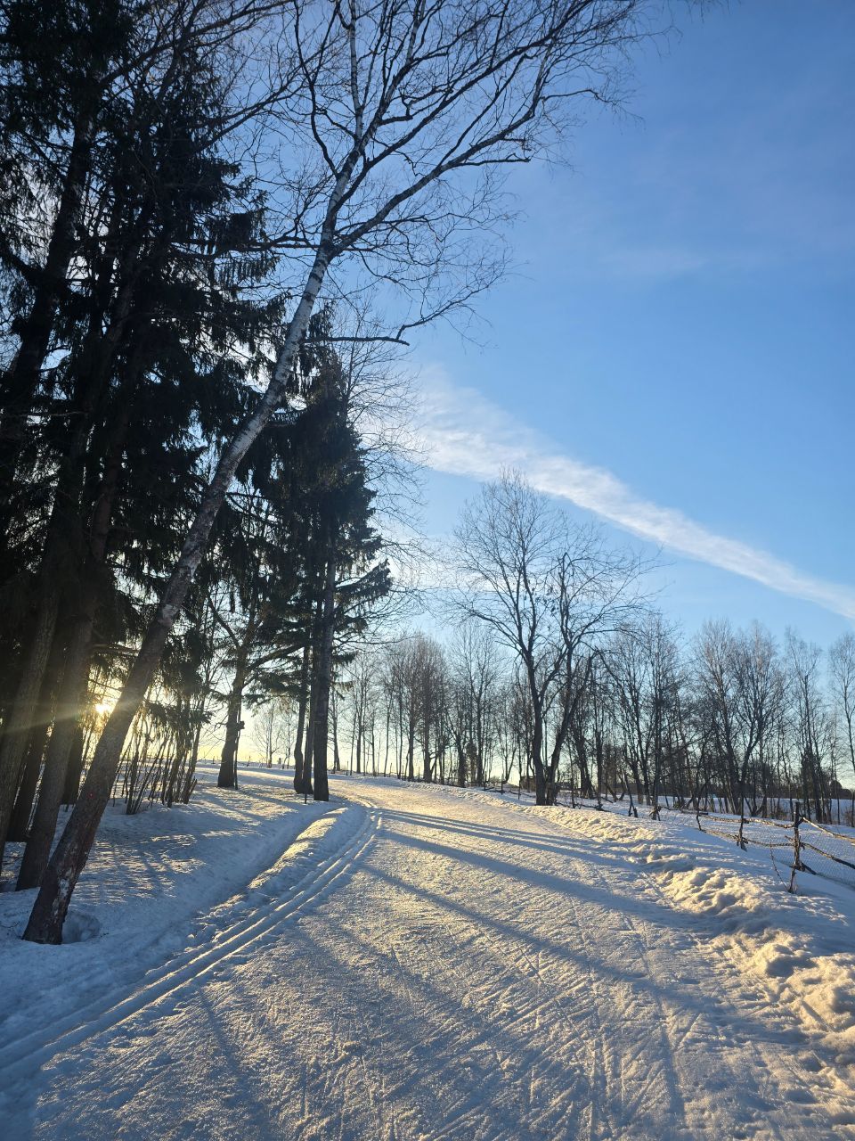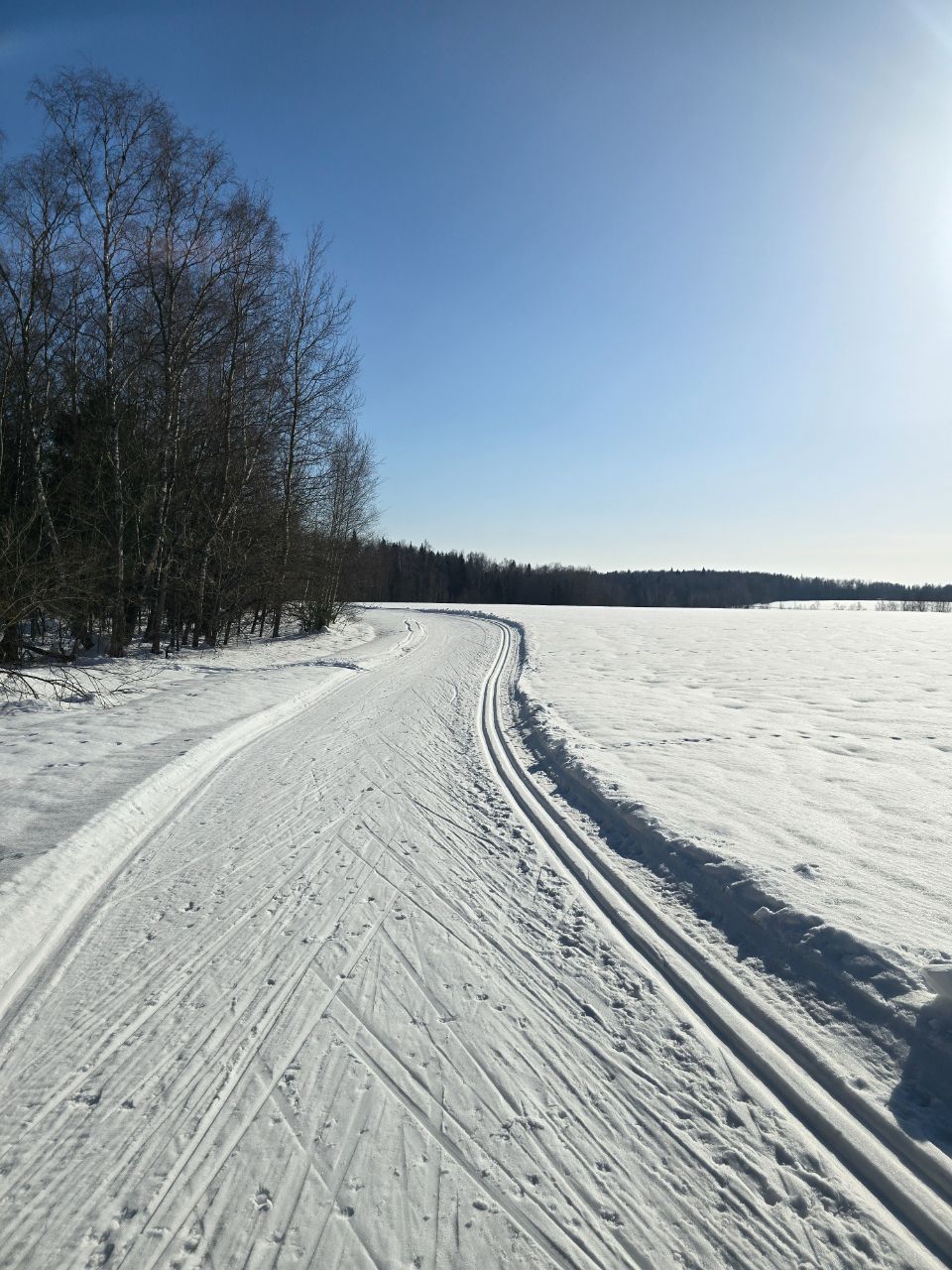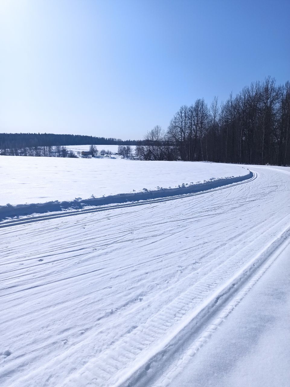 Доброе утро! Вчера, когда основная часть лыжников покатались, мы прошли техничкой и обновили трассу по круку: 2км, третий мост, поворот на 5км, третье, второе и первое поле.