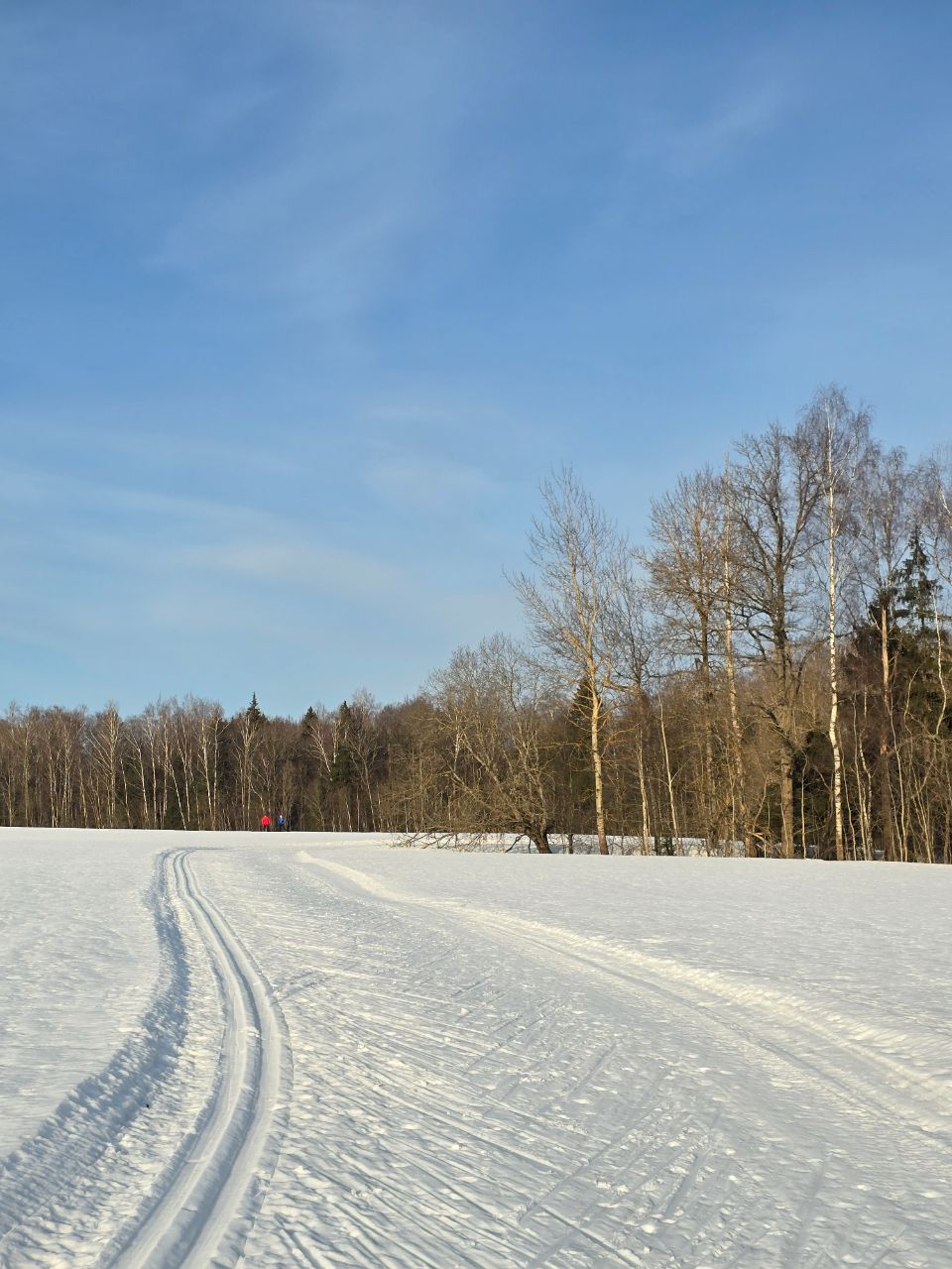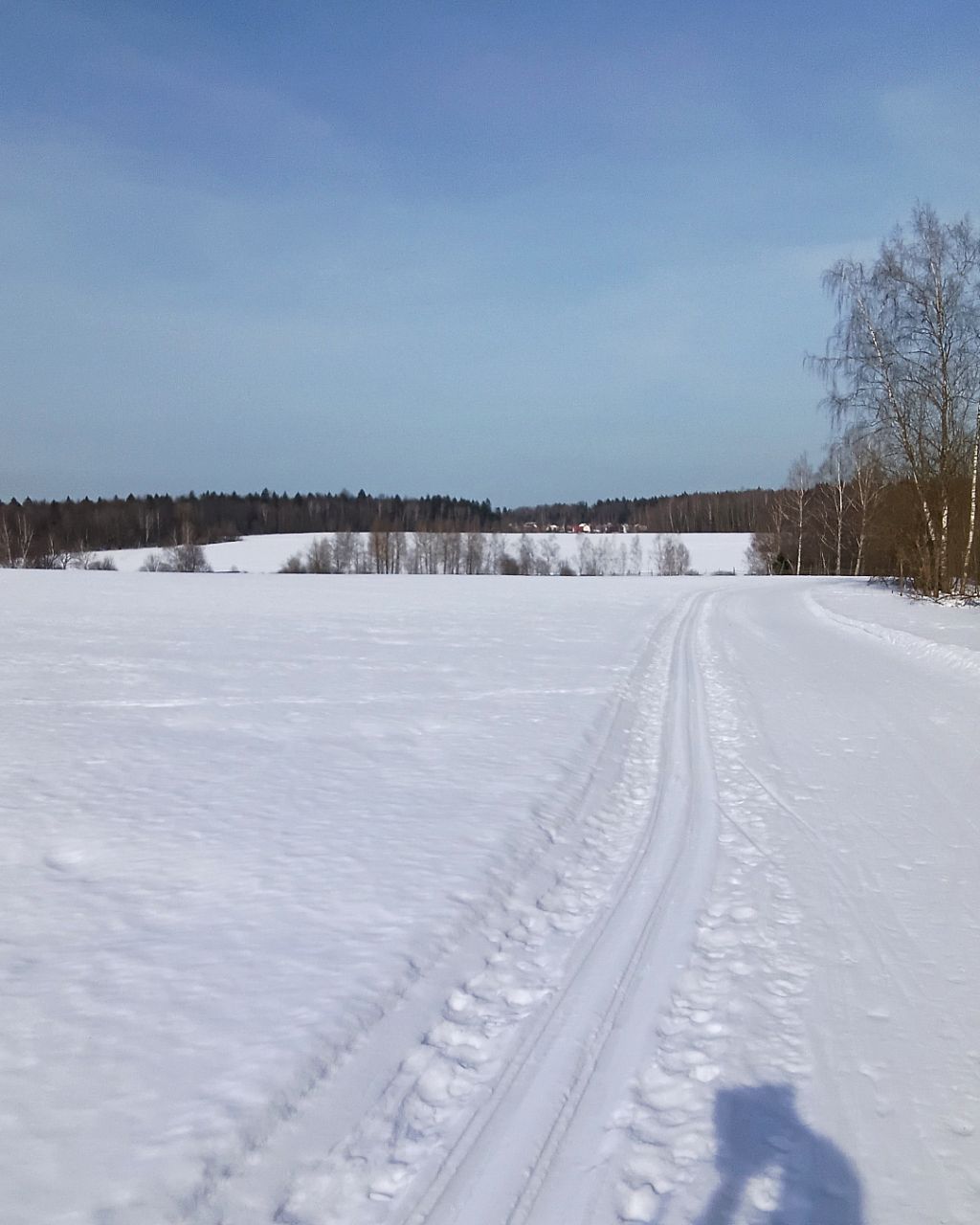 Проехал весь круг 14 км . В лесу есть несколько мест где приходится переходить на шаг. В лесной части более комфортный маршрут без первых двух мостов и дальней петли. Здесь проходил ратрак. Все три поля сверкаю на солнце . Основа плотная . Лыжников итого. Кое кто ходит по полям классикой . В нововоронино сезон продолжается на радость лыжникам.