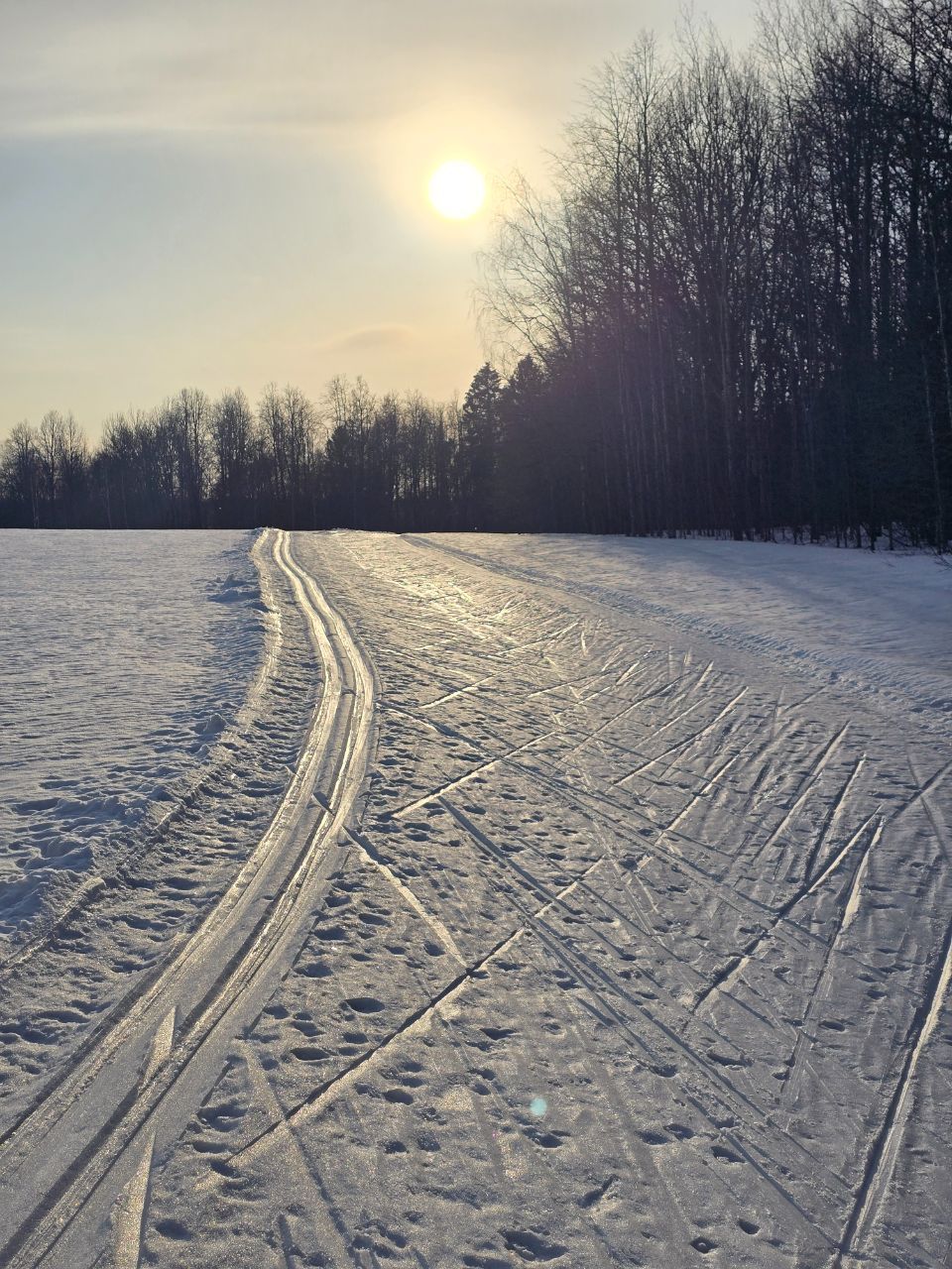 Круг 2км накатан хорошо, круг 5 км немного похуже, на поля не заезжал но видны следы от снегохода, есть неровности, но кататься очень даже хорошо, можно на боевых лыжах без проблем
