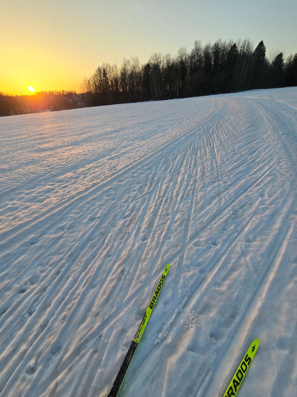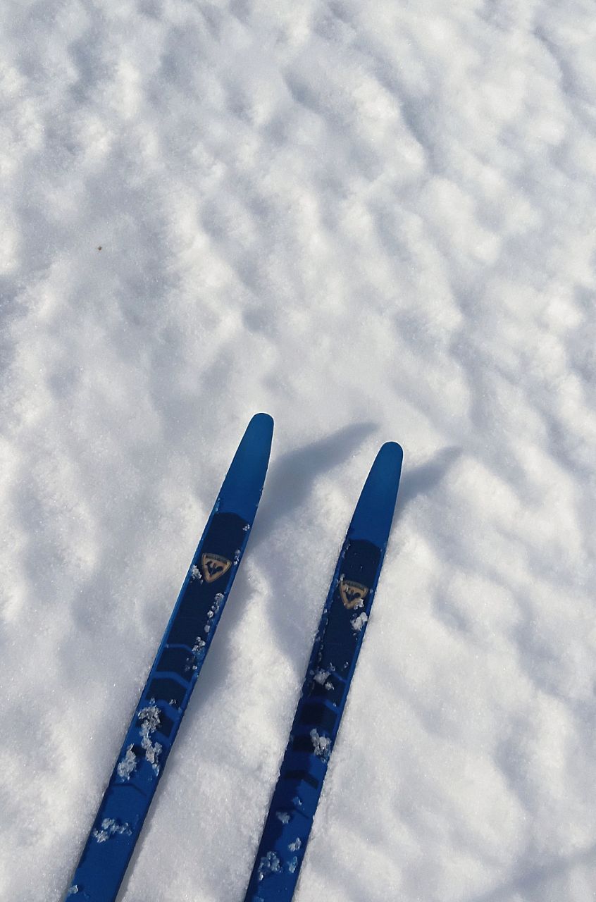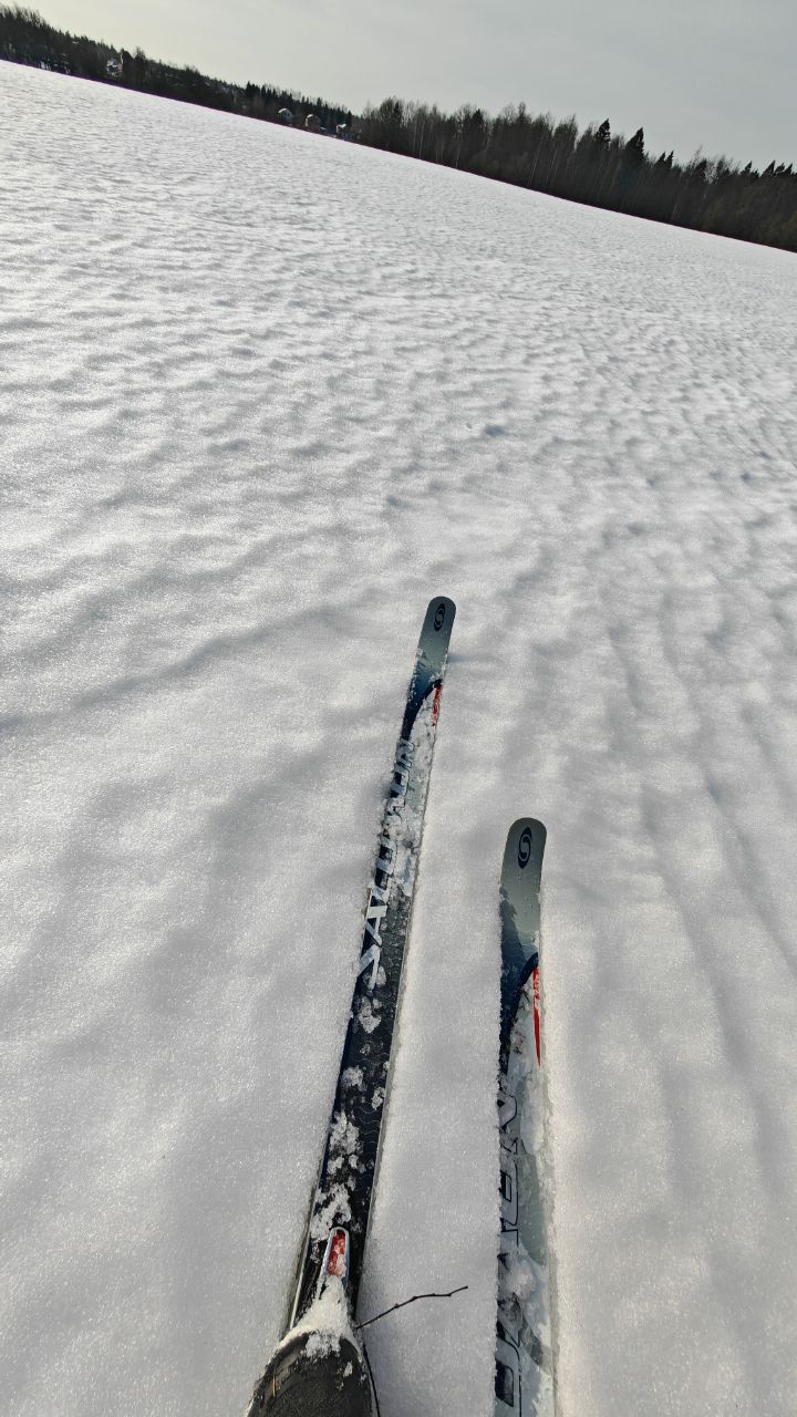 А в целом, получилось отличное катание с 16 до 18, сегодня ещё ветерок подсушивал немного поля, было мягко, но скольжение приемлемое. Даже палки с узкой лапкой не проваливались.